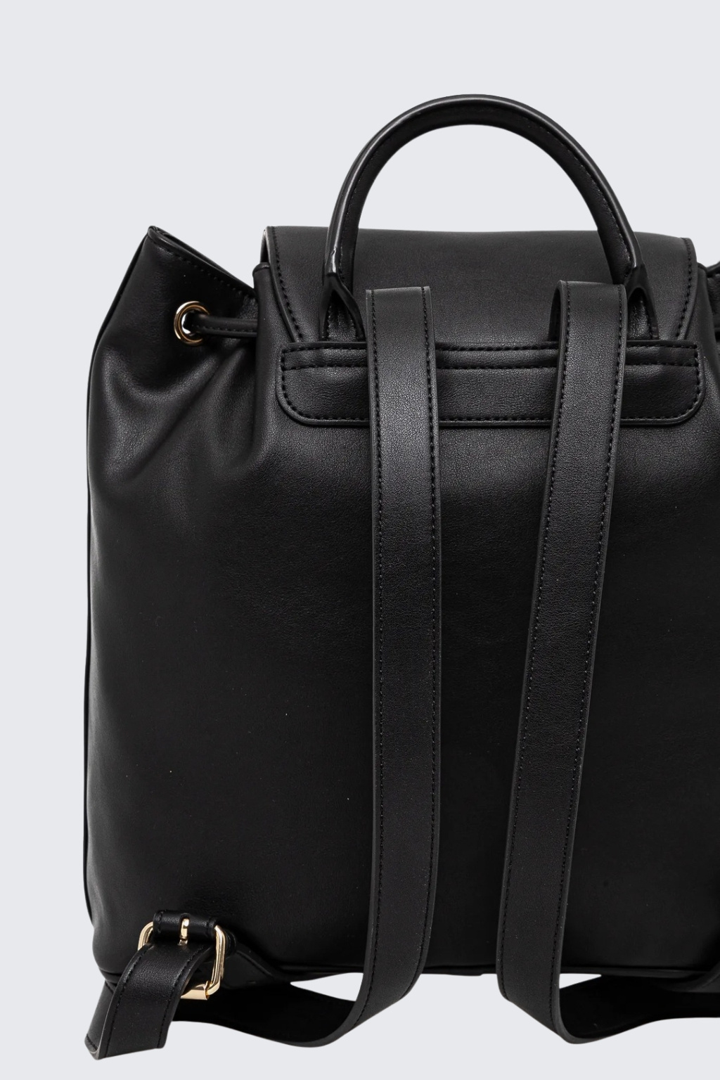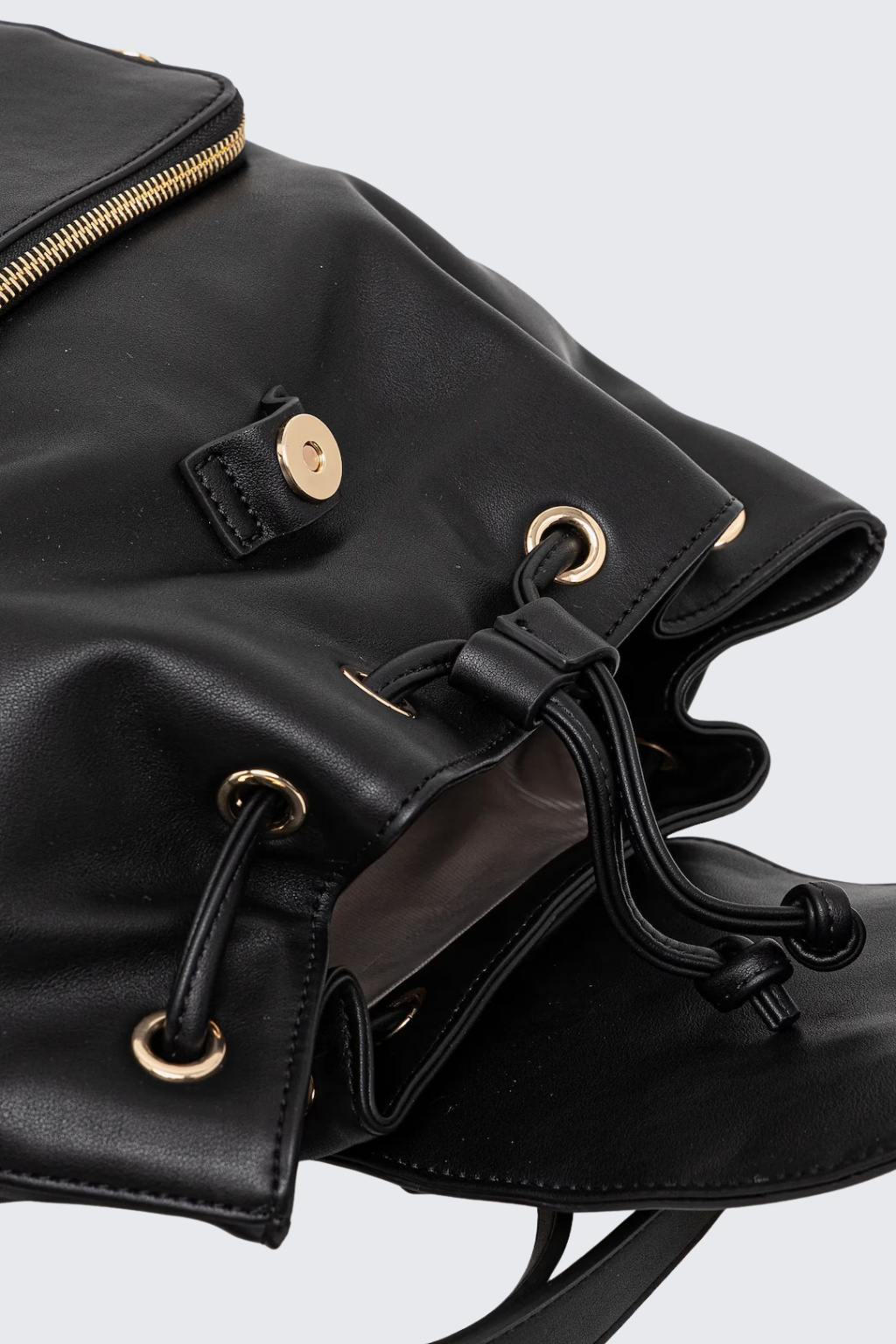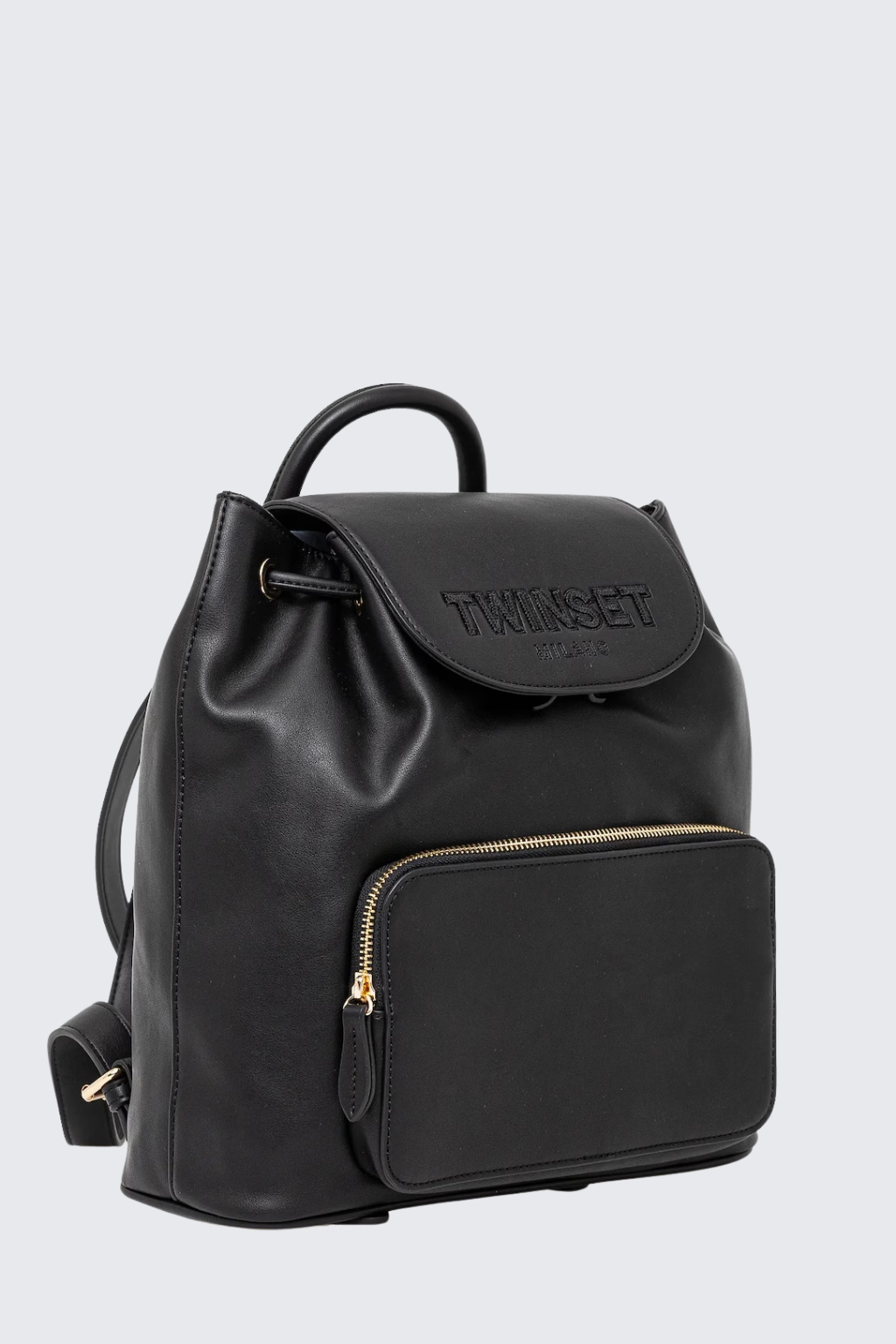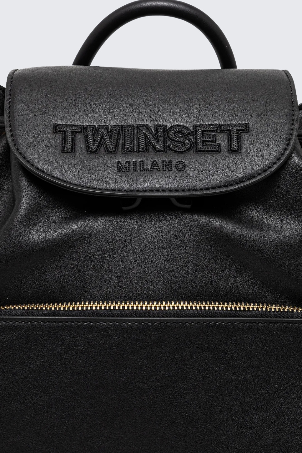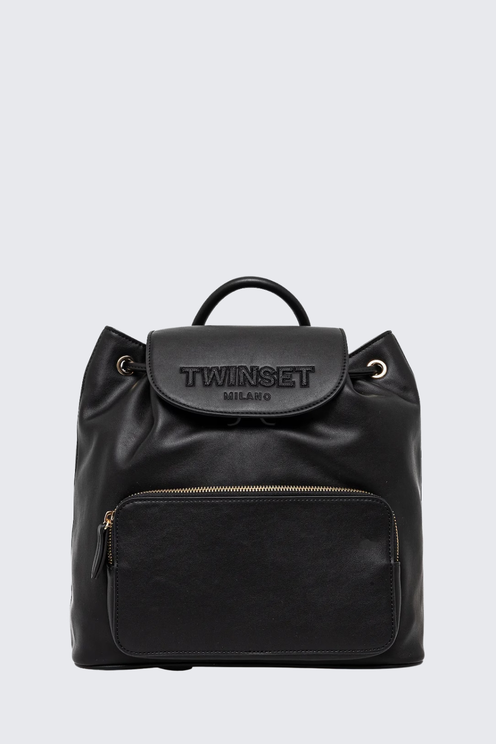 Dámský batoh z kolekce Twinset. Model je vyroben z ekologické kůže, model je jednokomorový se stahovací šňůrkou. Na horní straně je magnetická klopa s nápisem značky TWINSET. Model má na přední straně menší kapsu se zapínáním na zip. Uvnitř jsou dvě kapsy, jedna na zip a druhá zasouvací. Má jedno krátké ucha a dva ramenní popruhy s nastavitelnou délkou. Rozměry batohu jsou 30 x 30 x 12 cm.