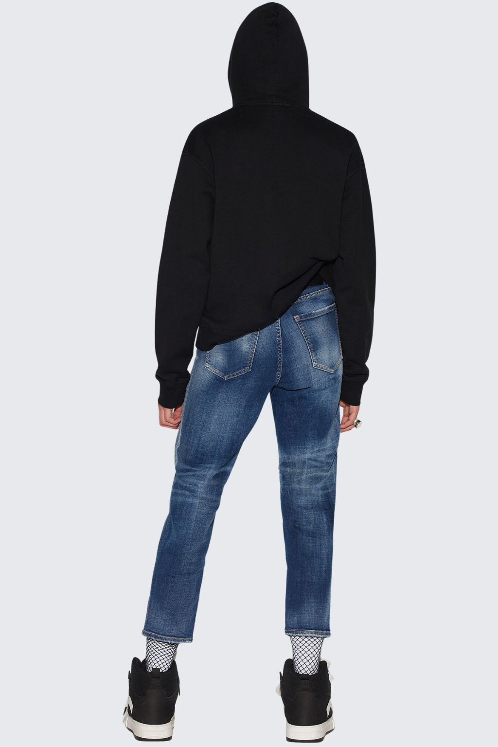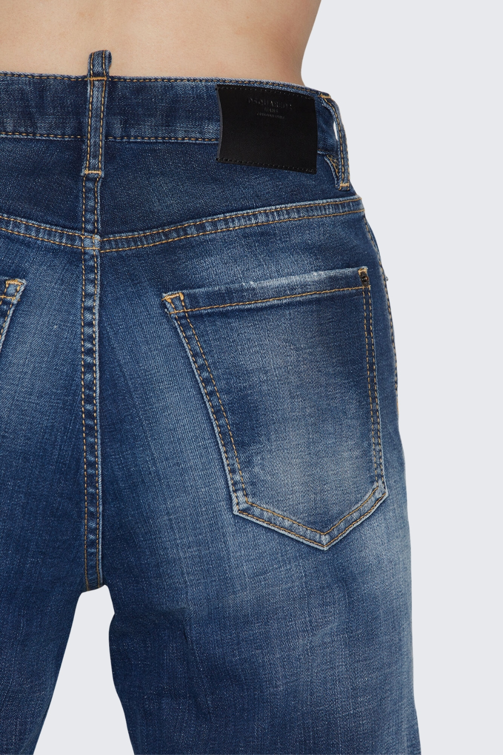 Dámské džíny jsou se středním pasem a rovného střihu. Kalhoty mají mají prošívání kontrastní nití. Model má pět kapes, tři na přední straně a dvě zezadu. V pase jsou poutka na opasek, zapínání na zip a knoflík. U předního zapínání je červený štítek s logem Dsquared2. Na zadní straně je našitý kožený černý štítek s logem Dsquared2. Typ džín je BOSTON.