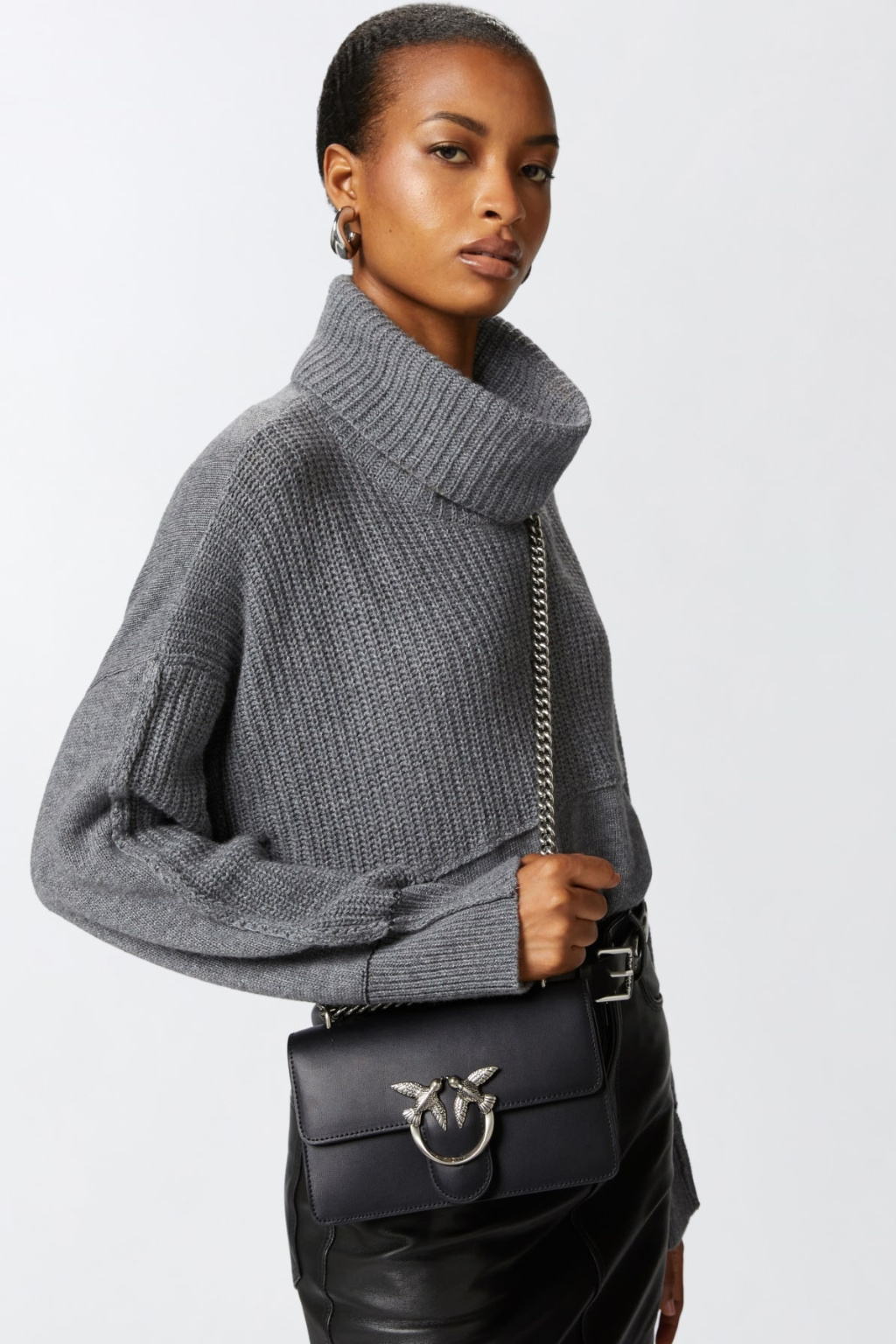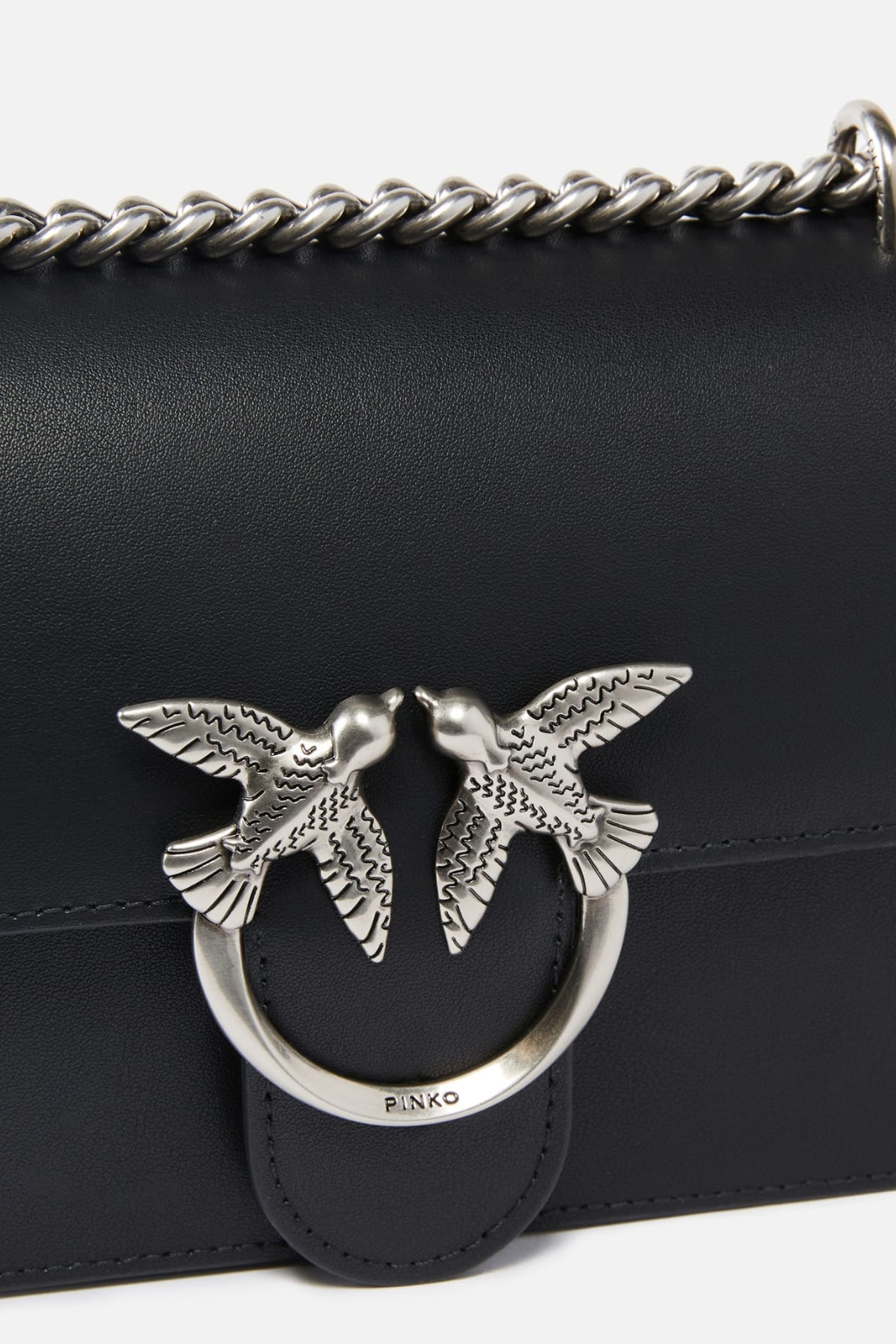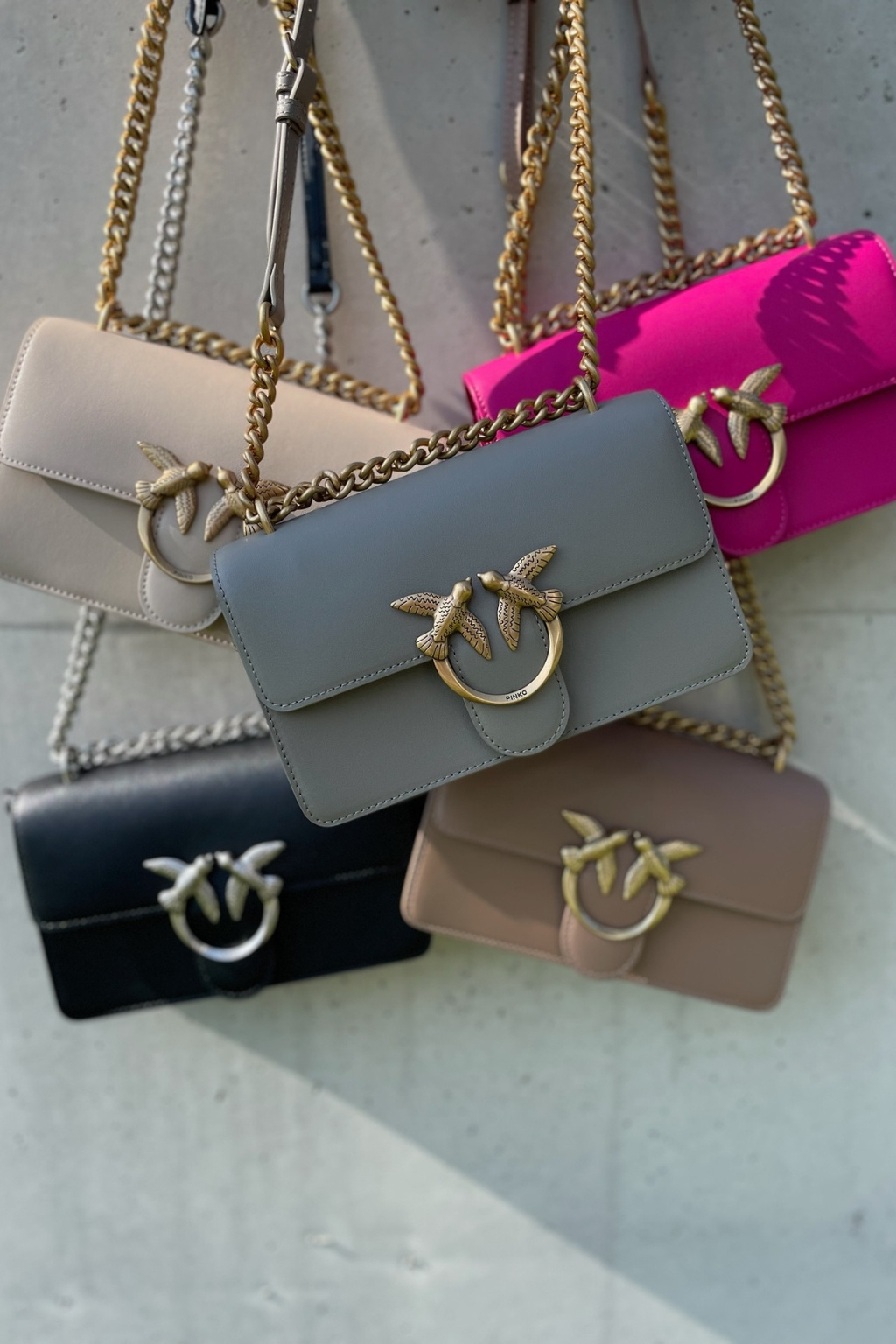 Kabelka je menší velikosti a má dlouhý popruh kombinovaný ze stříbrné řetízkové části a kožené části. Na přední straně je větší kovové stříbrné logo PINKO LOVE BIRDS. Kabelka má zapínání s klopou na magnet. Uvnitř jsou jsou dvě hlavní přihrádky a mezi nimi jedna menší na zip. Kabelku je možné nosit jako crossbody nebo klasicky zavěšenou na rameni.