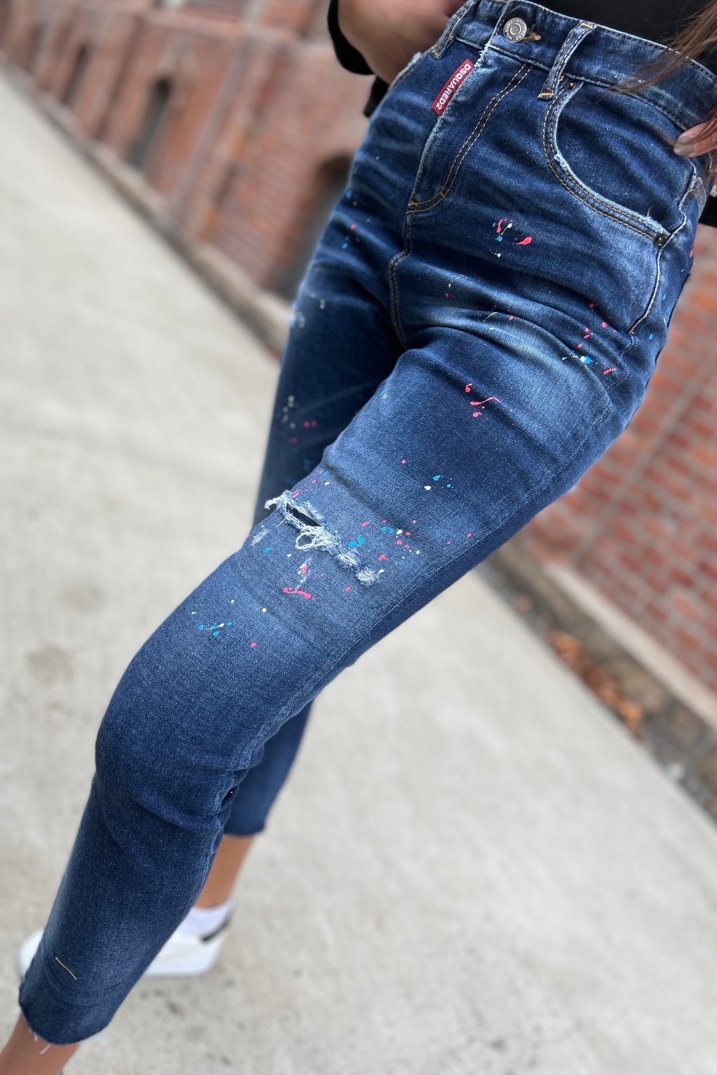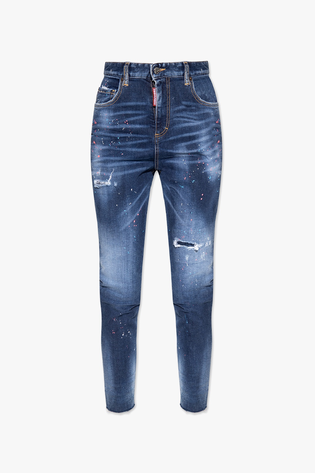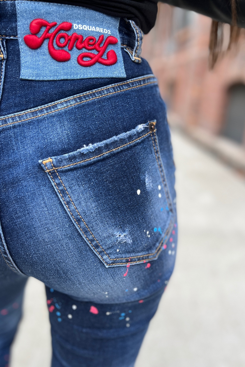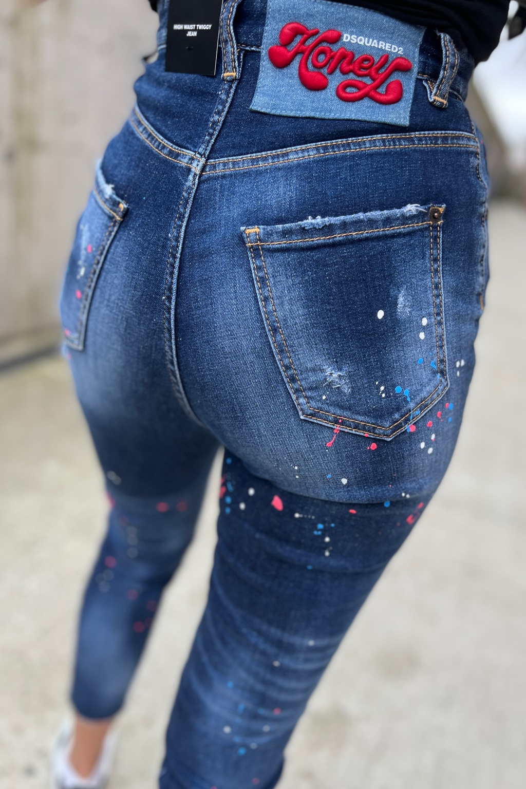 Dámské džíny Dsquared2 z kolekce FW22/23 ve střihu High Waist Twiggy jeans mají přiléhavý střih s vyšším pasem a klasickou délkou nohavic. Zapínání je na knoflík a zip. U zapínání je našitý červený štítek s logem značky. Džínovina je místy zesvětlená a zdobí ji stylové cákance modré, bílé a neonově růžové barvy. S výběrem správné velikosti Vám rádi poradíme, popř. zašleme rozměry konkrétní z nich.