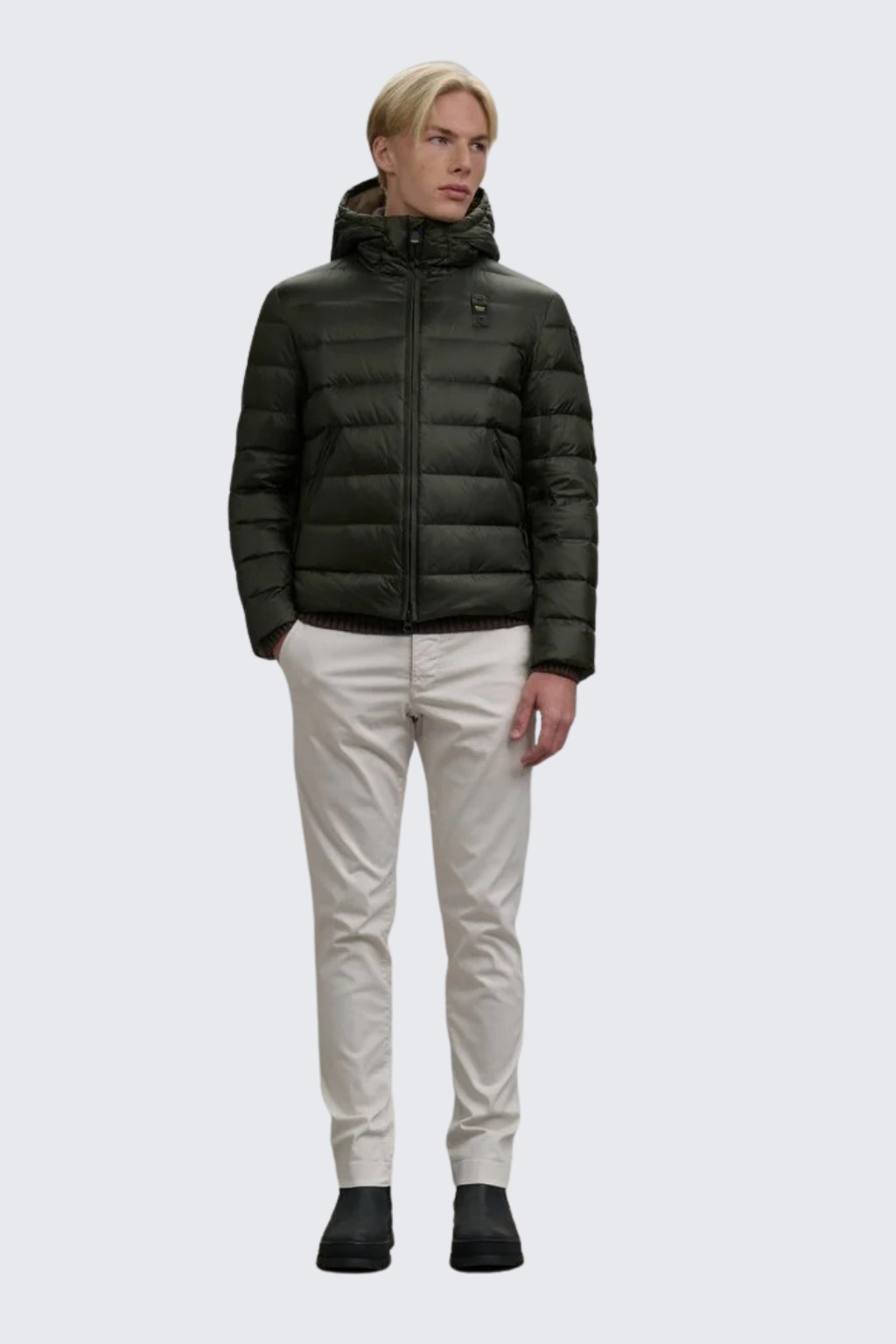 Pánská bunda má standardní délku, vodorovné prošívání a má rovný střih. Bunda má kapuci se stahovací šňůrkou a zapínání je na dvoucestný zip. Po stranách jsou dvě šikmo střižené kapsy na zip. Logo značky je umístěno na levé straně hrudi a na levém rukávu je typický erb s logem BLAUER. Jedná se o fashion kousek, který oživí každý outfit.