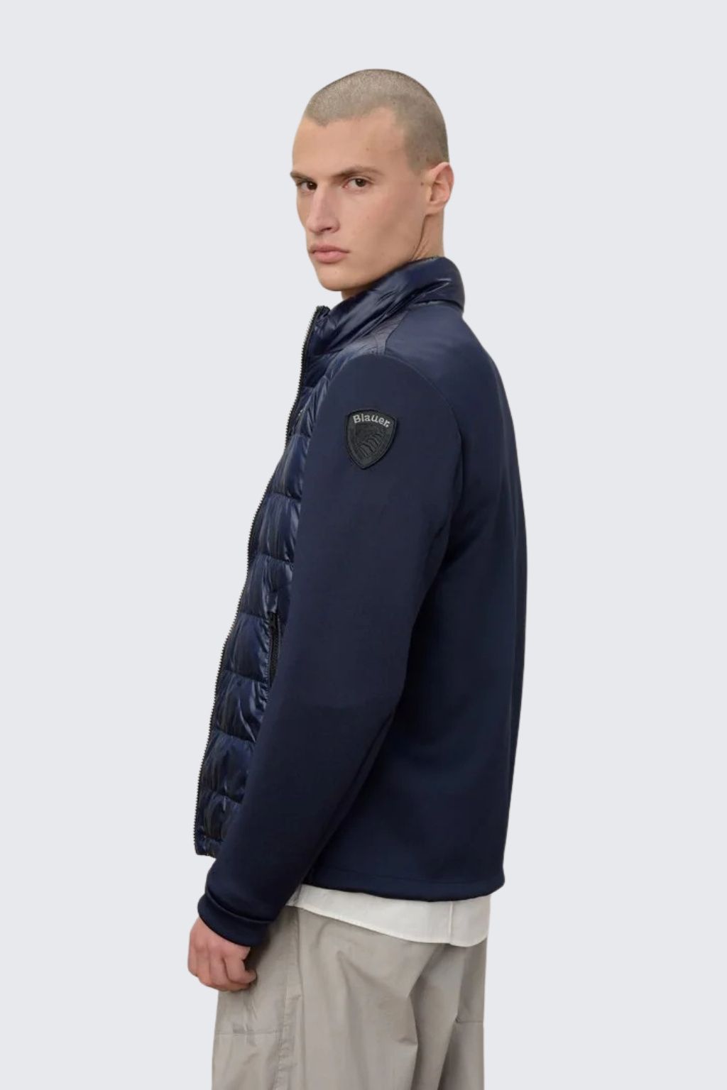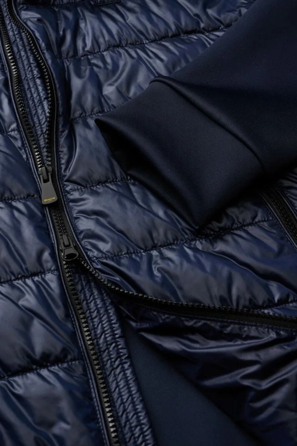 Pánská bunda značky BLAUER je vodorovně prošívaná a má syntetické zateplení. Má standardní délku a přiléhavý střih. Model má dlouhé rukávy s manžetou vespod. Zapínání bundičky je po celé délce na dvoucestný zip, u krku je krátký límeček. Po stranách jsou dvě šikmé kapsy na zip a na hrudi je vlevo doplněný štítek s nápisem značky BLAUER. Na levém rukávu je erb s logem značky.
