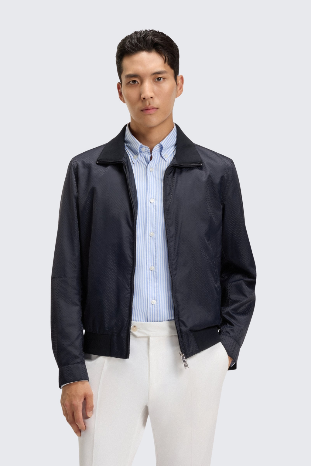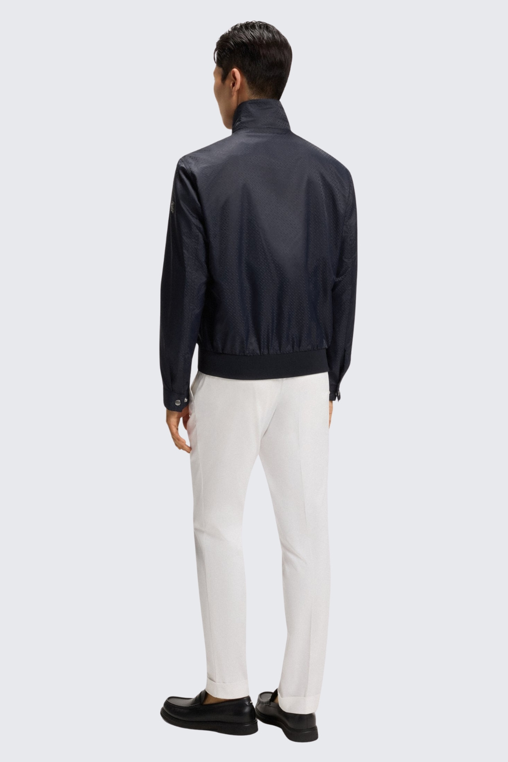 Pánská bunda značky BOSS. Model má kratší délku a dlouhé rukávy. U krku je límeček a zapínání bundy je po celé délce na dvoucestný zip. Spodní lem bundy je zakončený manžetou a na koncích rukávů je lem s druky. Po stranách jsou dvě šikmé kapsy a na levém rukávu je doplněno logo značky BOSS.