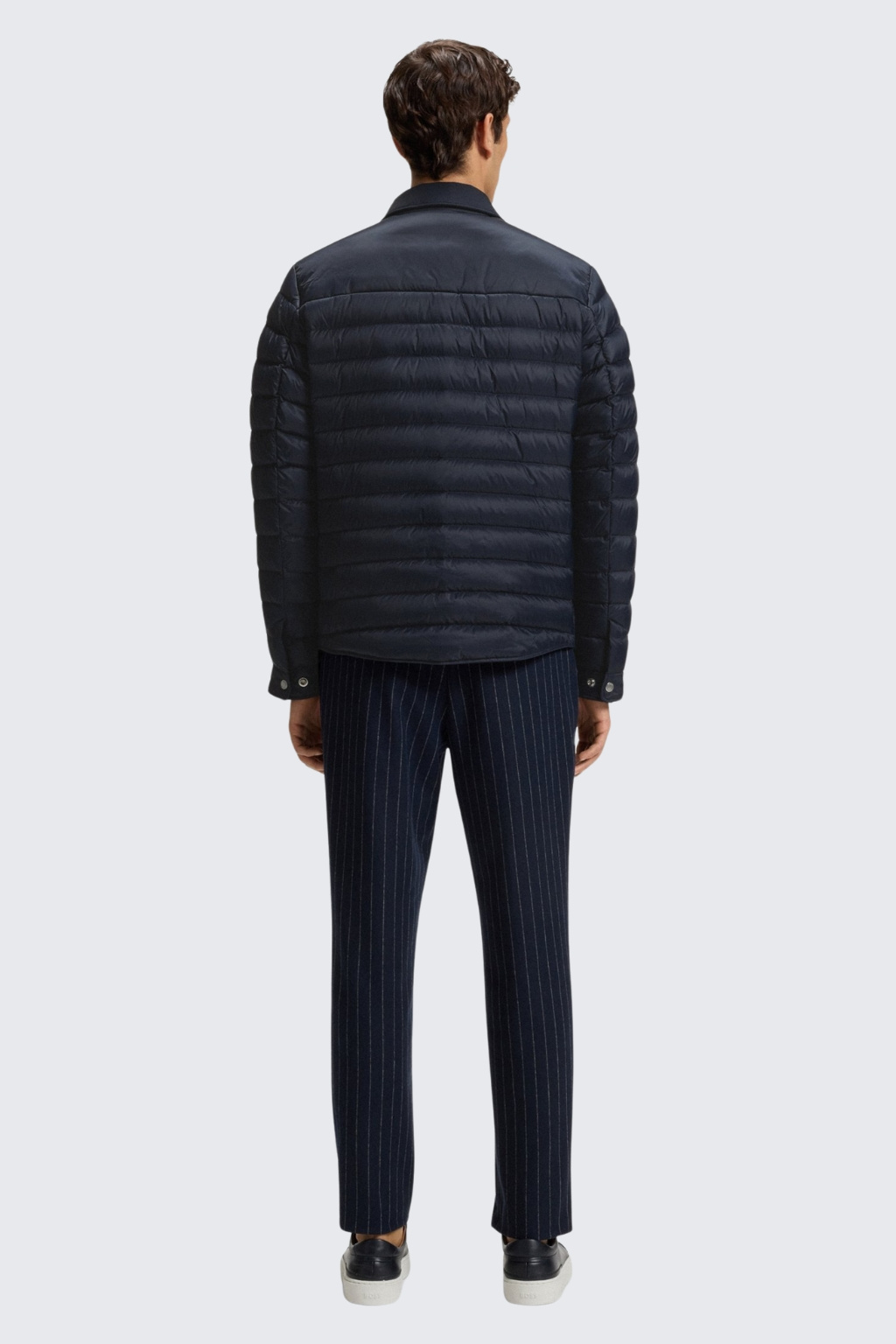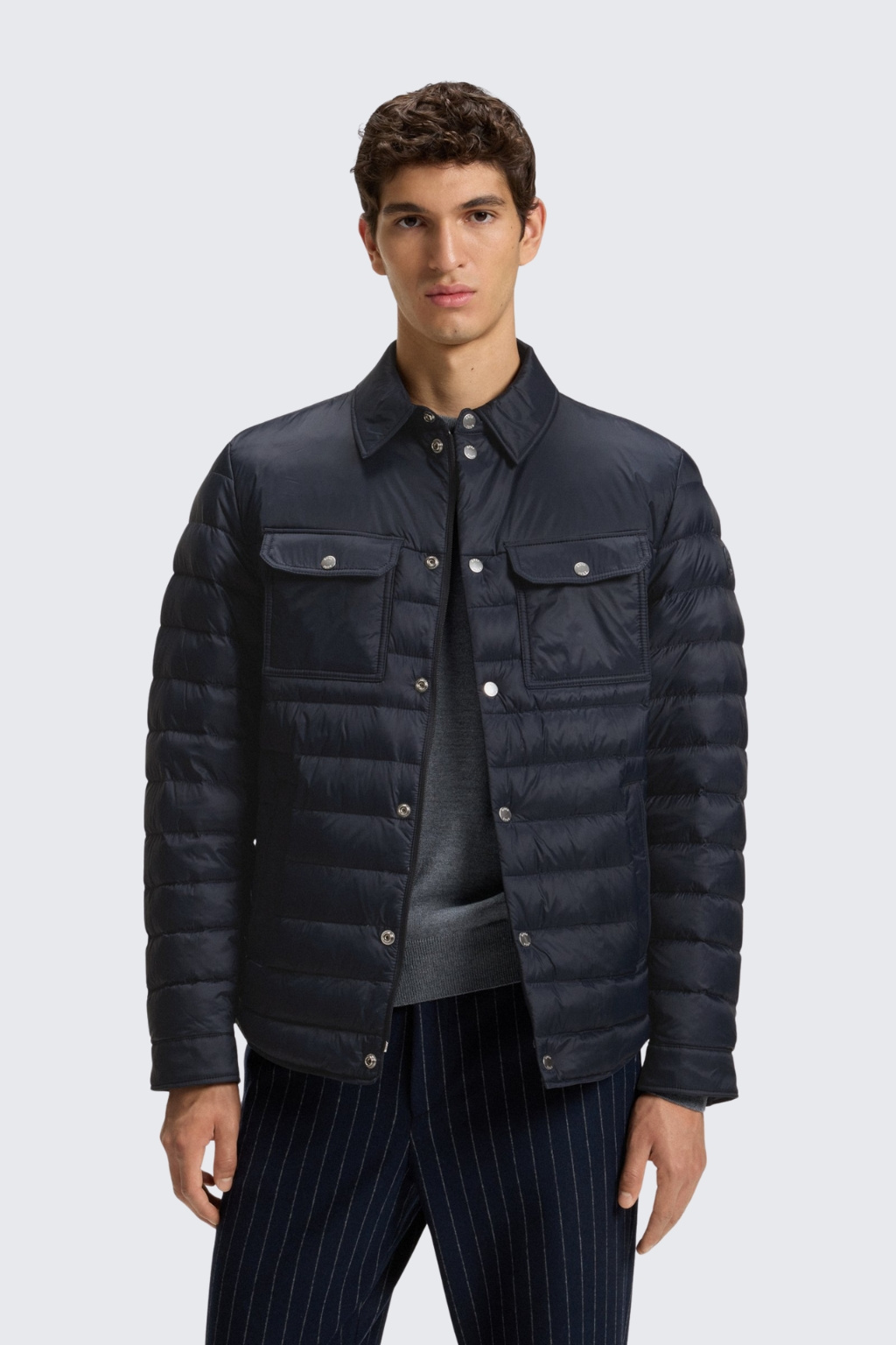 Pánská bunda z kolekce BOSS je vyrobena z vodorovně prošívaného materiálu. Model je nezateplený a má výplň z přírodního peří. Zapínání je po celé délce na druky a u krku je košilový límeček. Model má dvě náprsní kapsy s drukem. Bunda má standardní délku a dlouhé rukávy, po stranách jsou dvě boční šikmé kapsy. Na koncích rukávů jsou druky pro individuální nastavení.