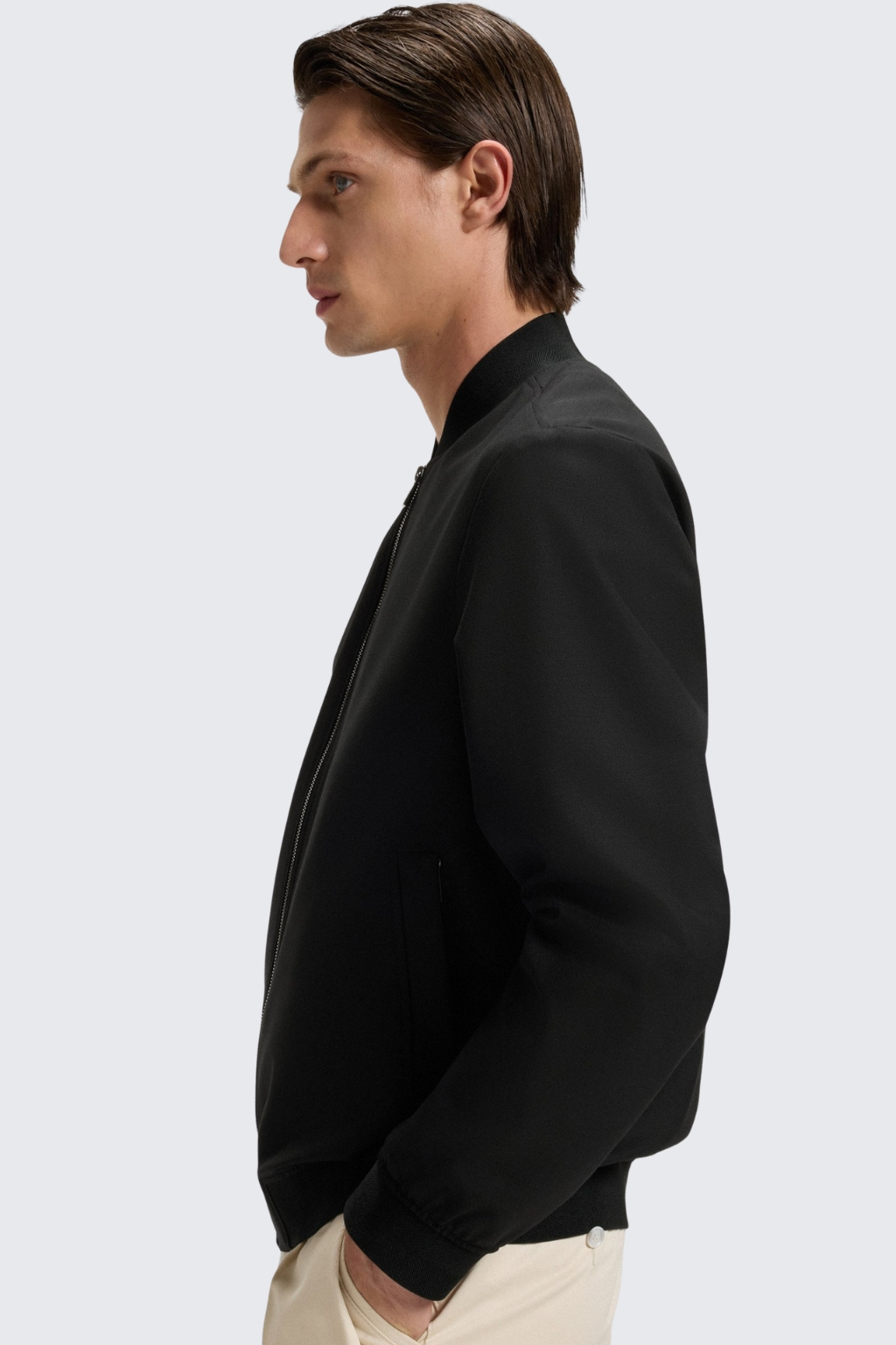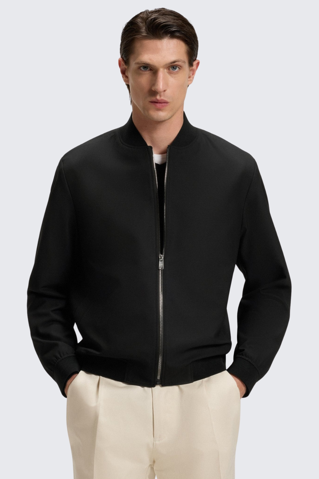Pánská bunda z kolekce BOSS je úzkého střihu. Model je vyrobený z hladkého materiálu. Rukávy a spodní lem jsou zakončeny žebrovanou manžetou. Model má krátký límeček a zapínání na zip. Po stranách jsou dvě průhmatové kapsy a na středovém zipu logo značky BOSS.