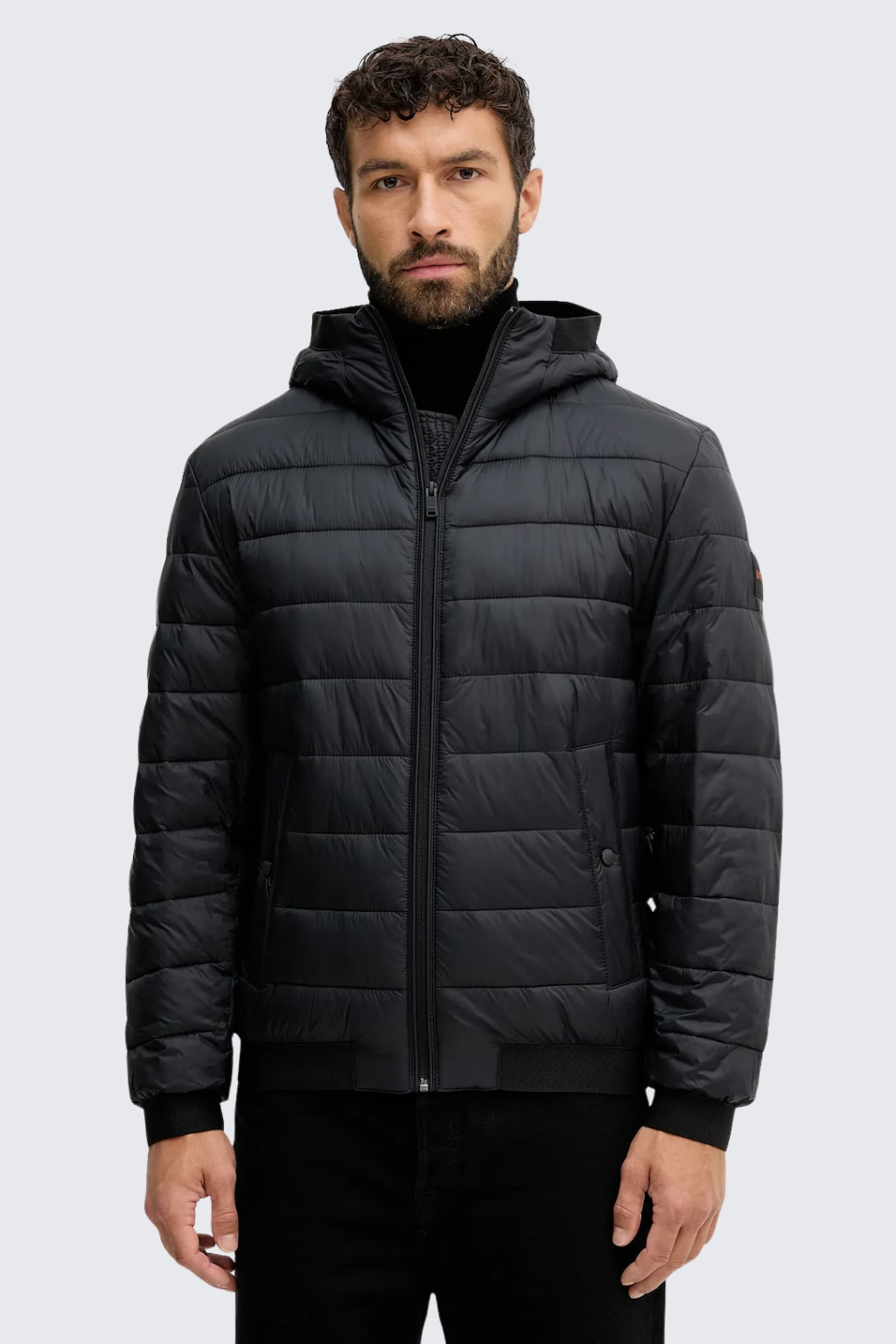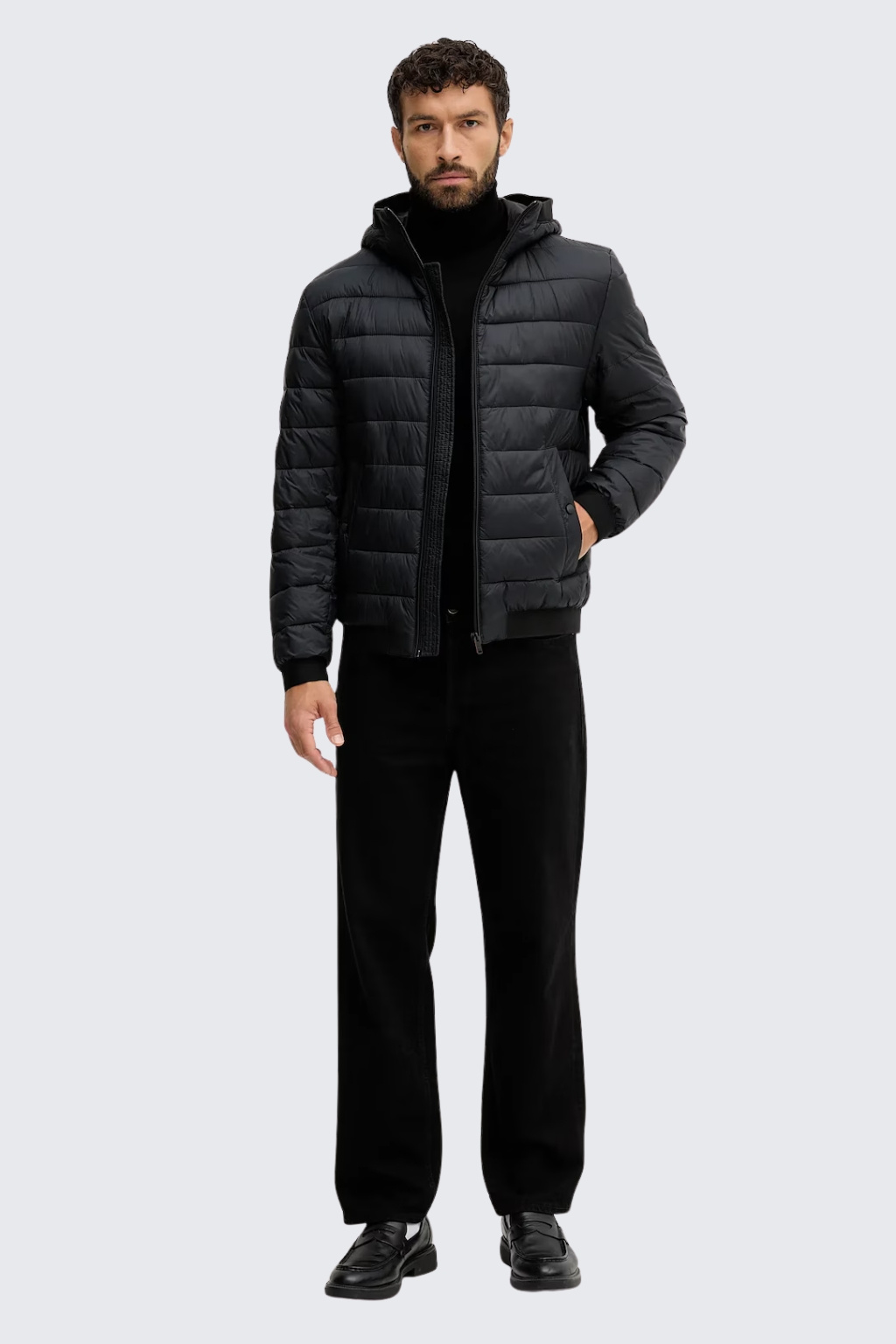 Pánská bunda z kolekce BOSS Orange má standardní střih i délku a dlouhé rukávy. U krku je límec a kapuce. Model je vyroben z hladké tkaniny. Je vodorovně prošívaný a vespod a na koncích rukávů je žebrovaná manžeta. Po stranách jsou dvě šikmé kapsy na druky, zapínání je po celé délce bundy na zip.