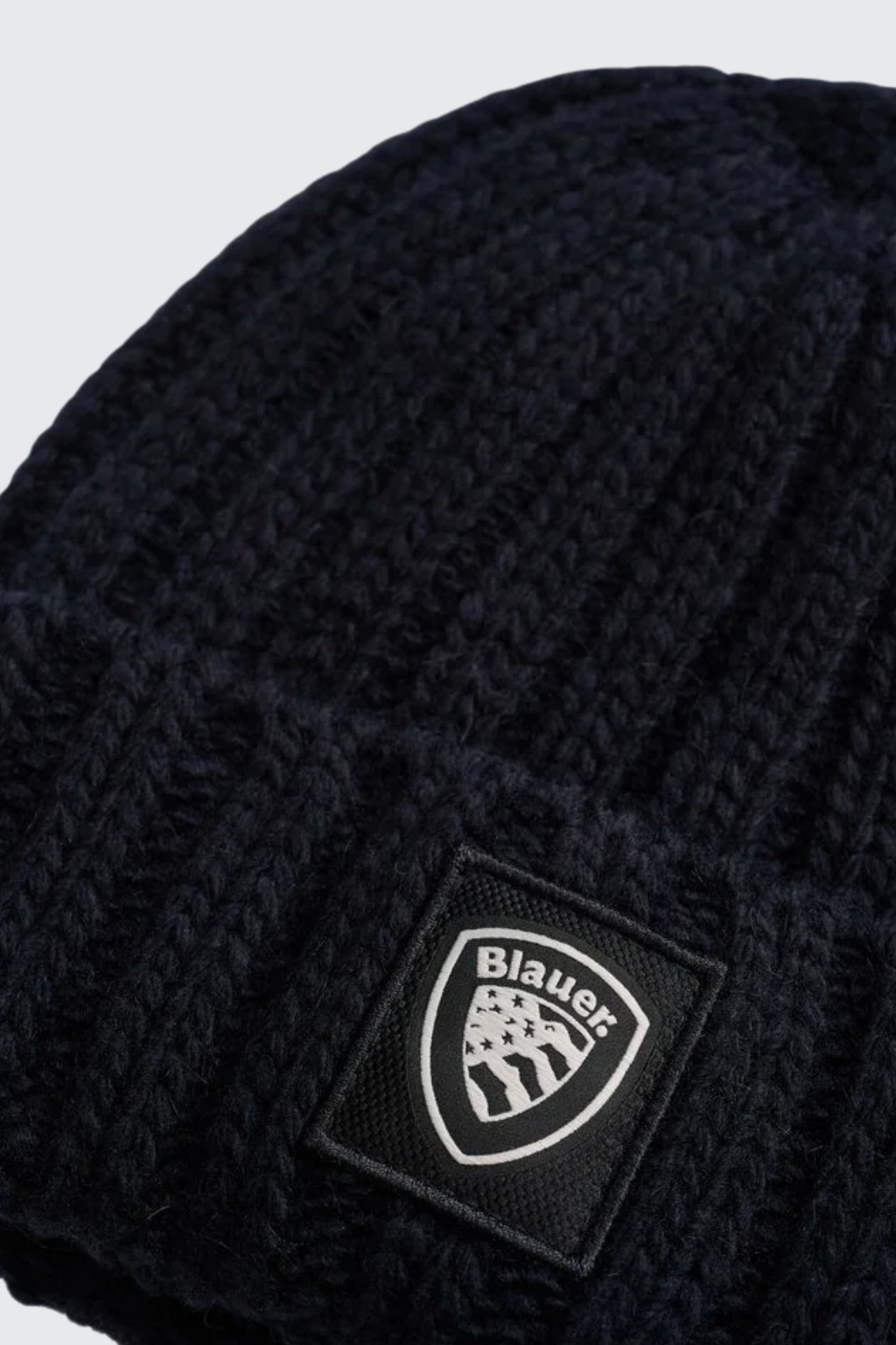 Pánská úpletová zimní čepice značky BLAUER má copánkový vzor. Model má vespod širokou manžetu s kontrastní nášivkou loga značky BLAUER ve tvaru erbu.