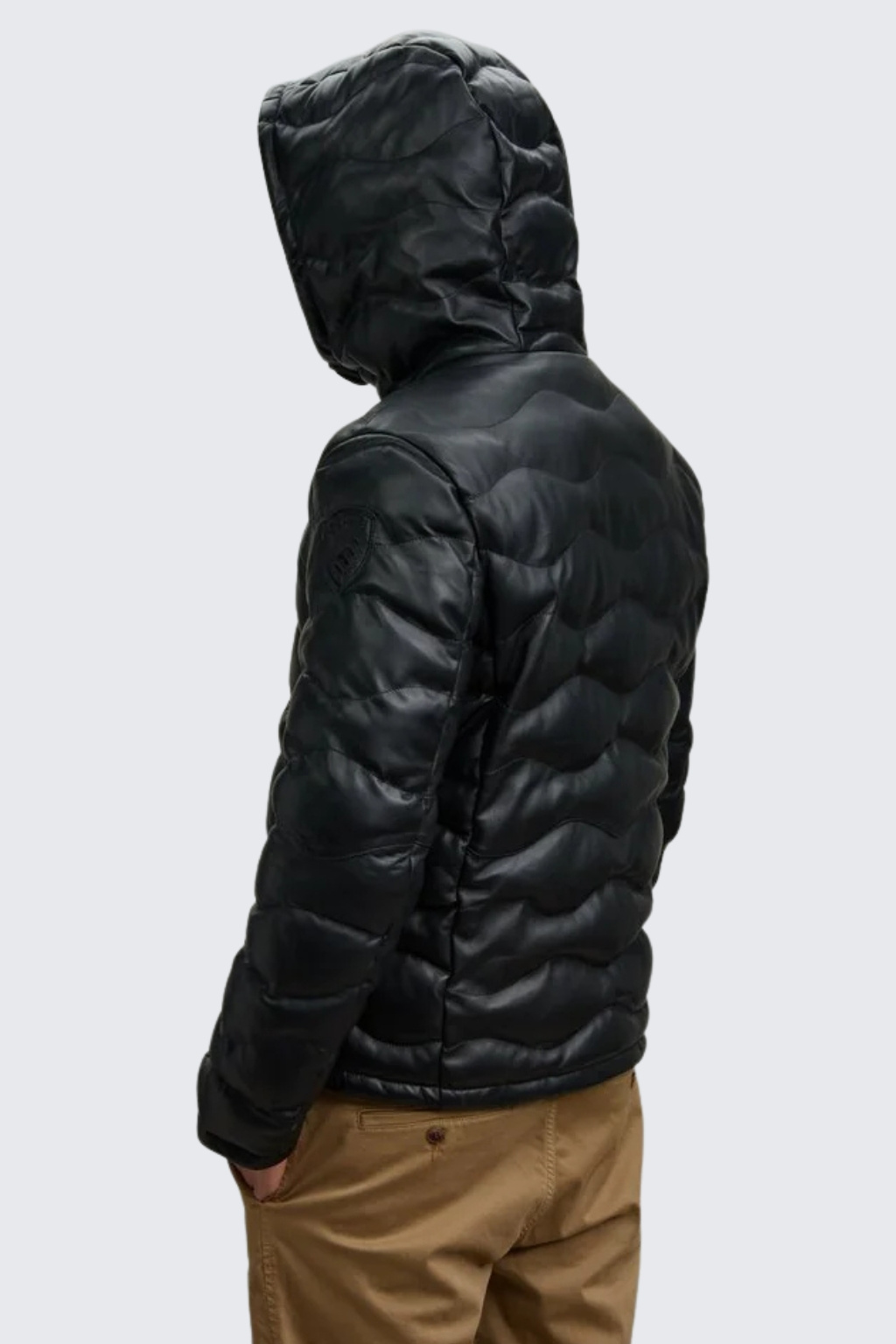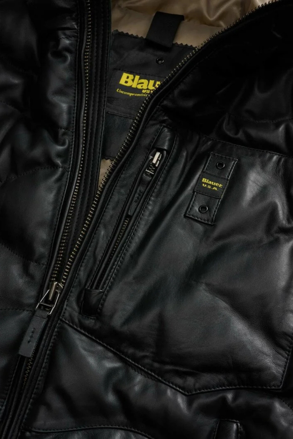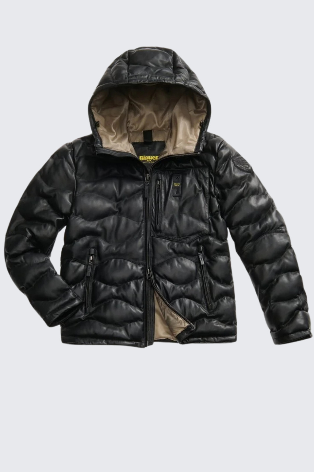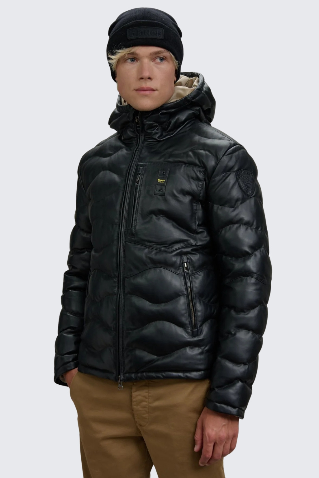 Pánská kožená prošívaná bunda značky BLAUER má standardní délku, rovný střih, vysoký límec a kapuci. Model má zapínání po celé délce na dvoucestný zip. Na levém rukávu je nášivka s logem značky BLAUER ve tvaru erbu a na hrudi je vlevo nášivka s nápisem BLAUER. Po stranách jsou dvě šikmé kapsy se zapínáním na zip a na hrudi je jedna náprsní.