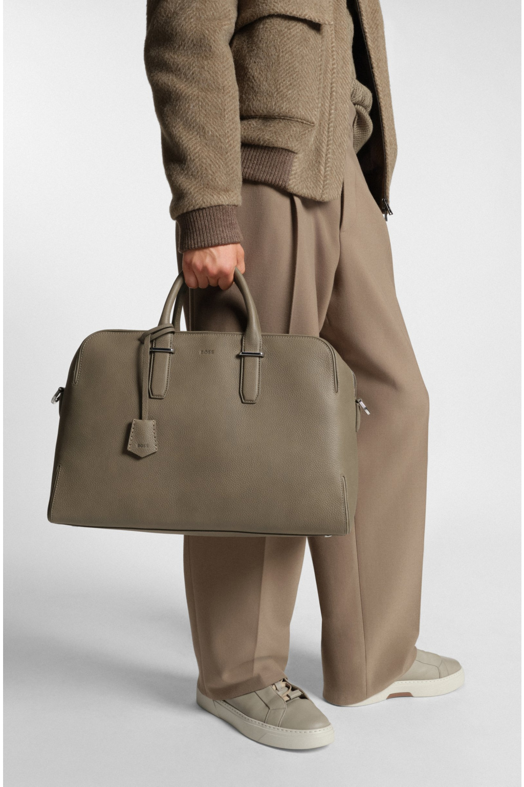 Pánská taška značky BOSS je vyrobena z přírodní kůže. Rozměry tašky jsou 44 x 31 x 19 cm, lze vložit formát A4. Má rukojeti a odnímatelný, nastavitelný ramenní popruh. Zapínání hlavní kapsy je na zip, uvnitř jsou dvě kapsy a podšívka. Taška má kožený přívěsek s nápisem značky BOSS, logo je i na přední straně modelu.