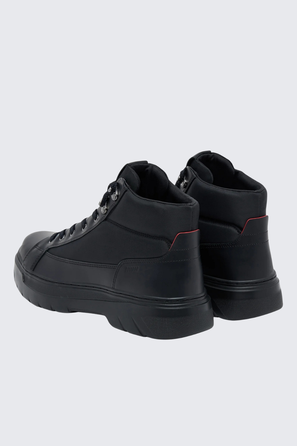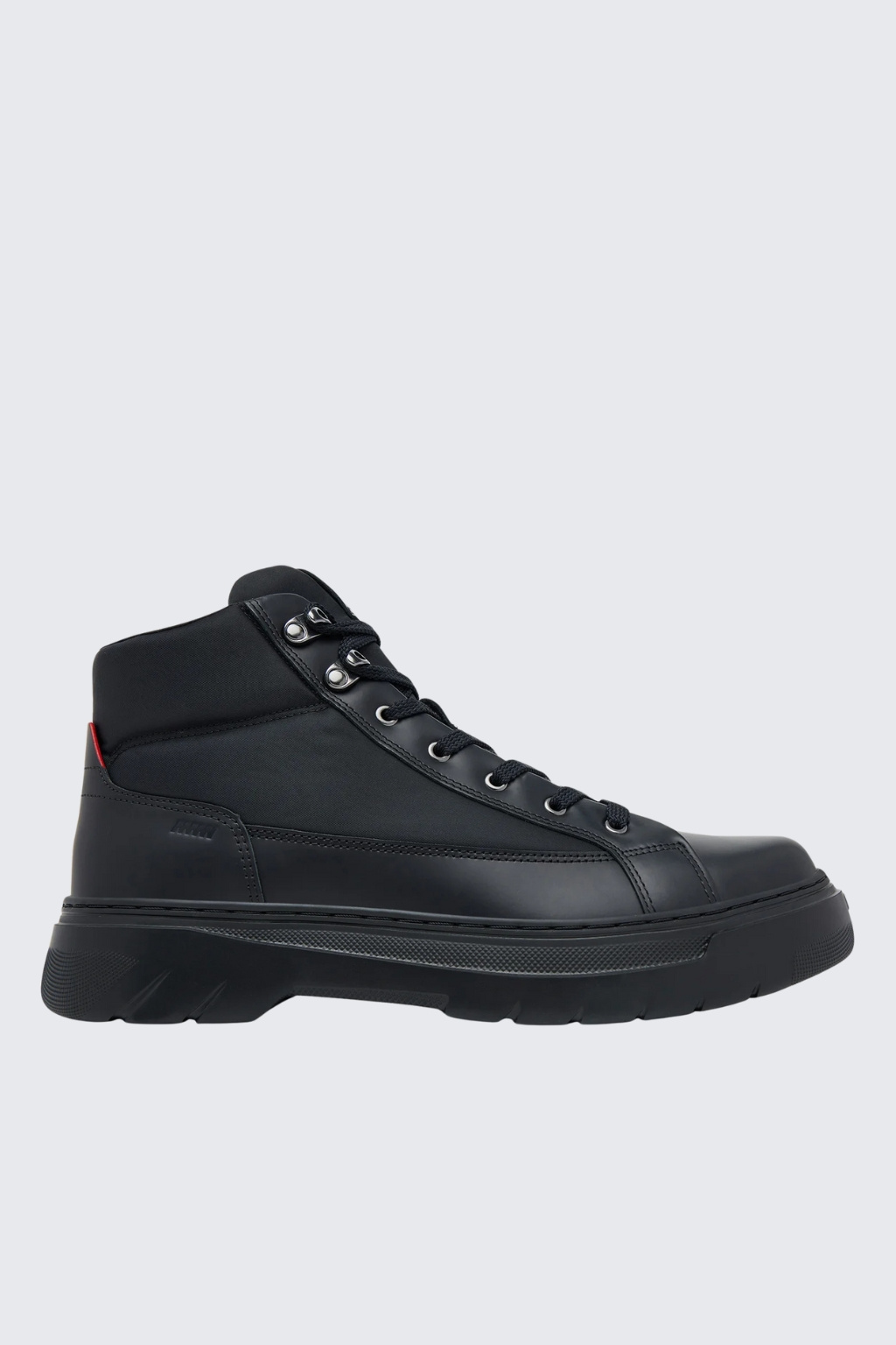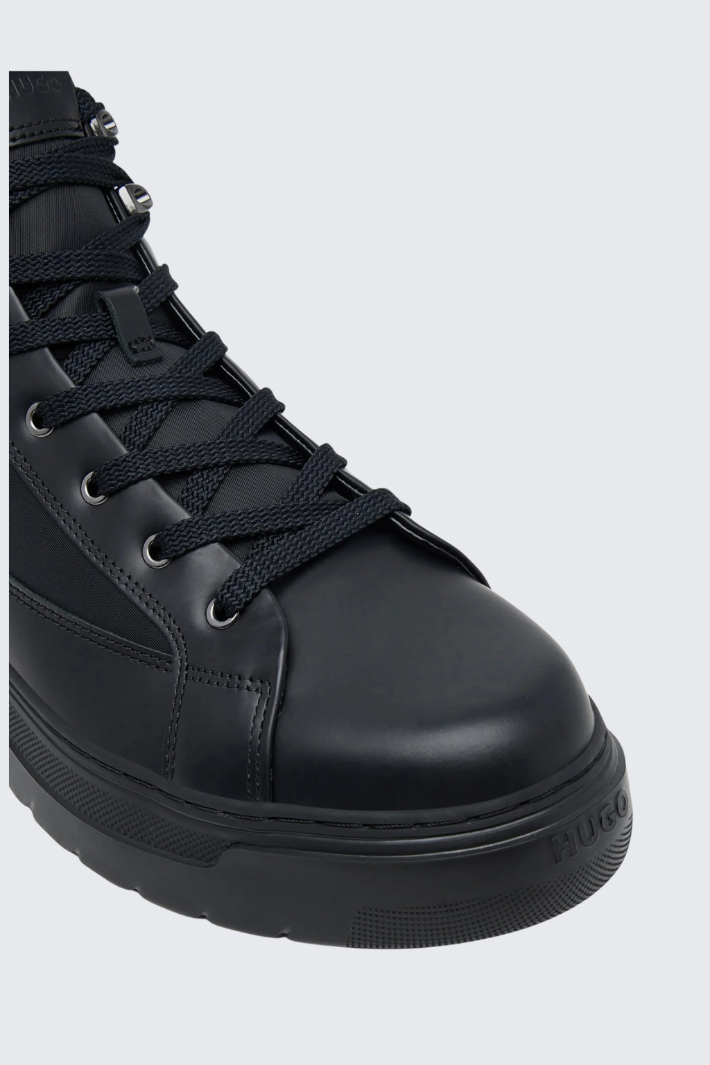 Pánské boty z kolekce HUGO. Model je vyroben z kombinace přírodní kůže a textilního materiálu. Boty mají kulatou špičku a vyztuženou patu. Model má zavazování na ploché stejnobarevné tkaničky a zespod vroubkovanou podrážku. Boty mají na jazyku, z boku a na platformě nápis značky HUGO.