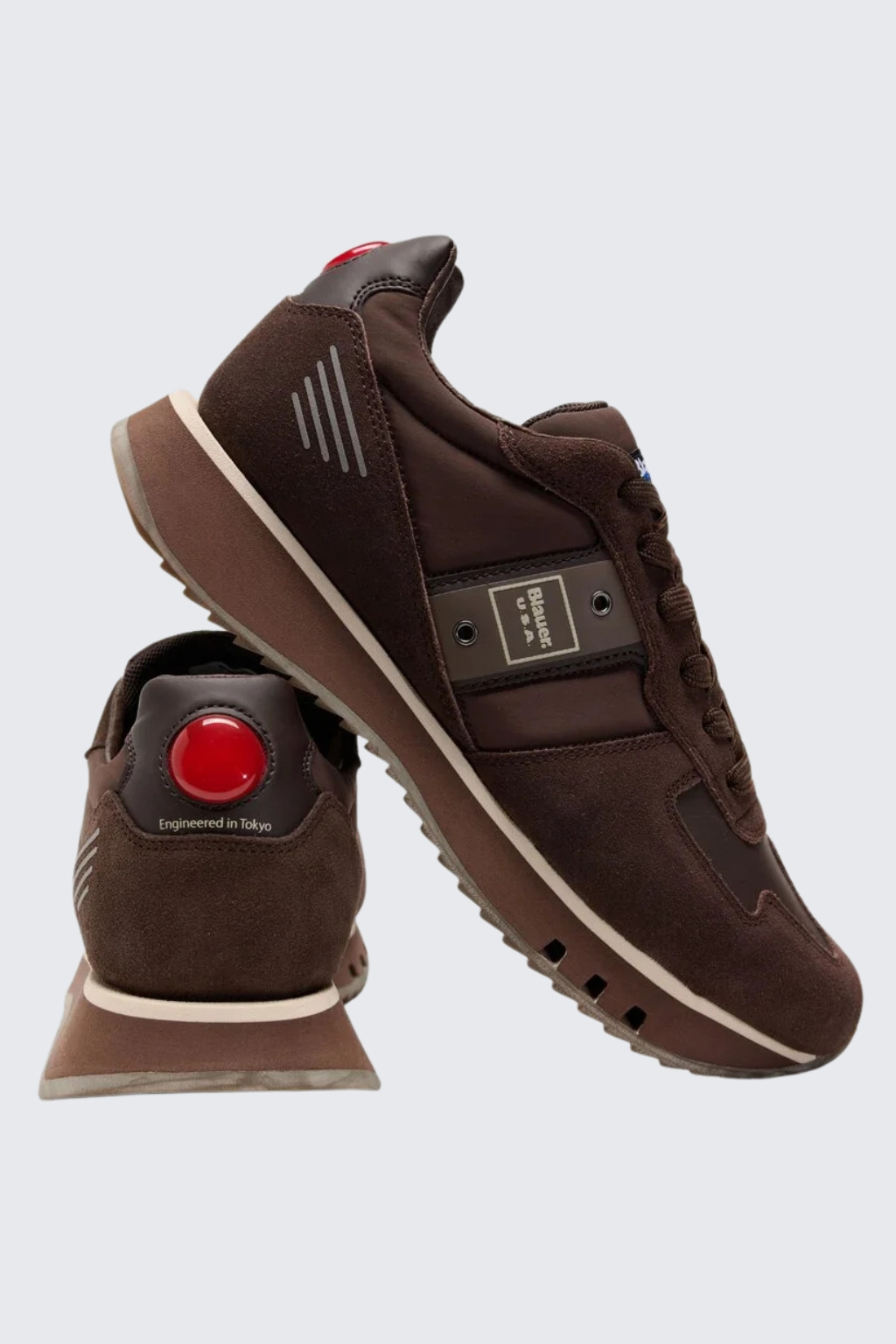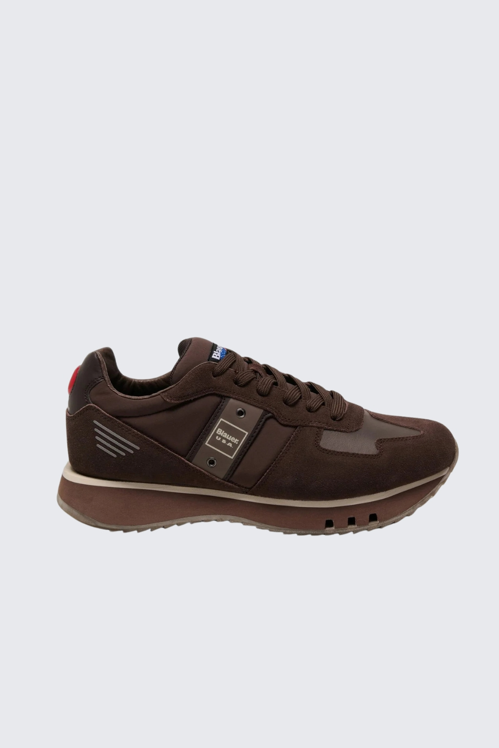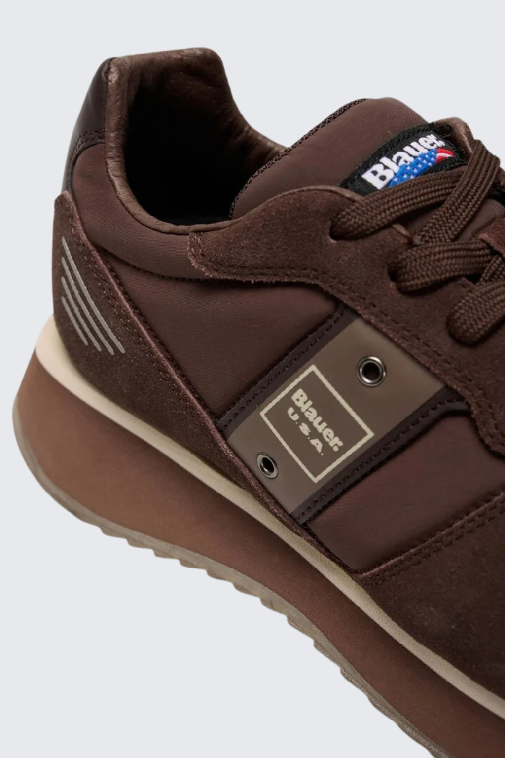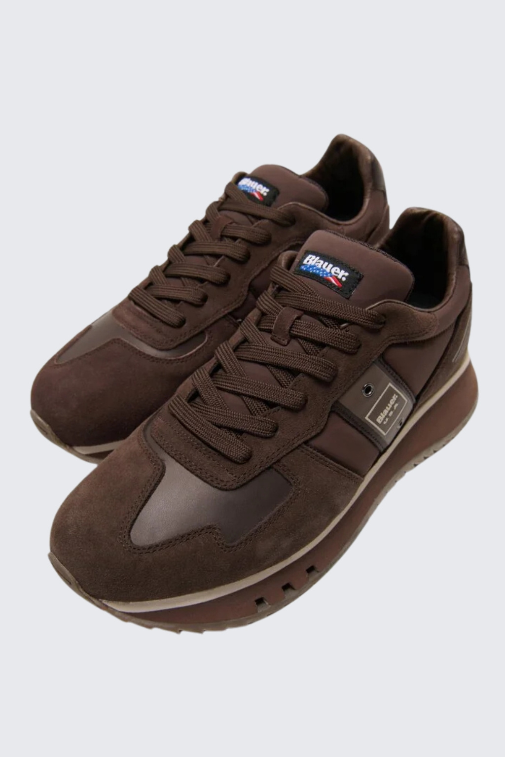 Pánské tenisky značky BLAUER. Model je vyroben z kombinace semiše, přírodní a ekologické kůže. Boty mají vyztuženou patu a kulatou špičku. Zavazování je na ploché tkaničky. Na vnější straně boty a jazyku je nápis značky BLAUER, na patě je červený button.
