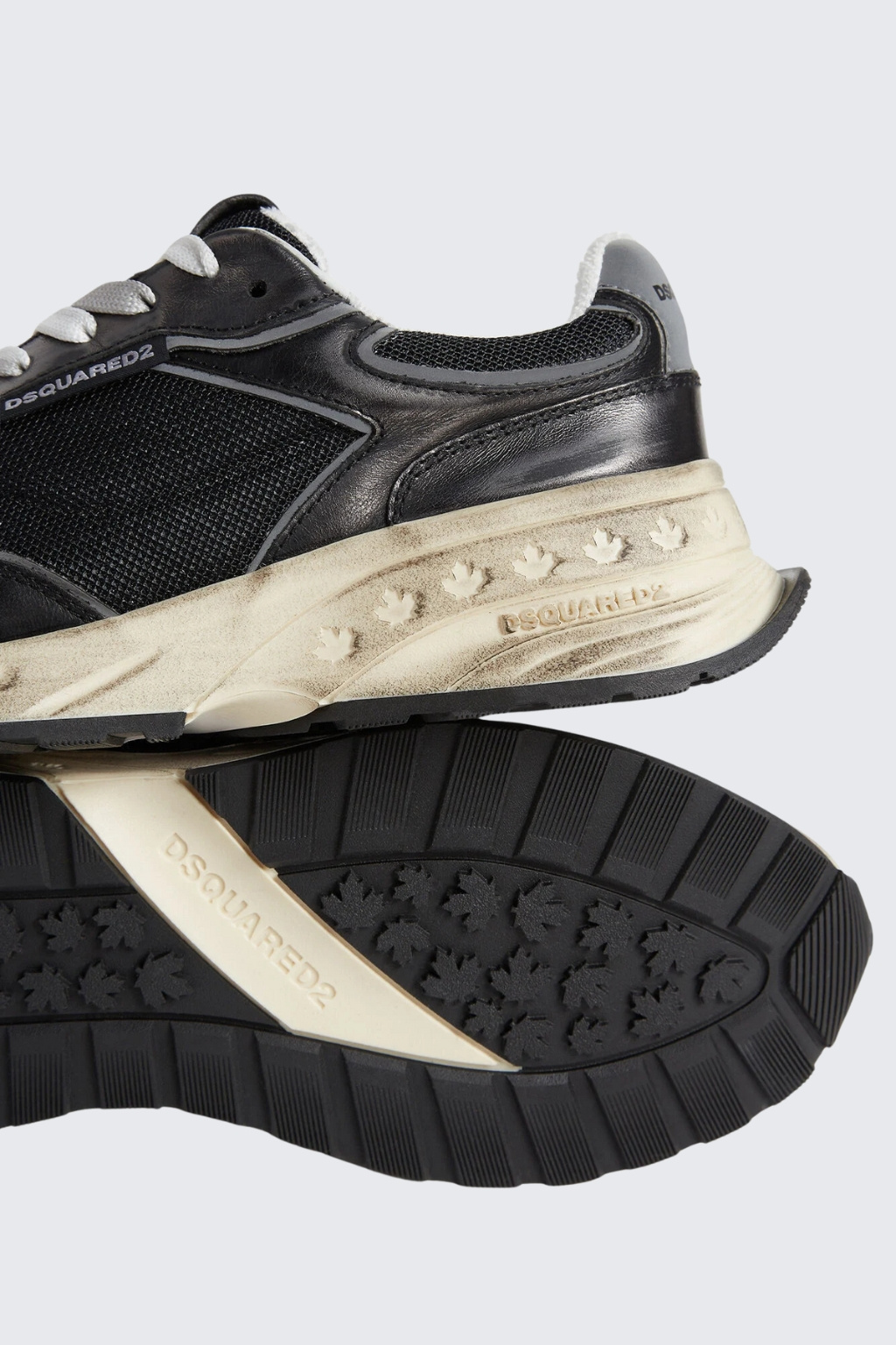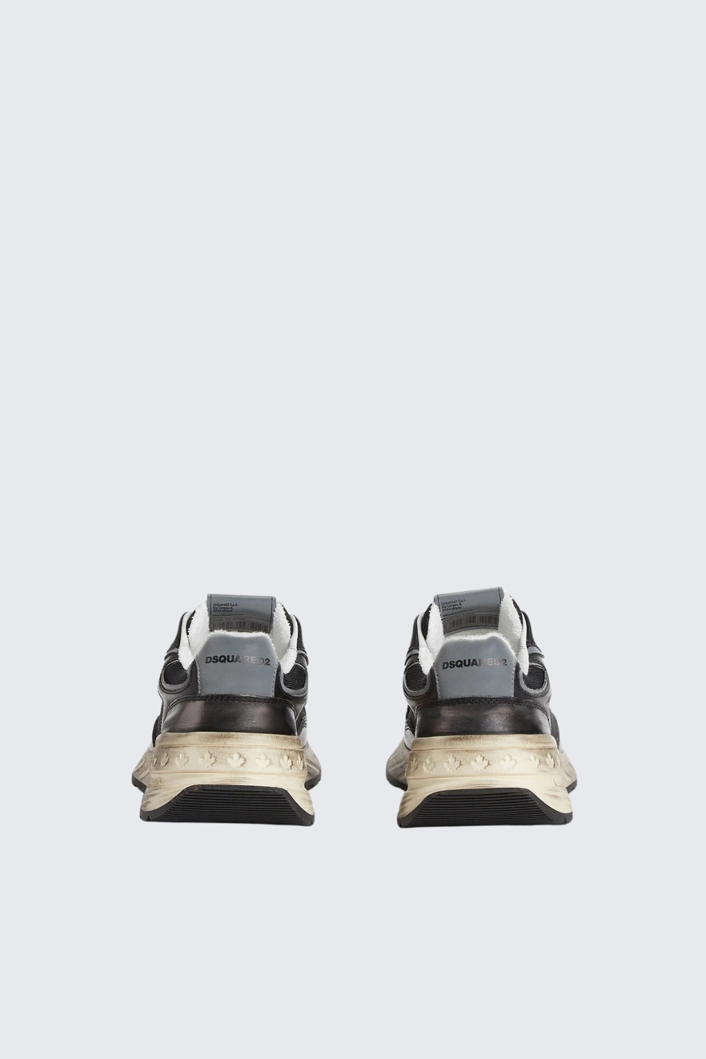 Pánské tenisky značky DSQUARED2 mají kulatou špičku a vyztuženou patu. Model je vyrobený z metalické kůže a síťoviny. Má vintage povrchovou úpravu a gumovou běžeckou podrážku. Na platformě je z vnější strany nápis DSQUARED2 a opakované logo, na jazyku a patě taktéž. Boty mají zavazování na ploché, kontrastní tkaničky.