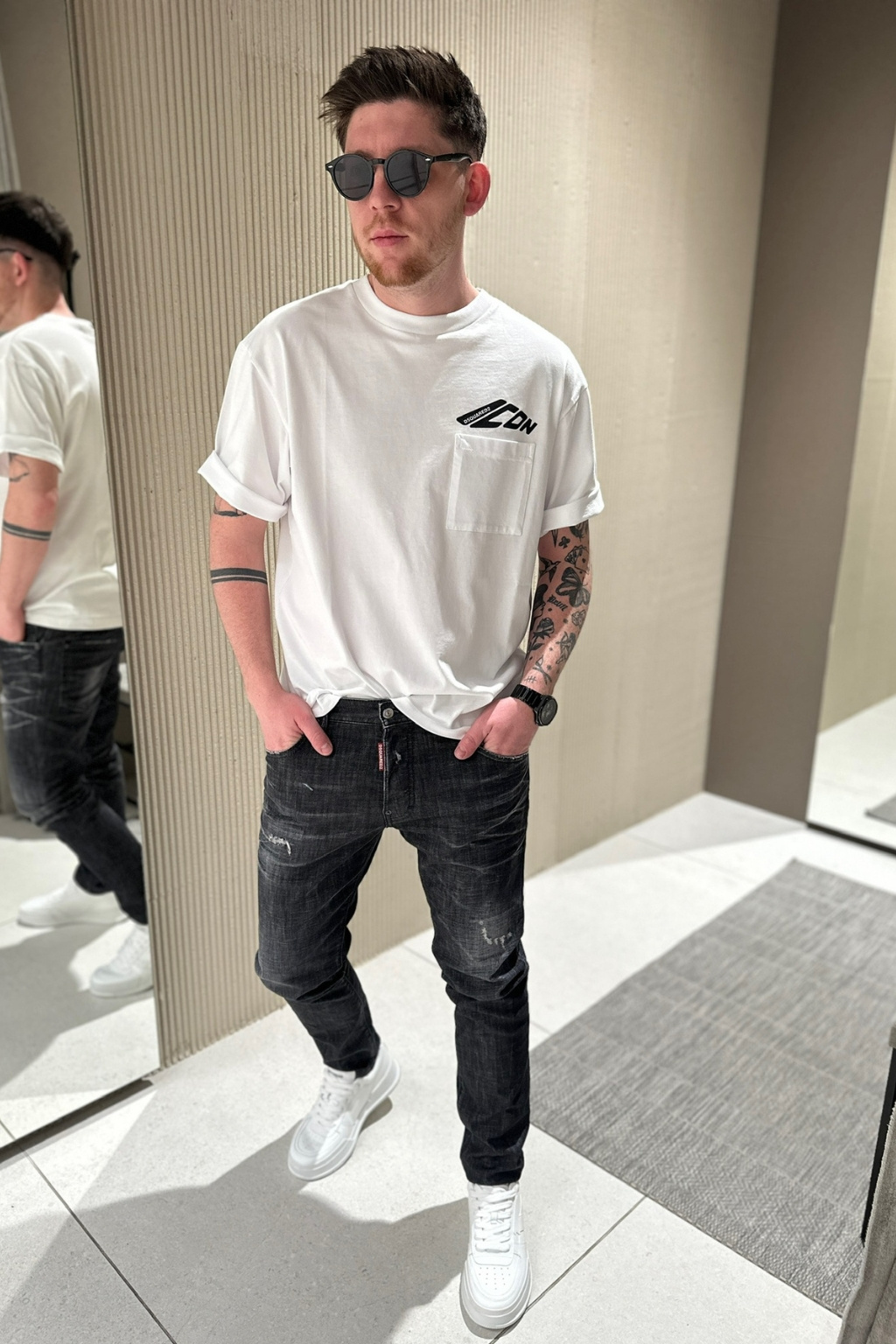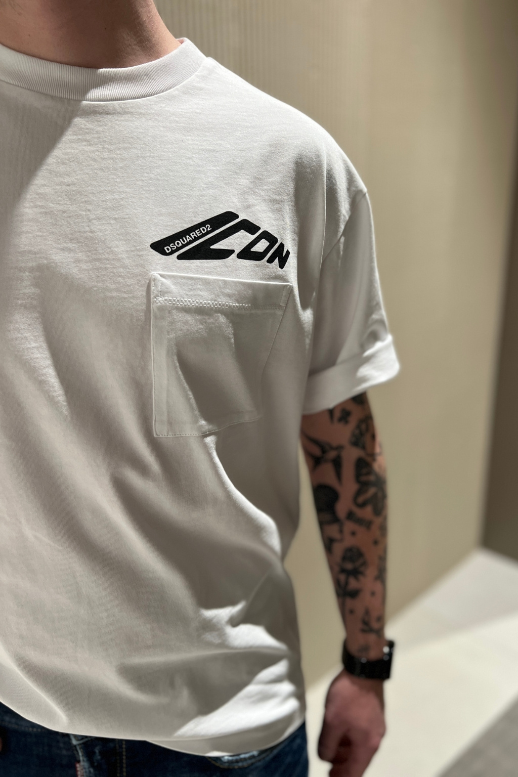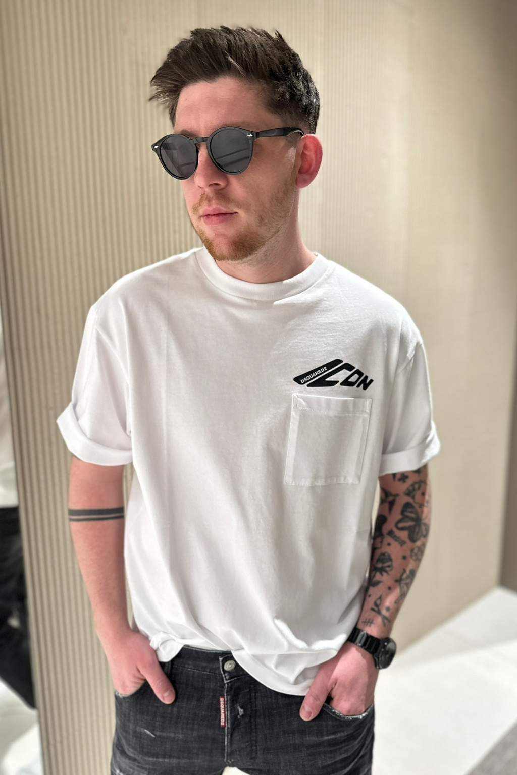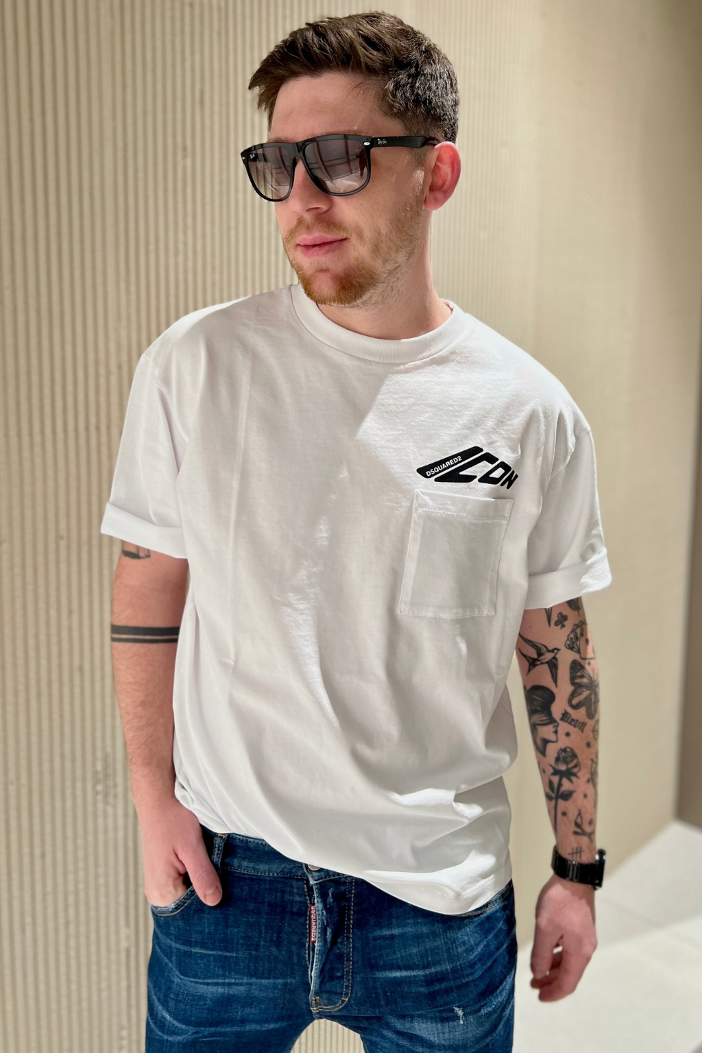 Pánské tričko značky DSQUARED2 má rovný střih a standardní délku. Model má sníženou linii ramen a krátký rukáv. Na hrudi je vlevo kapsička a nad ní potisk doplněný o logo značky DSQUARED2.