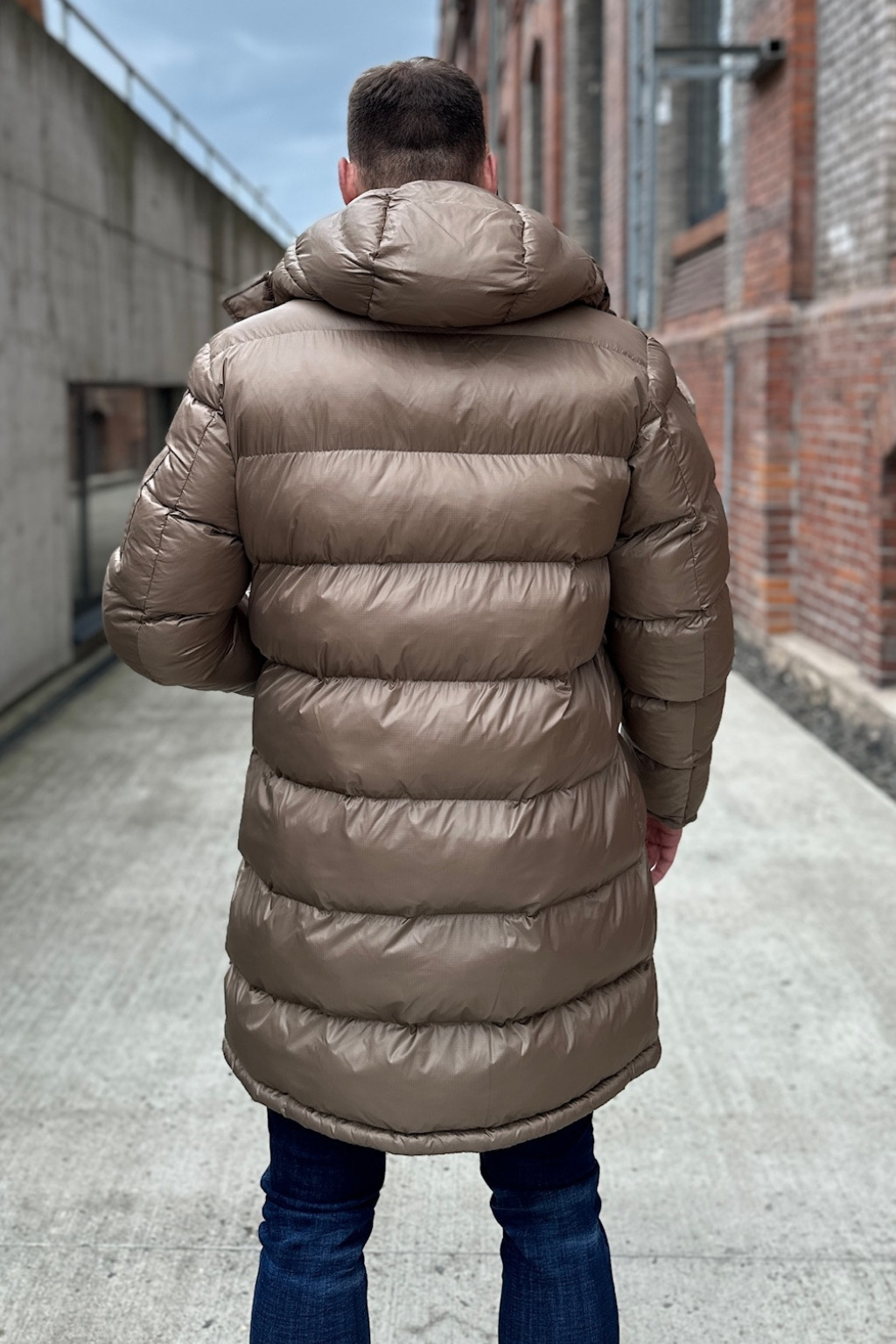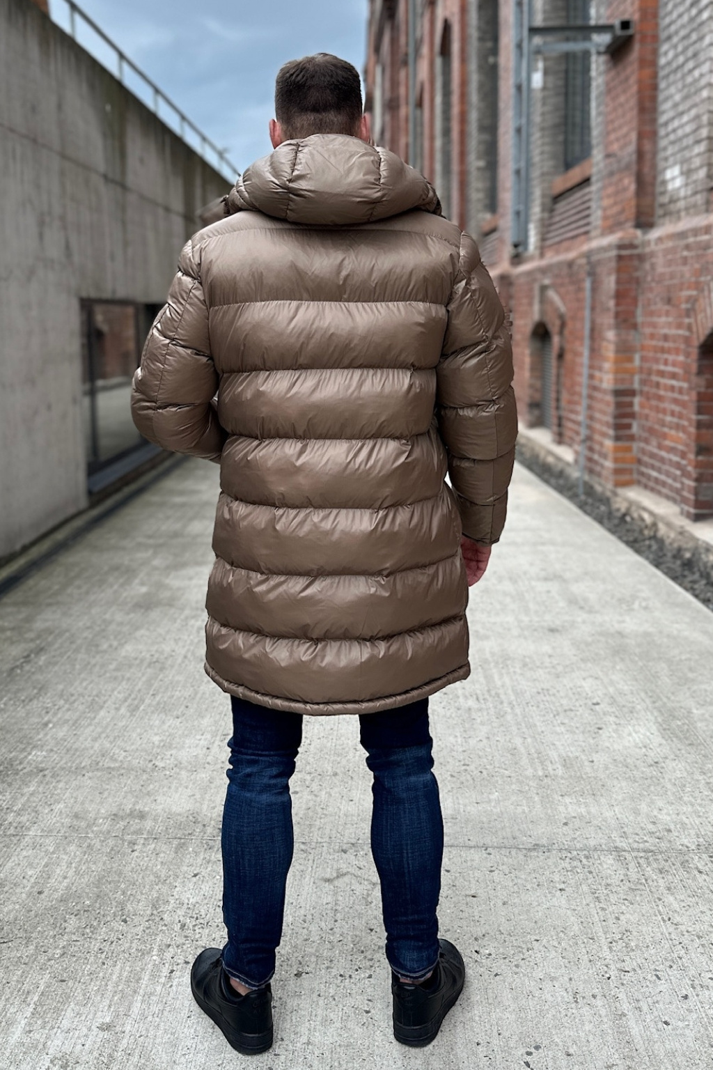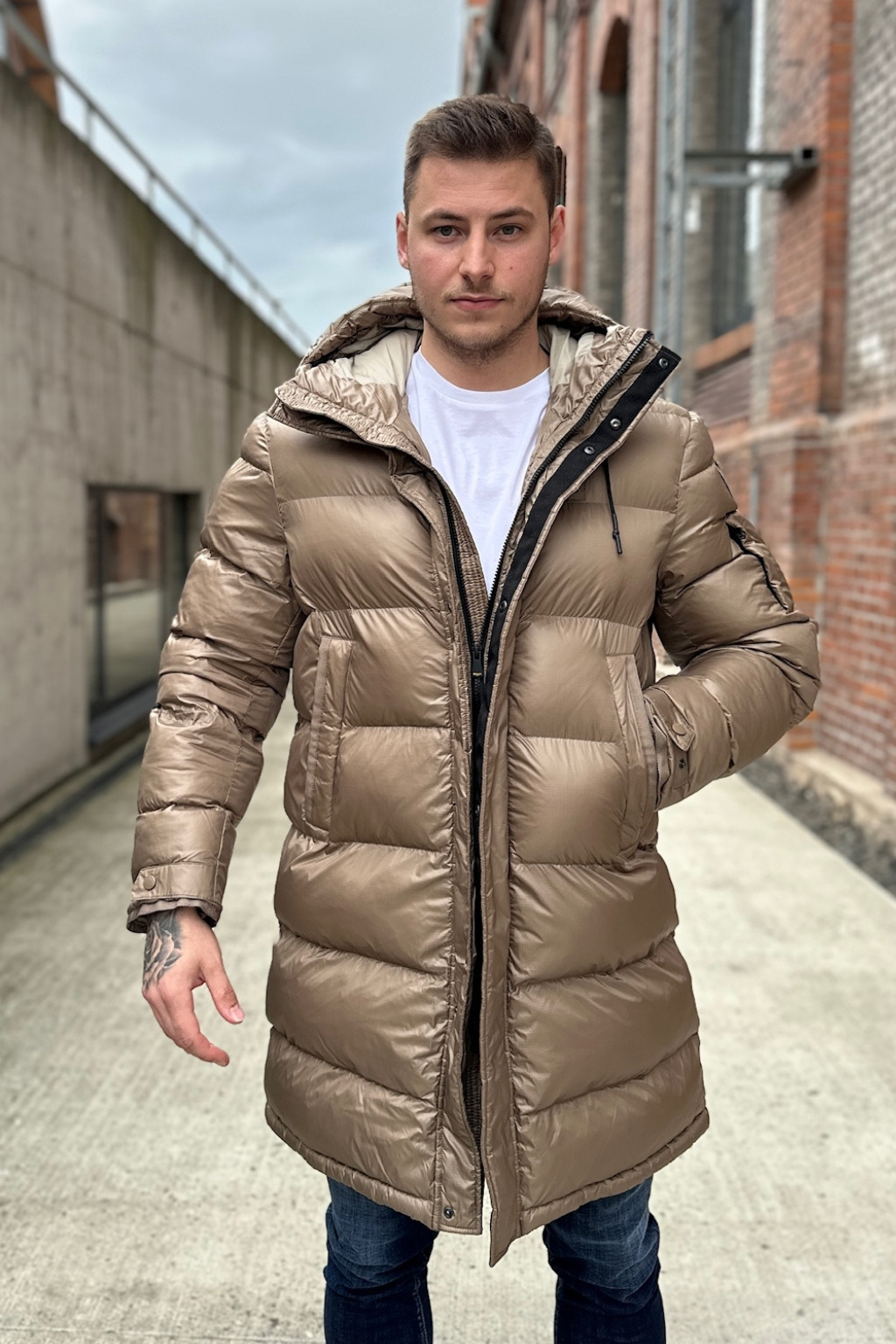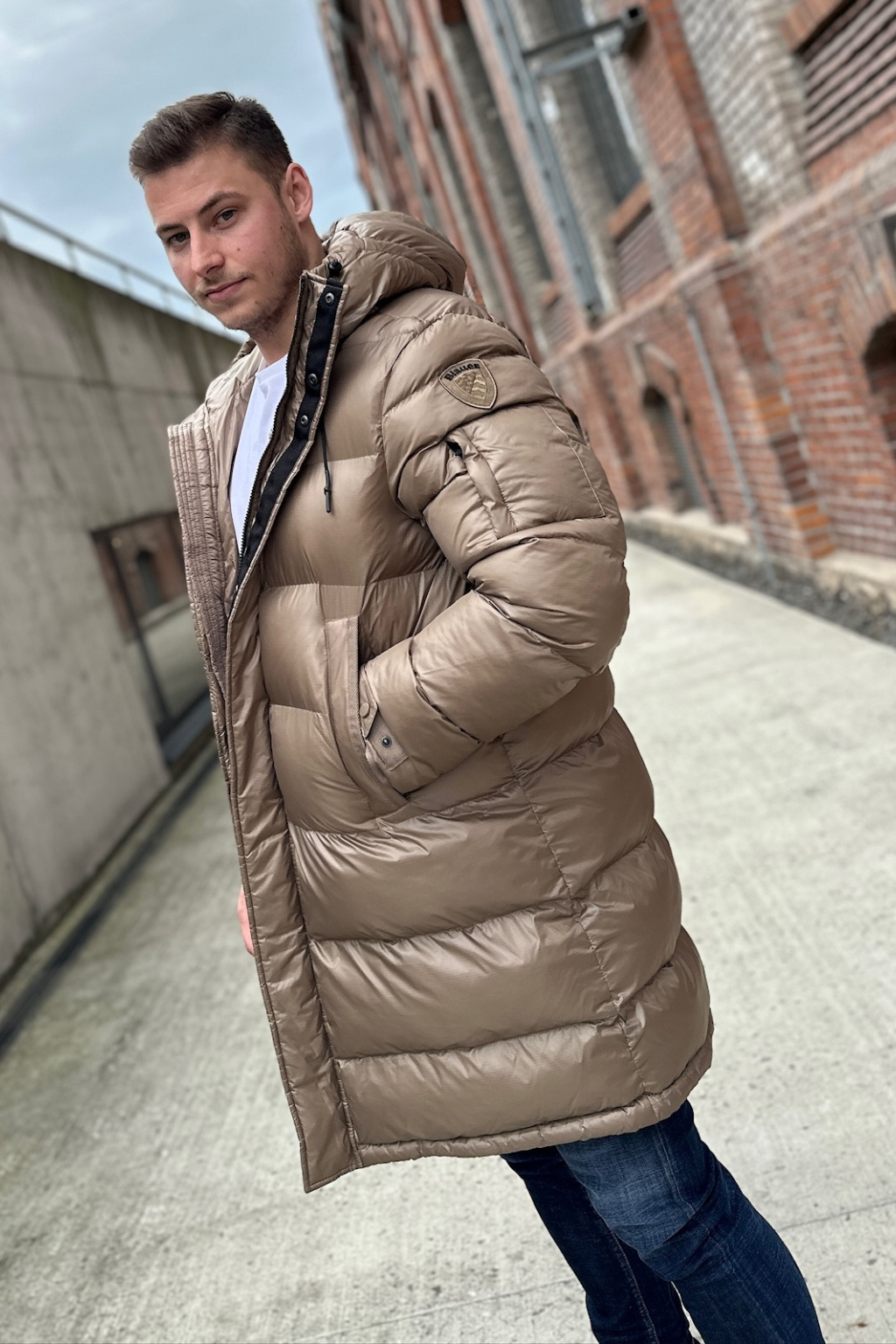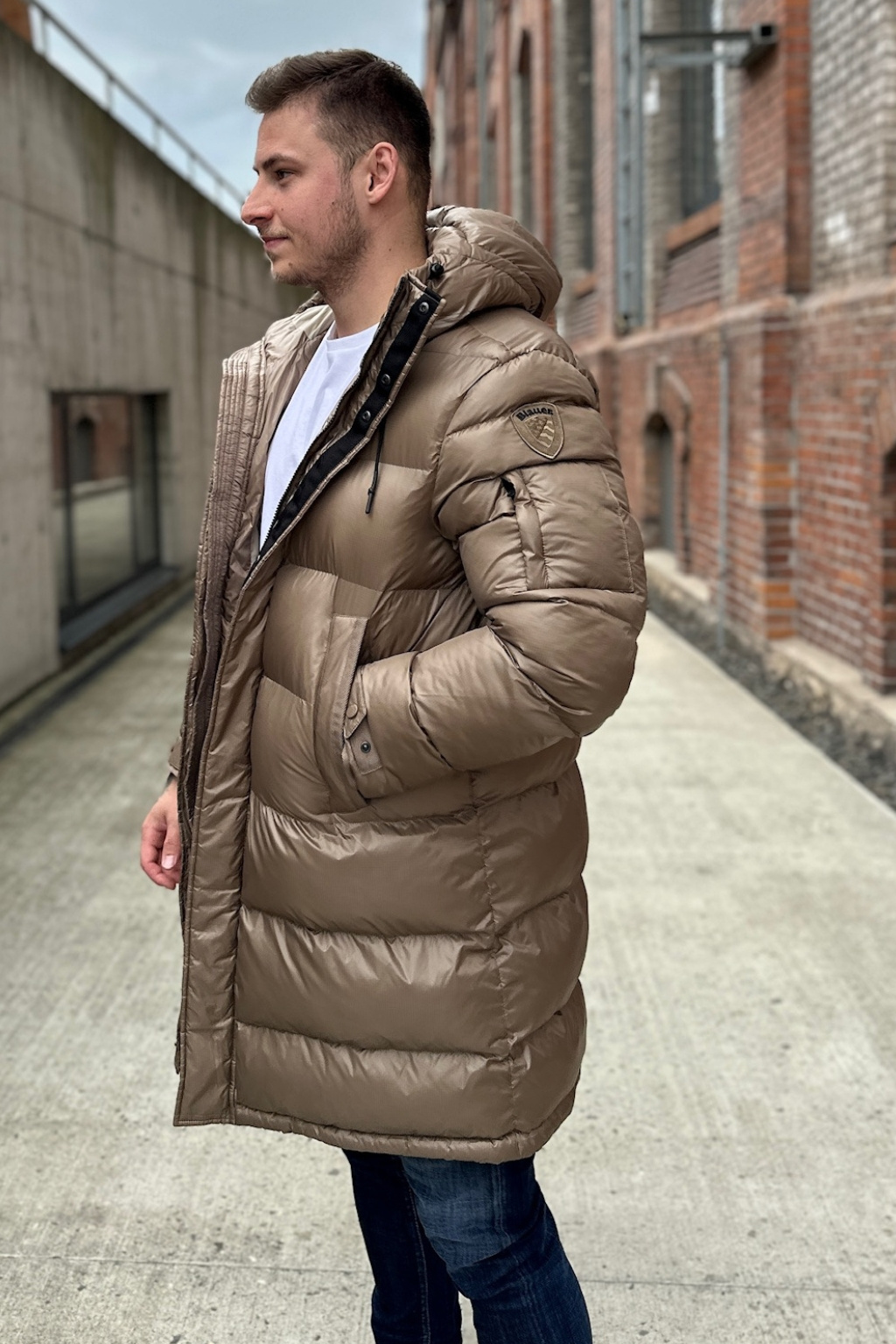 Pánská bunda má rovný střih, vodorovné prošívání a délku do poloviny stehen. Zapínání je na dvoucestný zip a druky. Kapuce má stahovací gumičku a kontrastní béžovou podšívku. Po stranách jsou dvě šikmo střižené kapsy na zip a vnitřní kapsa na suchý zip. Na levé straně je logo značky BLAUER a na levém rukávu je typický erb BLAUER. Ve spodní části bundy je na vnitřní straně stahovací gumička.