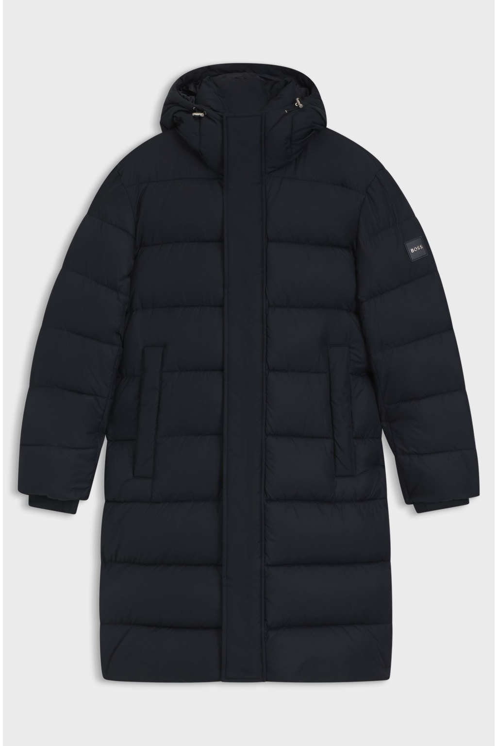 Pánská zimní bunda z kolekce BOSS je vyrobená z hladkého materiálu s vodorovným prošíváním. Má délku do půli stehen, dlouhé rukávy a rovný střih. Bunda má zapínání na zip a druky po celé délce a u krku límec s kapucí. Po stranách jsou dvě šikmé kapsy na zip.