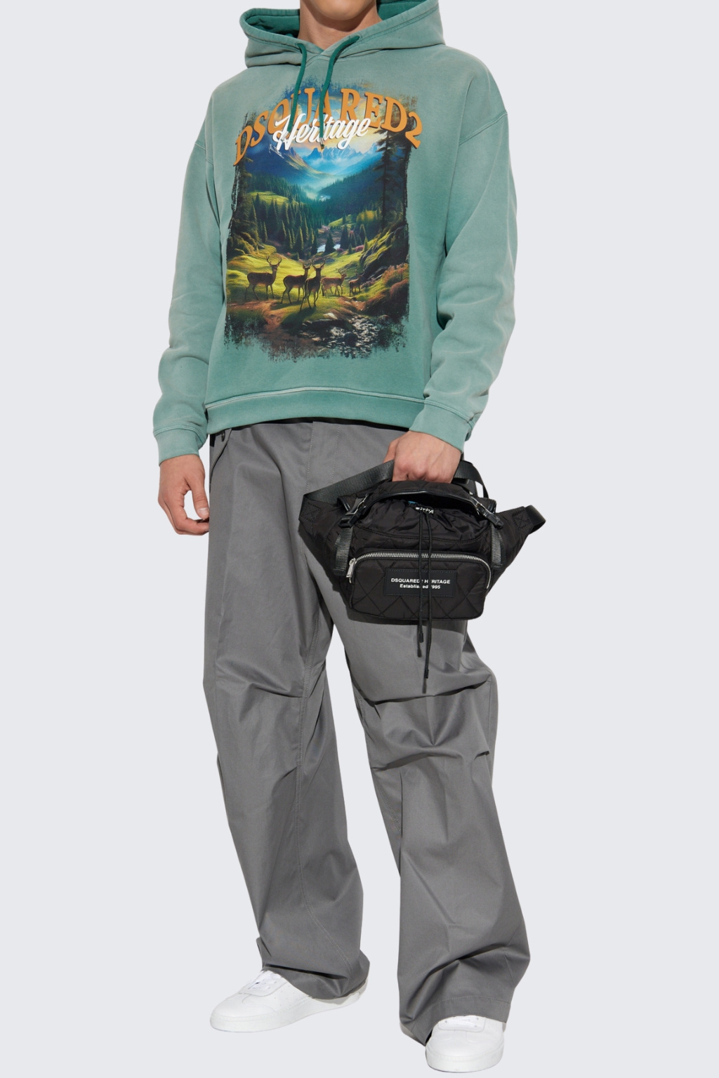 Pánská mikina značky DSQUARED2 má volný střih, standardní délku a dlouhé rukávy. Model má kapuci se stahovací šňůrkou a sníženou linii ramen. Spodní lem a konce rukávů jsou zakončeny žebrovanou manžetou. Na přední straně je velký barevný potisk doplněný o logo značky DSQUARED2.