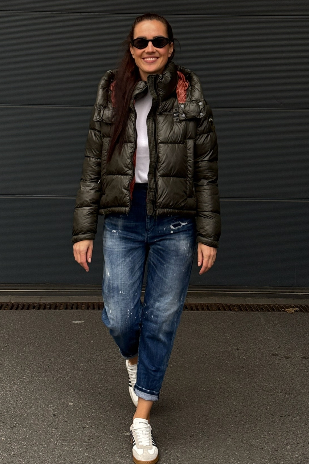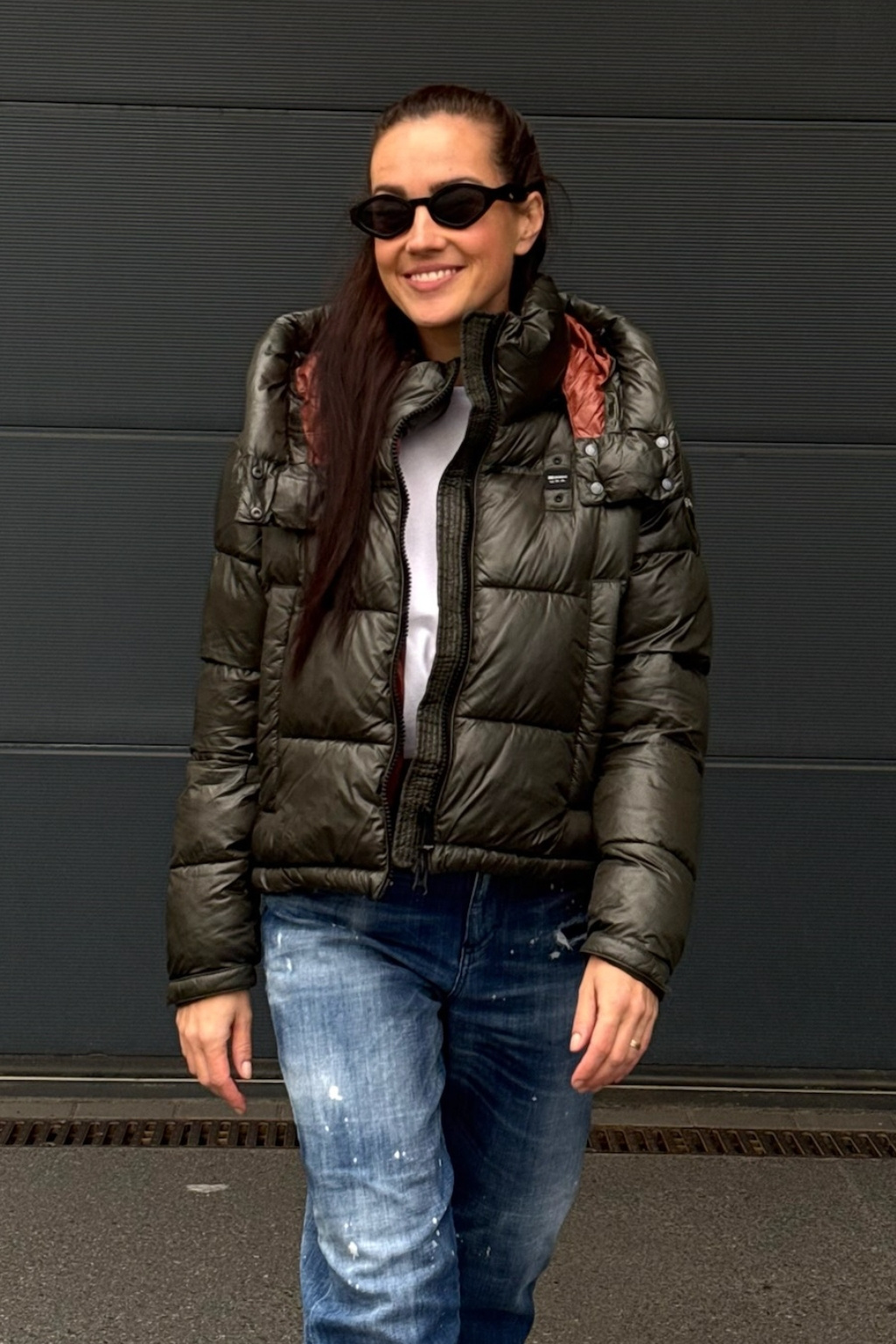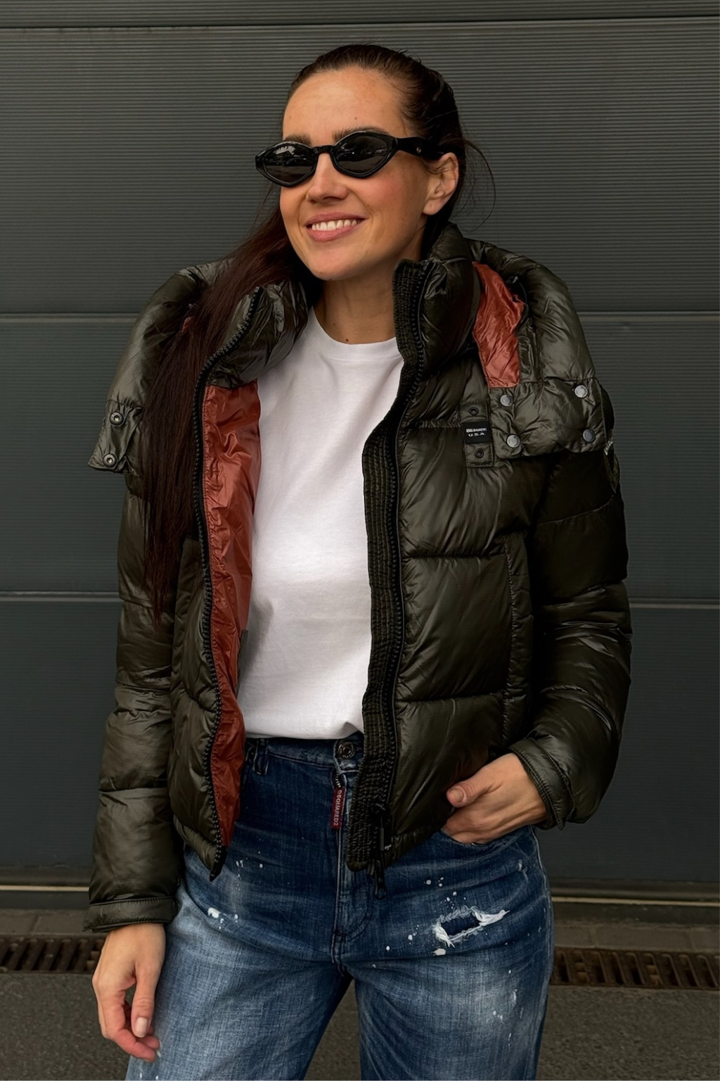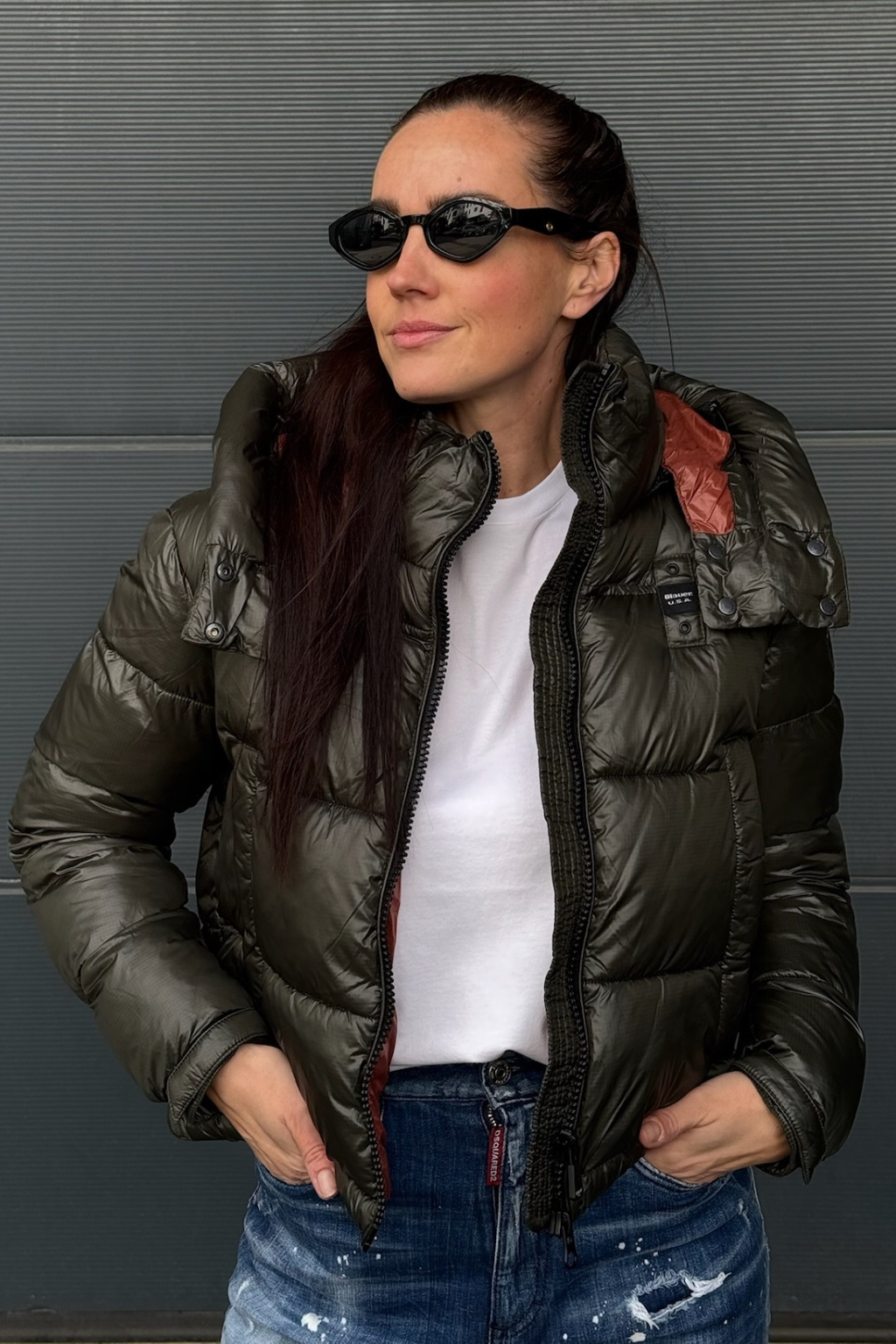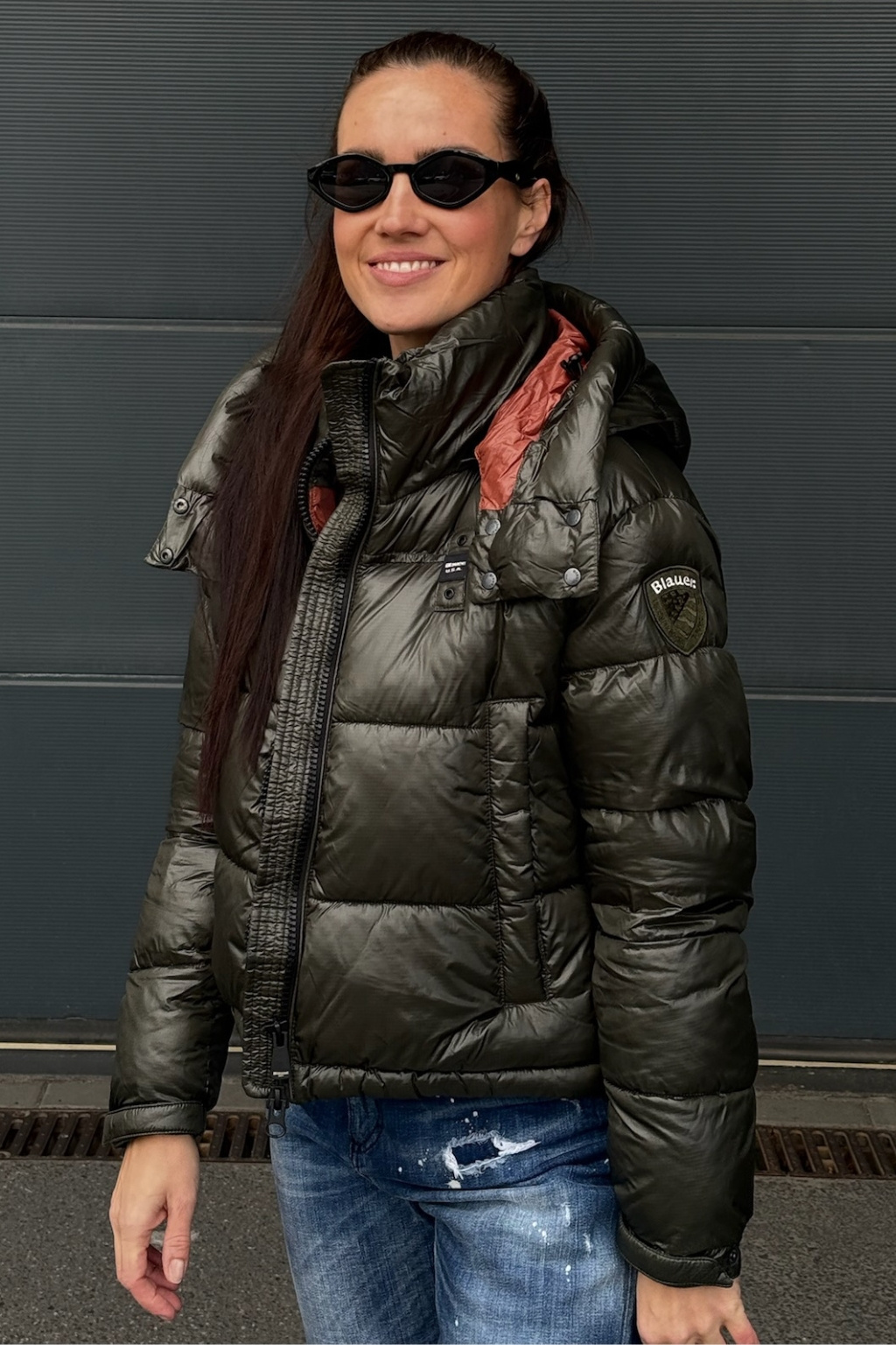 Dámská bunda má zkrácenou délku, vodorovné prošívání a má volný střih. Bunda je s výplní Sorona Aura, je velmi lehká a teplá. Bunda má odnímatelnou kapuci na zip. Zapínání je na dvoucestný zip. Po stranách jsou dvě velké šikmé kapsy na patentky, uvnitř jsou dvě kapsy na suchý zip. Logo značky je umístěno na levé straně hrudi a na levém rukávu je typický erb s logem BLAUER. Jedná se o fashion kousek, který oživí každý outfit.