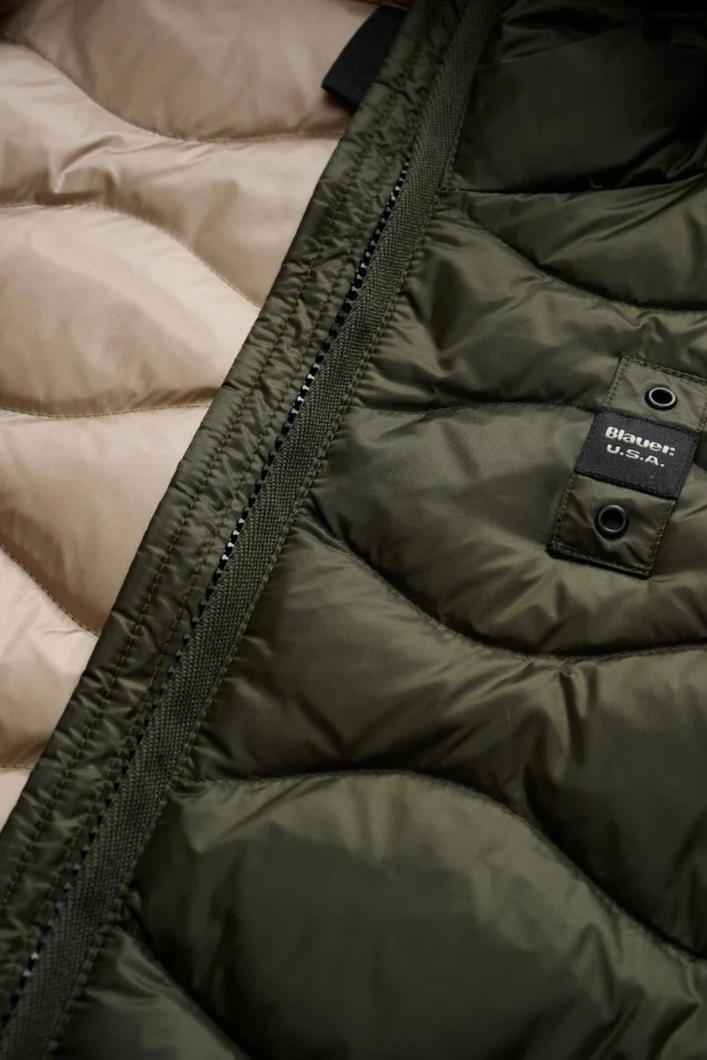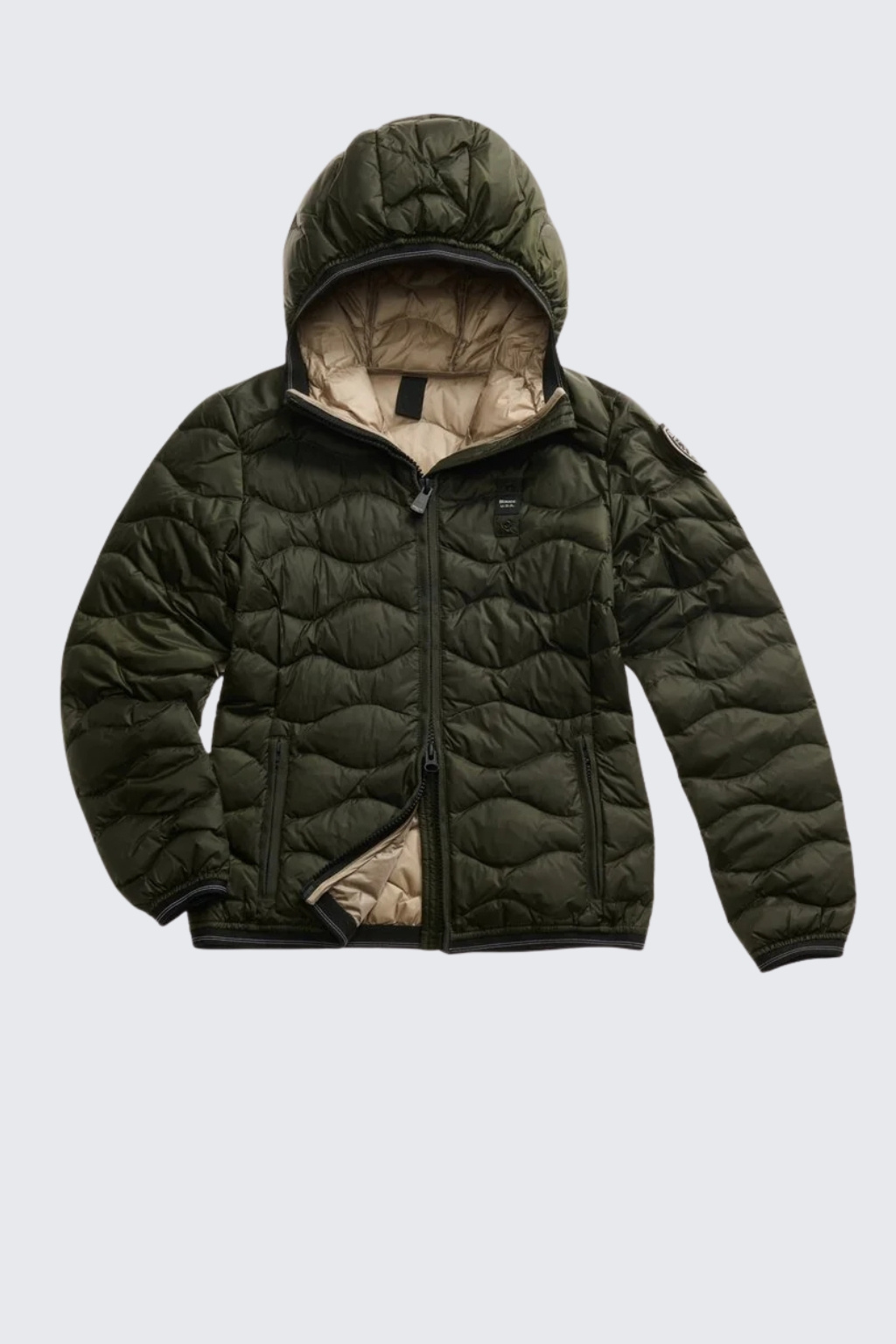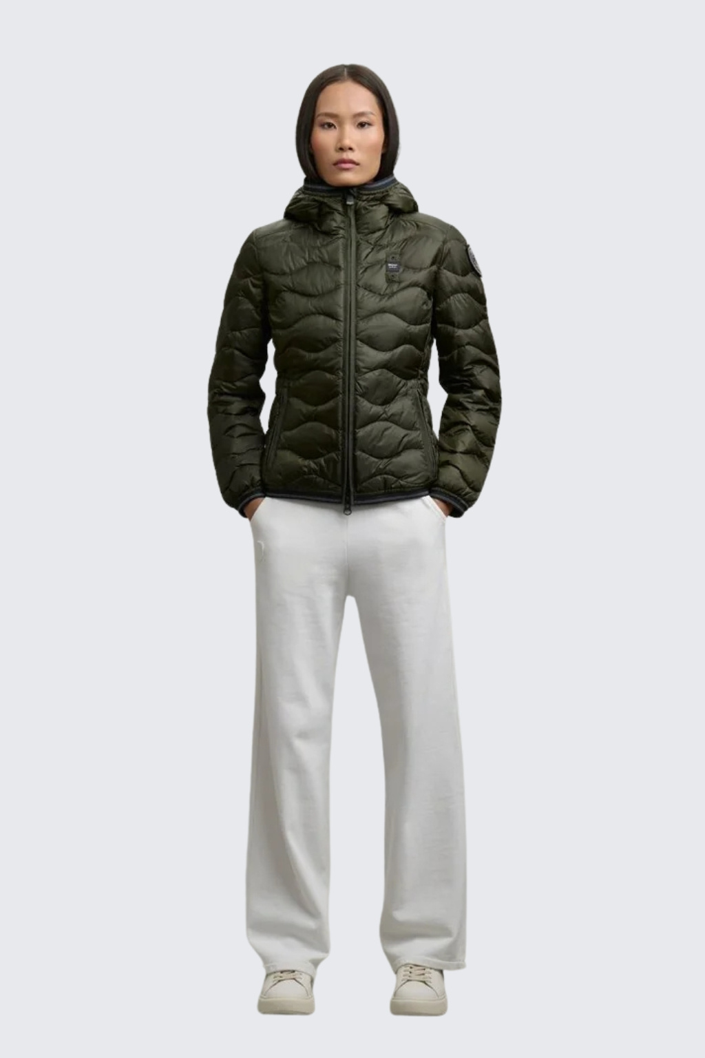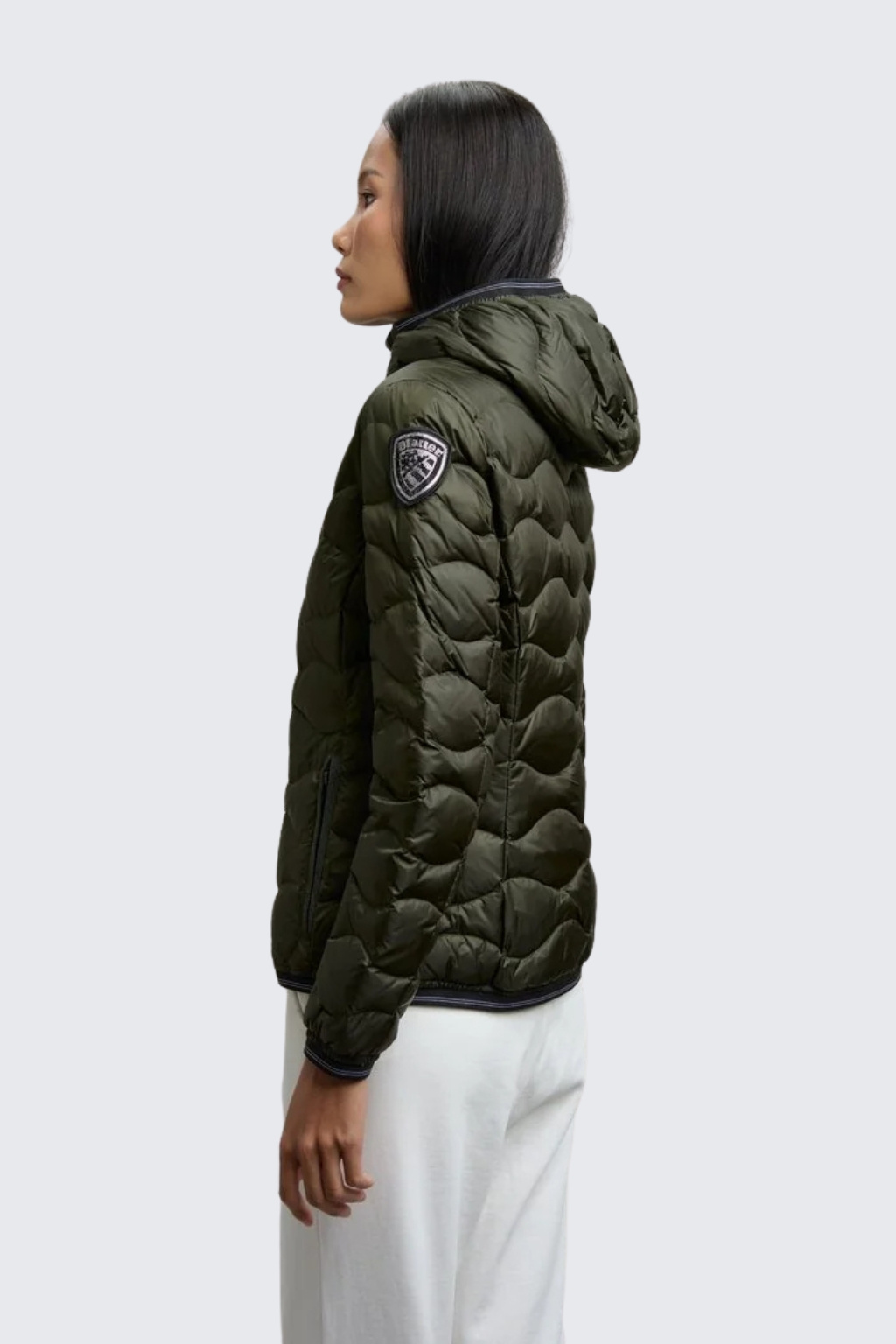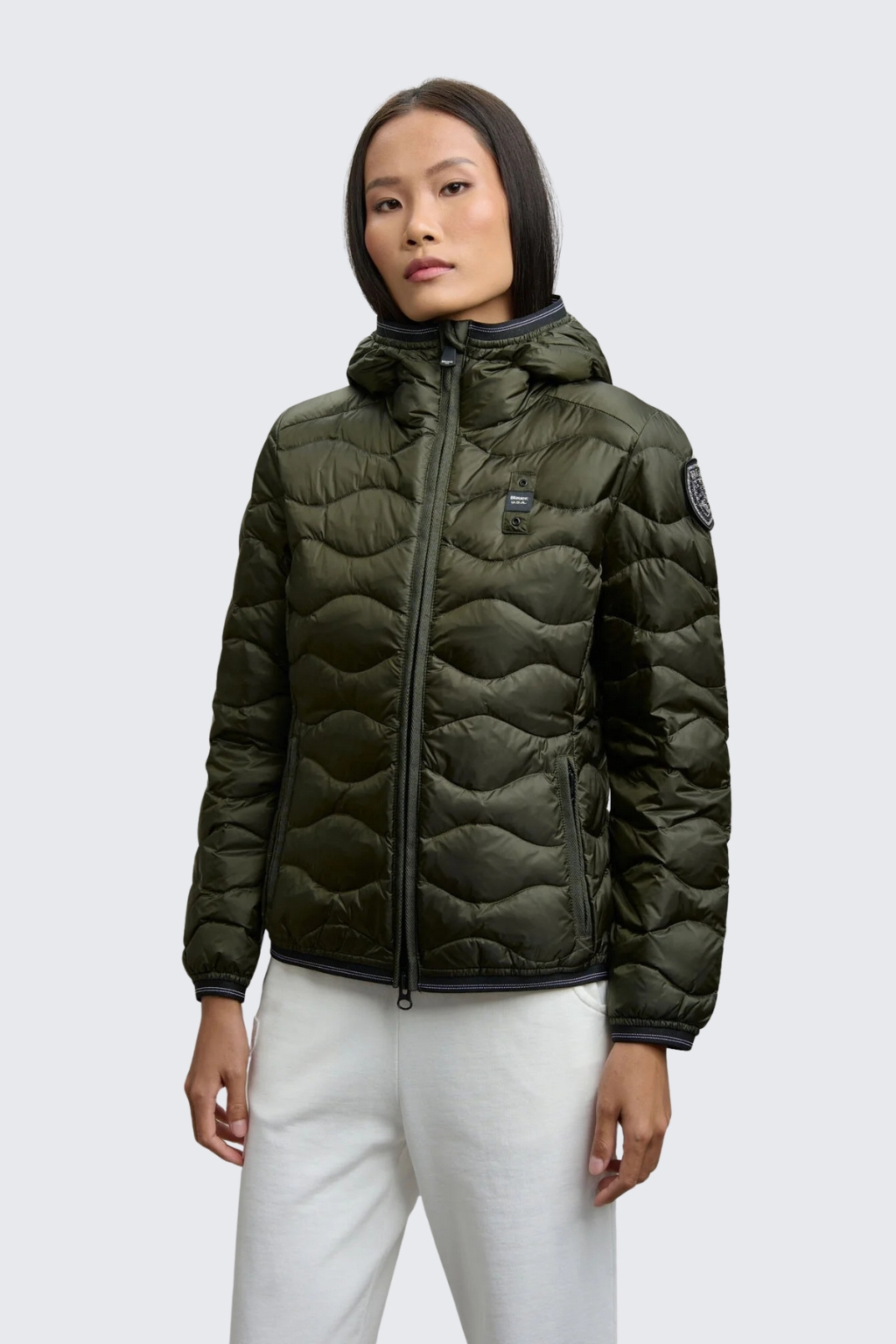 Bunda má střih slim fit a je plněná peřím, díky tomu je lehká a zároveň dostatečně teplá. Zapínání je na dvoucestný zip. Bunda má dvě postranní kapsy na zip, kontrastní béžovou podšívku a vlnkovité prošívání. Kapuci, spodní lem bundy a rukávů zdobí elastická guma. Logo značky je umístěno na levé straně hrudi a na levém rukávu je typický erb BLAUER zdobený kamínky Swarovski na suchý zip, který můžete lehce odejmout a mít pouze černé logo BLAUER. Jedná se o klasický, nadčasový kousek, který se hodí ke každému outfitu a neomrzí vás.