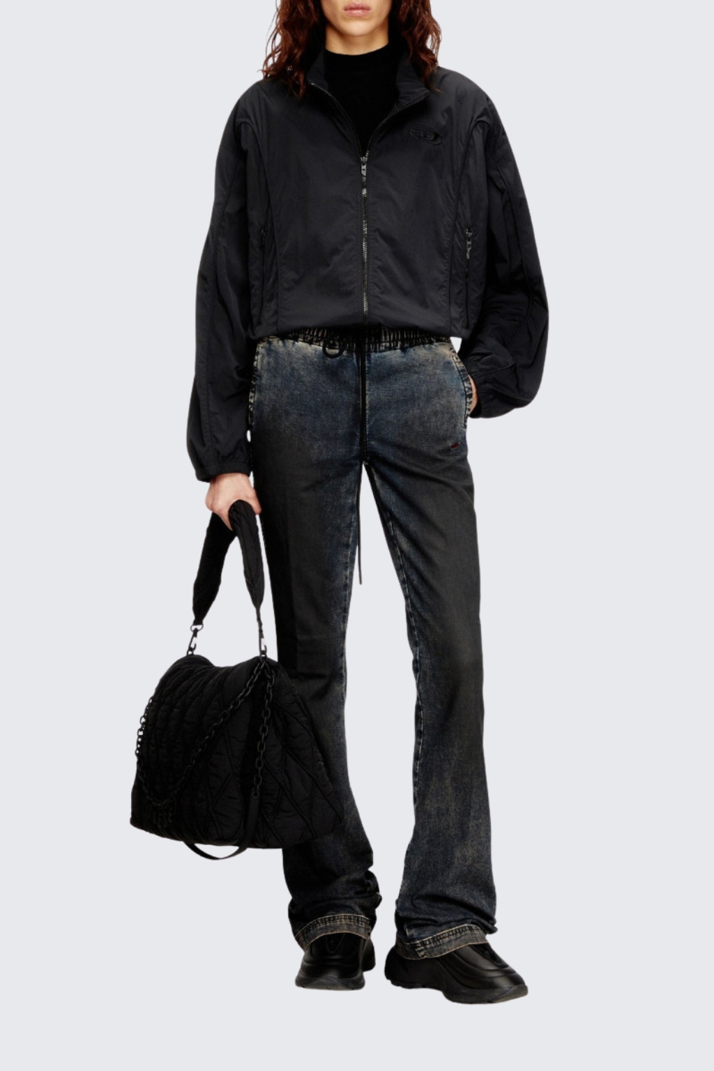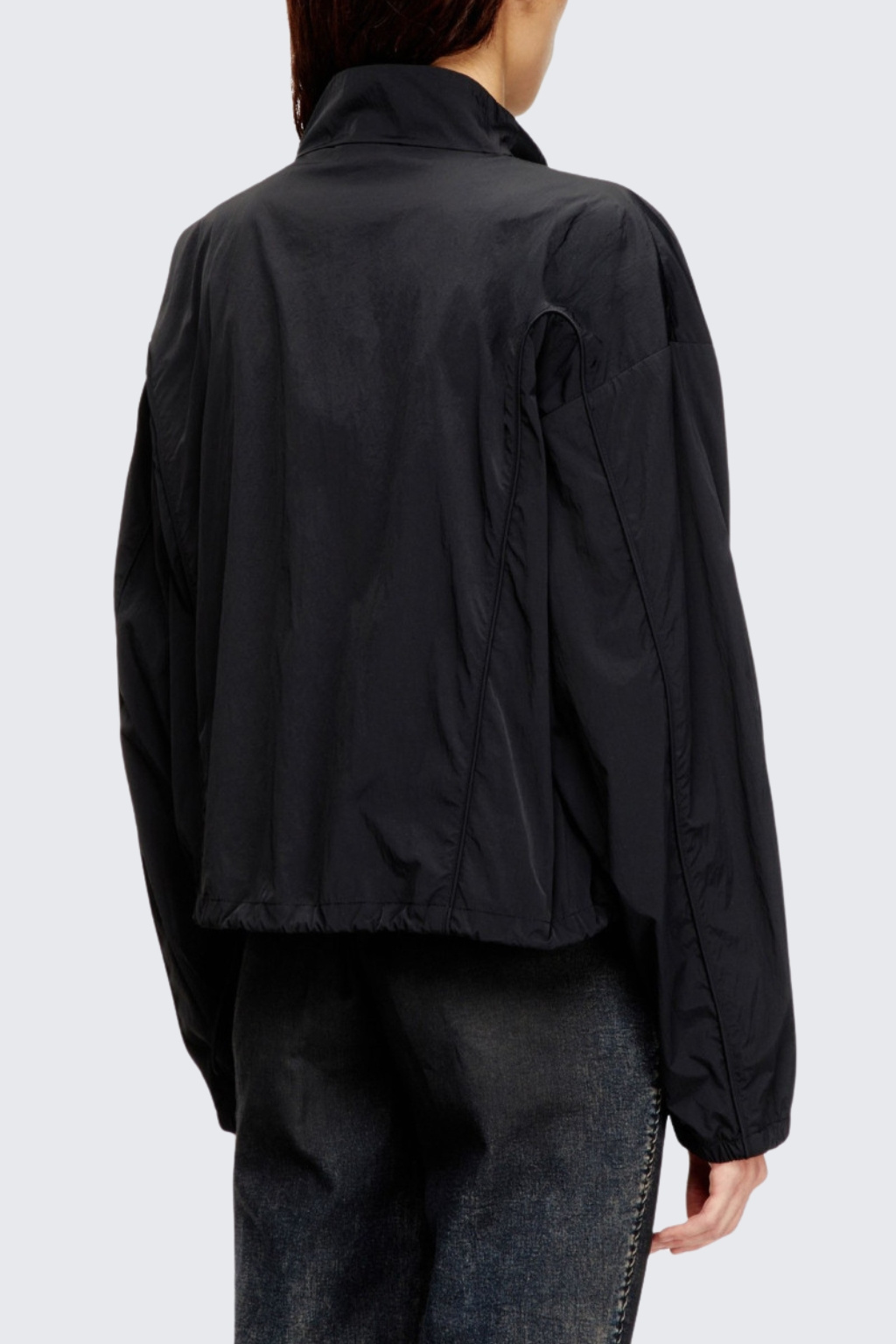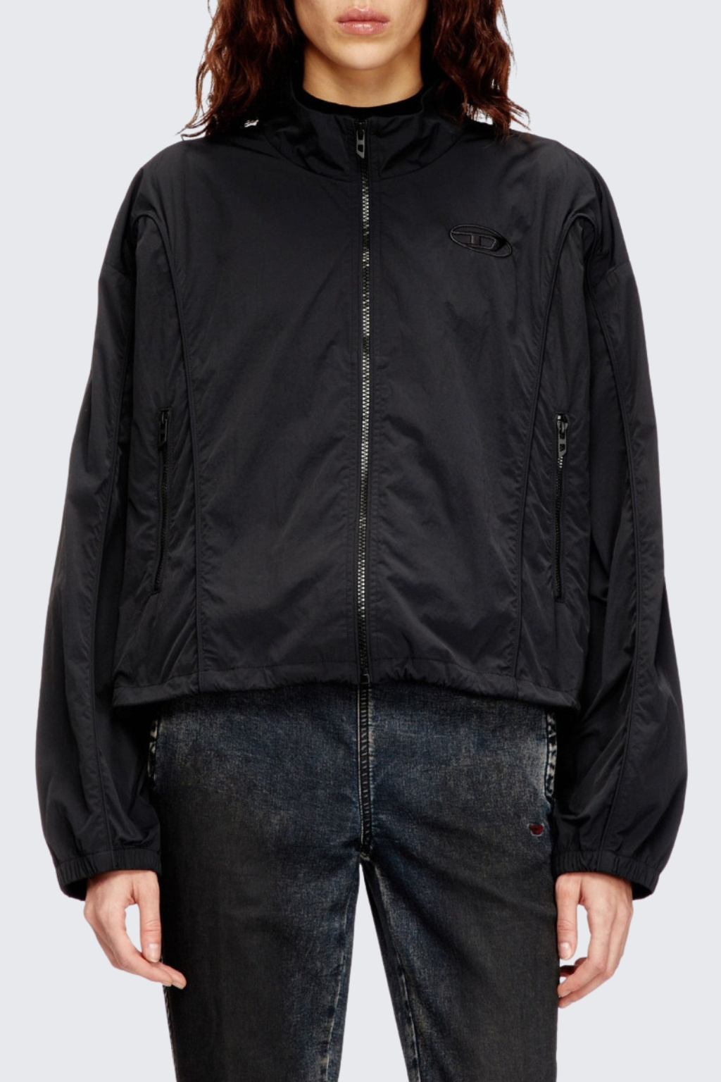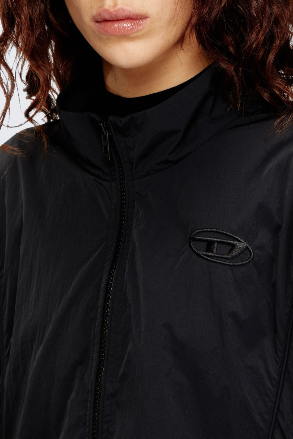 Dámská bunda značky DIESEL má zkrácenou délku, volnější střih a dlouhé rukávy. Model má stojáček a zapínání po celé své délce na zip. Má sníženou linii ramen a vespod rukávů manžetu. Na hrudi je vlevo malé logo značky DIESEL. Po stranách jsou dvě kapsy na zip.