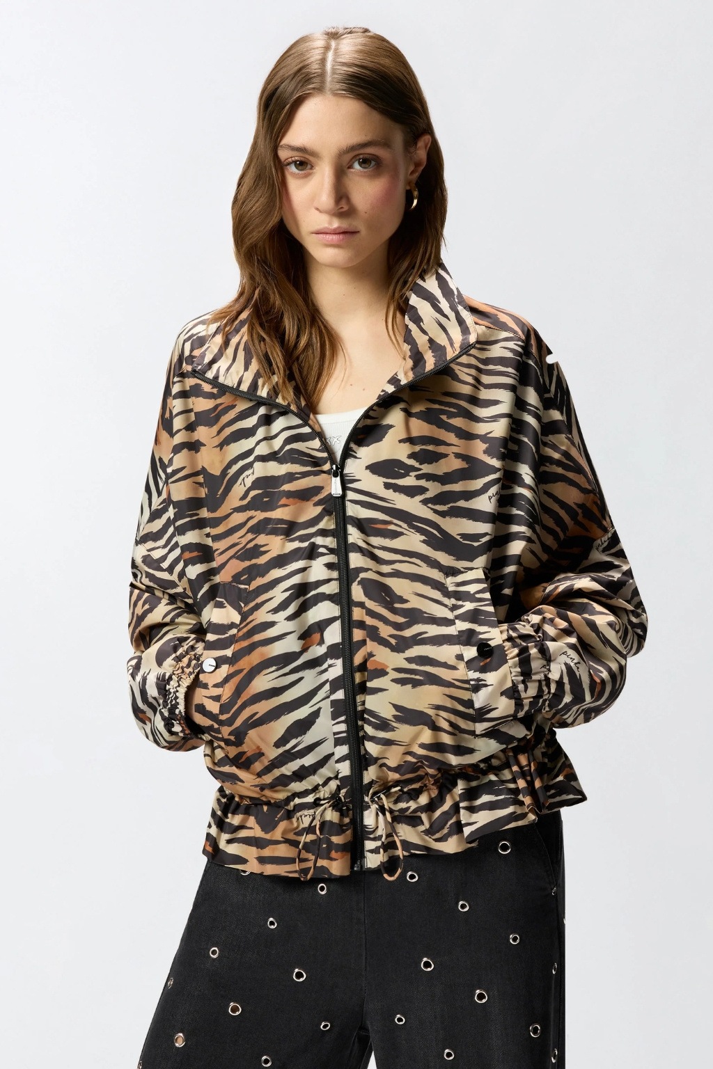 Dámská bunda značky PINKO je vyrobena z podšitého technického plátna s vysokým límcem a dvěma bočními kapsami na knoflíky. Model má standardní délku a dlouhé rukávy s manžetou na koncích. Vespod bundičky je stahovací šňůrka. Zapínání je po celé své délce na zip. Model má výrazný celoplošný tygří vzor.