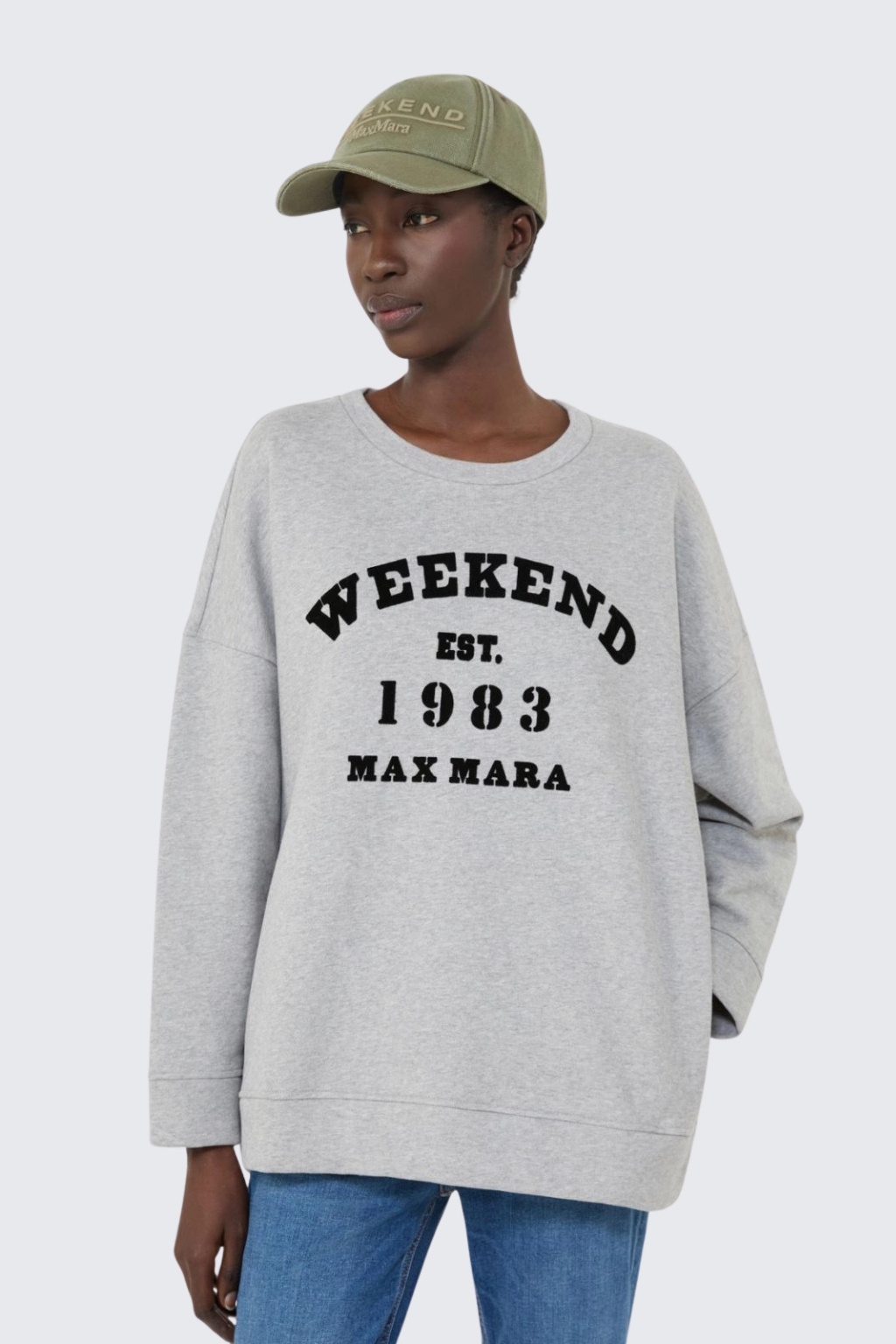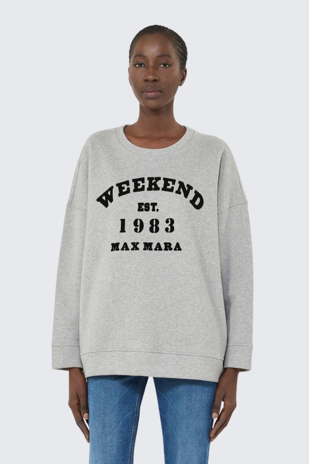 Dámská mikina značky MaxMara je vyrobena z bavlněného, velmi příjemného materiálu. Model má volný střih a je dlouhý až k bokům. Má dlouhé rukávy a klasický, kulatý výstřih. Spodní lem a konce rukávů jsou zakončeny žebrovanou manžetou. Rukávy mají sníženou linii ramen a na přední straně je velký kontrastní potisk s nápisem značky MaxMara WEEKEND.