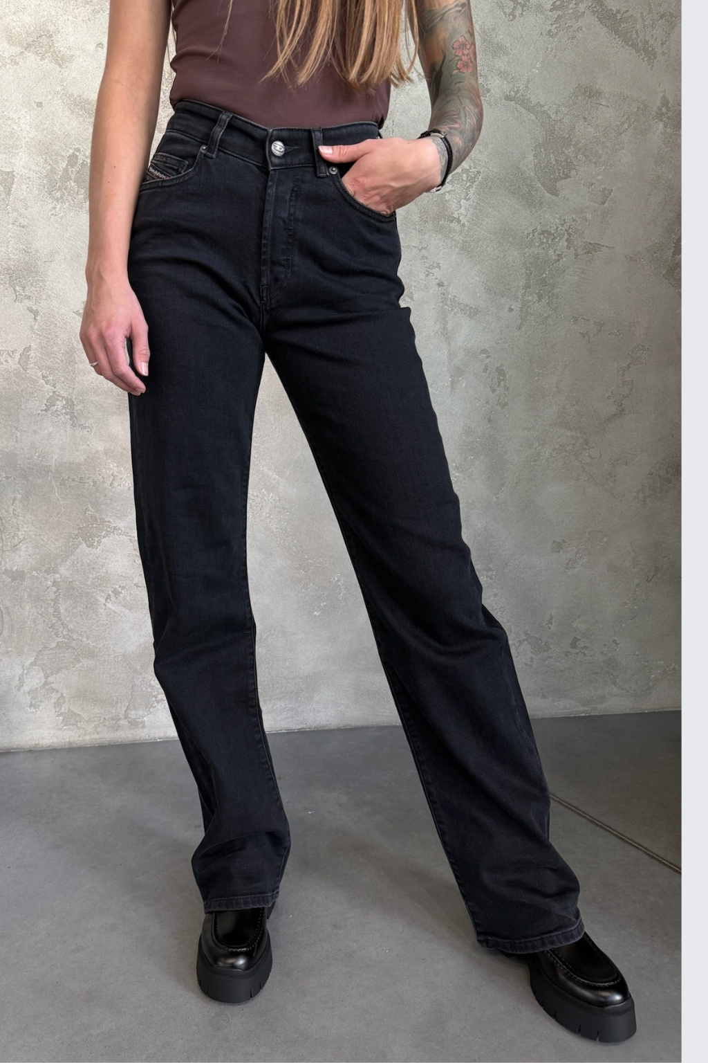 Dámské džíny značky DIESEL mají široké, dlouhé nohavice. Model má vysoký pas a je navržen tak, aby vytvářel tvar V vpředu. Kalhoty se zapínají na zip a knoflík a v pase jsou poutka pro doplnění opasku. Mají pět kapes, tři na přední straně a dvě zezadu. Na zadní straně je v pase kožená nášivka s logem značky DIESEL.