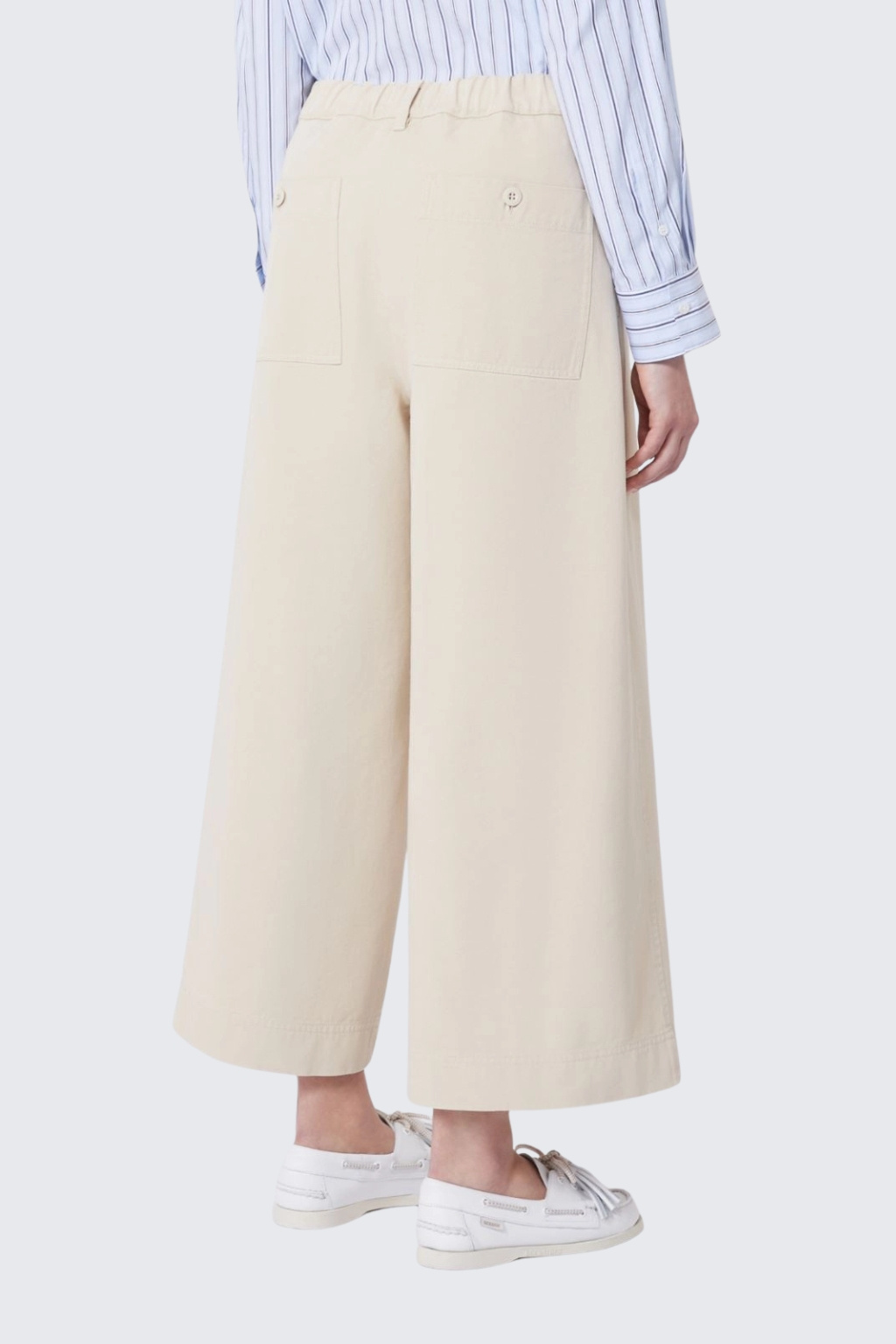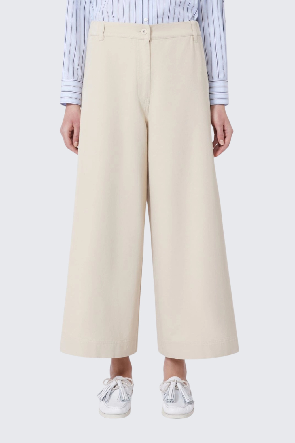 Dámské kalhoty značky MaxMara jsou vyrobeny z čisté bavlny. Model má vysoký pas a zkrácenou délku. Nohavice jsou široké a v pase je manžeta se zapínáním na zip a knoflík. V manžetě jsou poutka pro doplnění opasku. Po stranách jsou dvě všité boční kapsy a na zadní straně dvě na knoflík.
