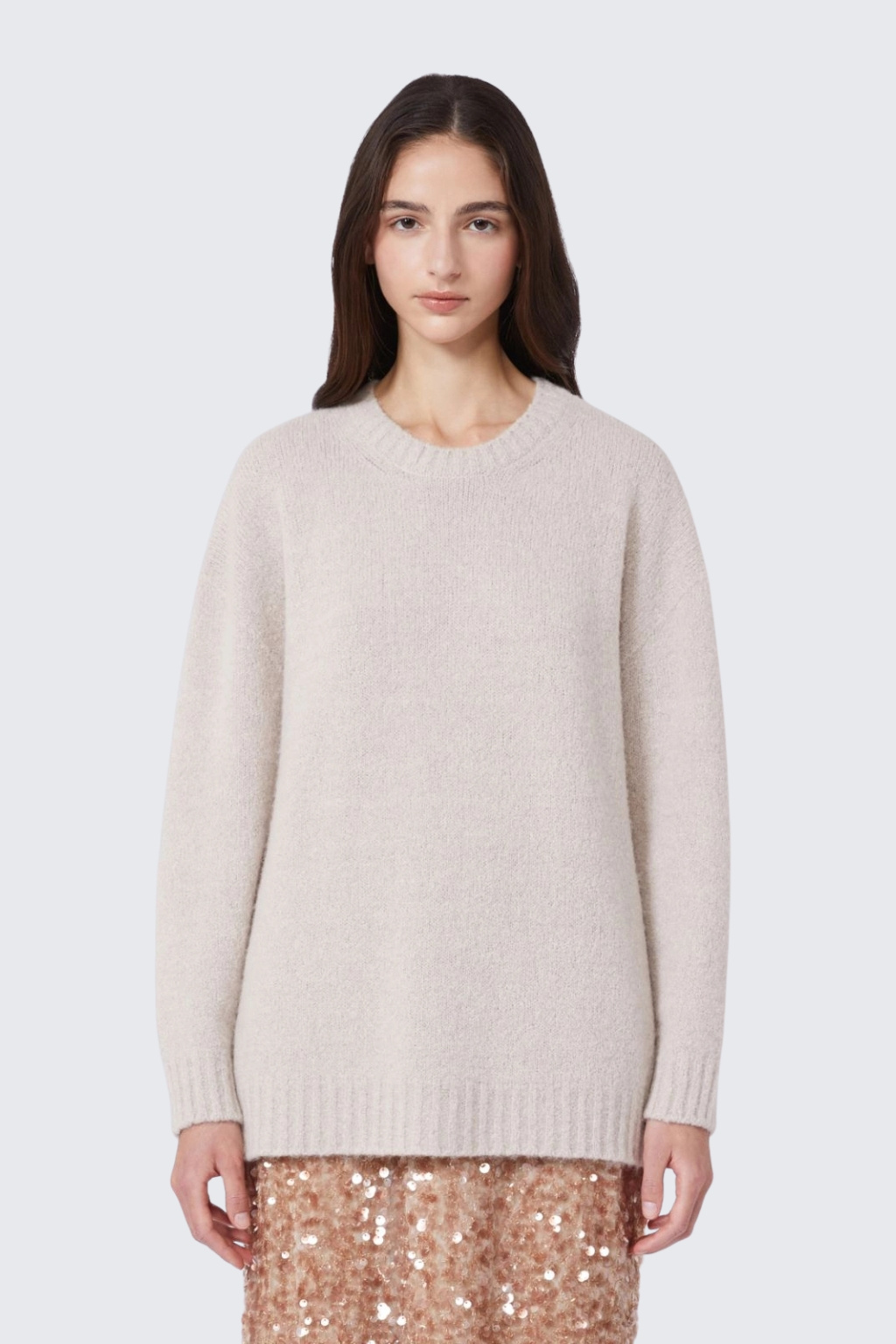 Dámský svetr značky MaxMara je vyrobený z alpaky a bavlněné příze. Model má volný střih a je dlouhý až k bokům. Má dlouhé rukávy a klasický, kulatý výstřih. Spodní lem a konce rukávů jsou zakončeny žebrovanou manžetou.