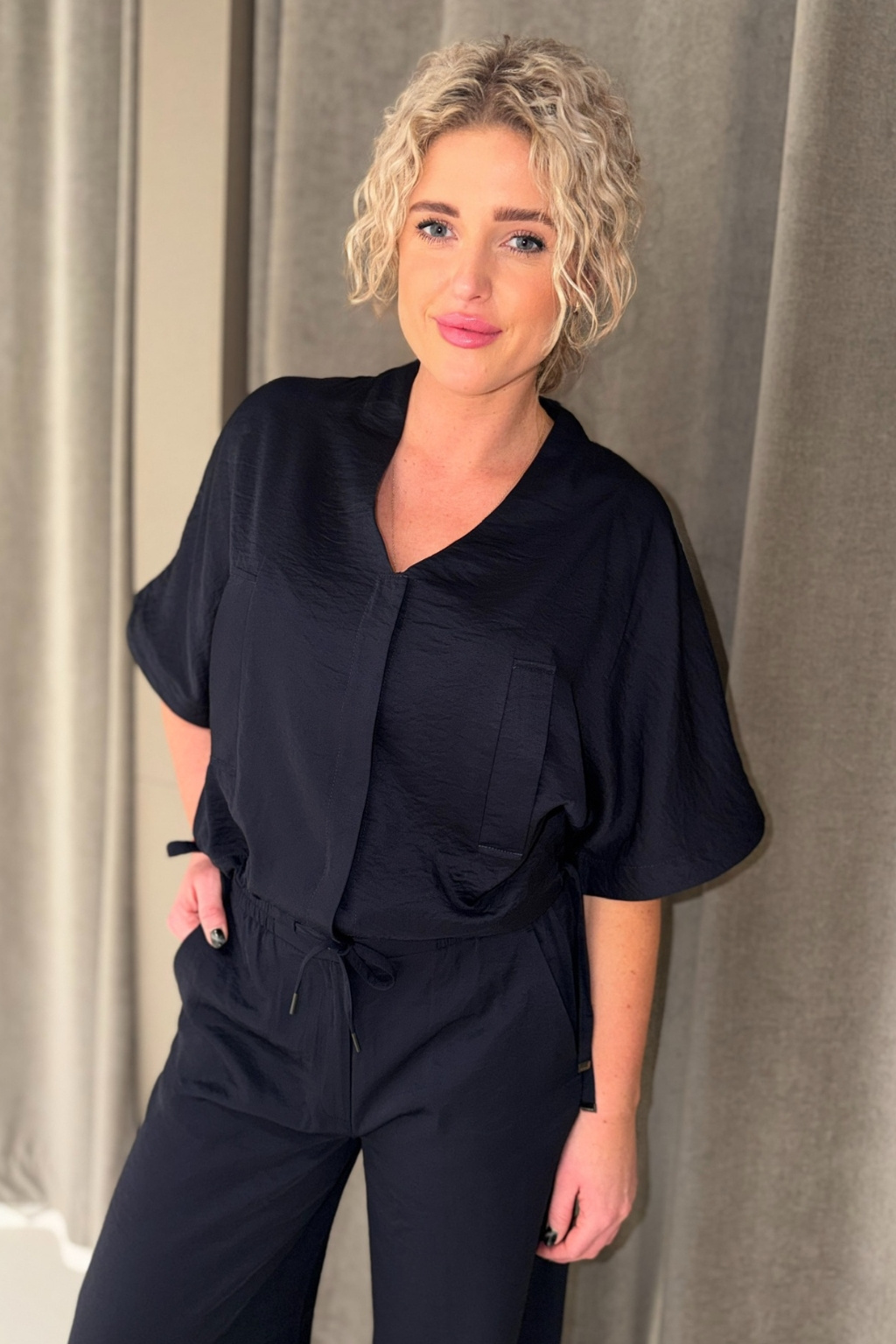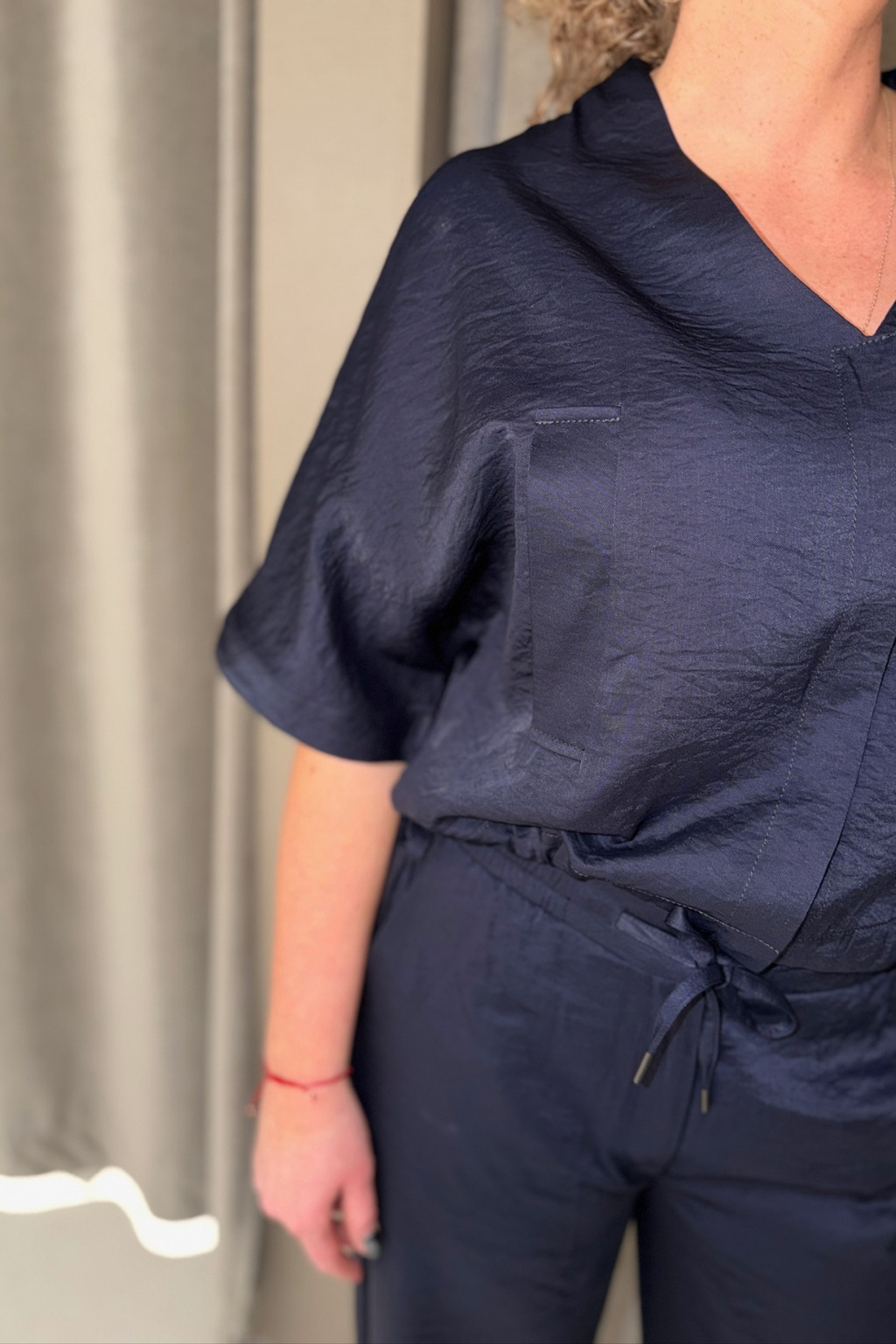 Dámský top značky BEAUMONT má zkrácenou délku a krátké rukávy. Model má véčkový výstřih a po stranách dvě průhmatové kapsy. Ve spodním lemu je stahovací šňůrka.