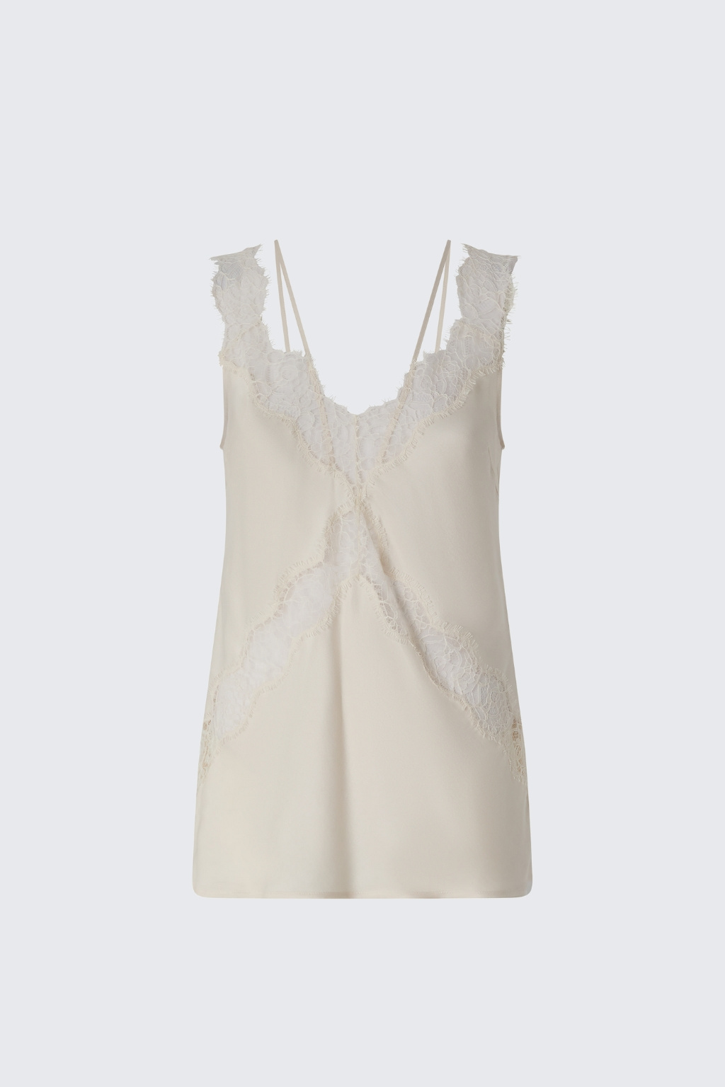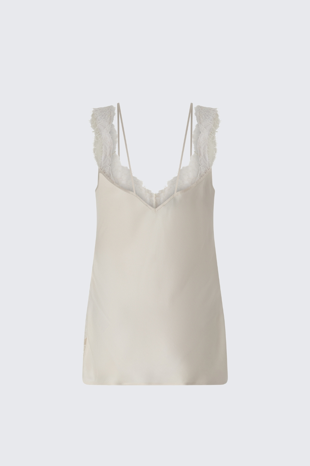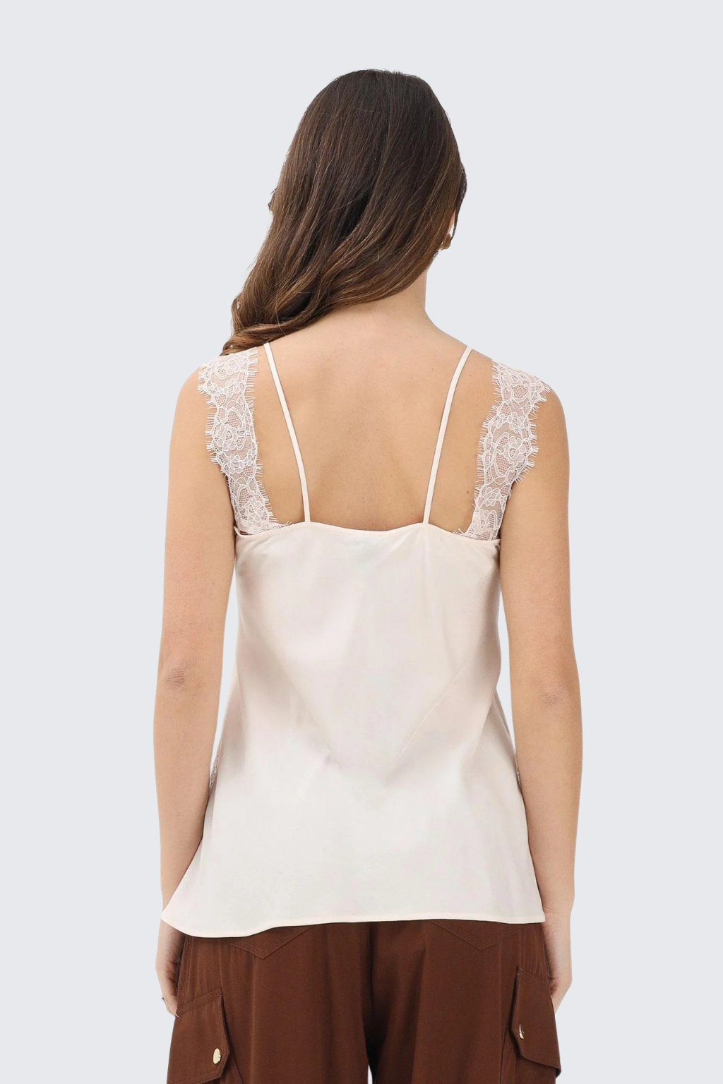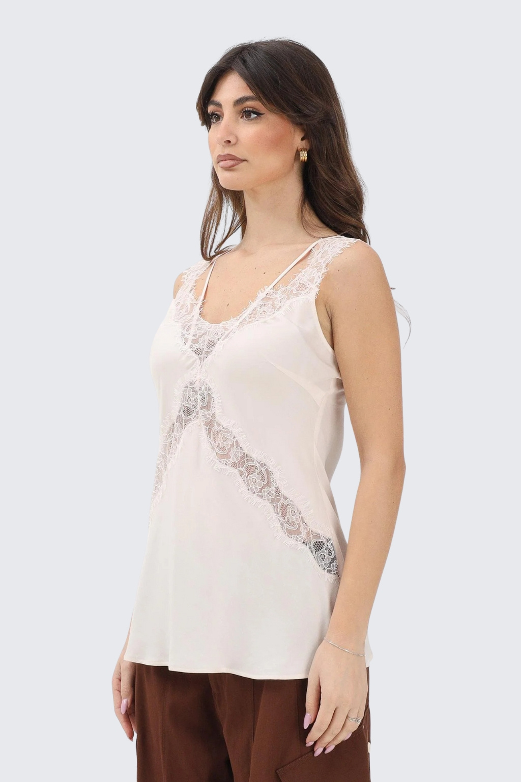 Dámský top značky PINKO má standardní délku a přiléhavý střih. Model má véčkový výstřih, který je zdoben květinovými krajkovými vsadkami. Model má tenká ramínka a krajkové vsadky na ramenou.