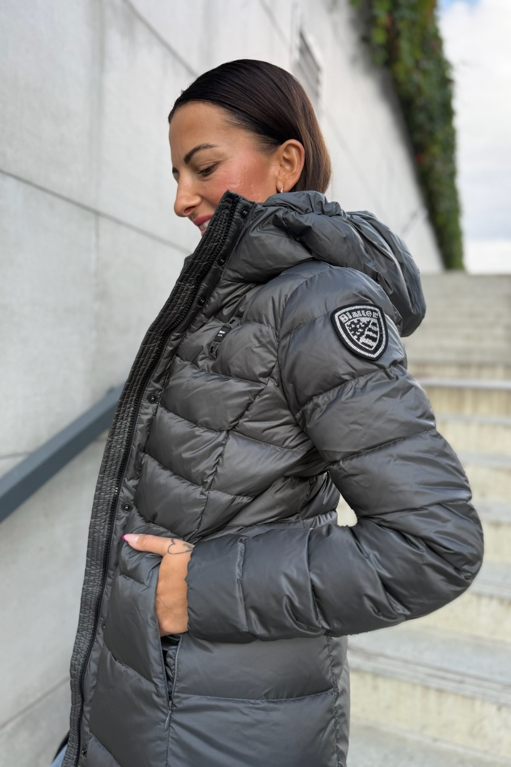 Dámská bunda má délku do půlky lýtek, vodorovné prošívání a je ve střihu slim fit. Bunda je plněná peřím, díky tomu je lehká a zároveň dostatečně teplá. Jedná se o klasický, nadčasový kousek, který se hodí ke každému outfitu. Zapínání je na dvoucestný zip a patentky. Po stranách jsou dvě šikmé kapsy na zip, uvnitř je podšívka v šedé barvě. Logo značky je umístěno na levé straně hrudi a na levém rukávu je typický erb s logem BLAUER zdobený kamínky Swarovski na suchý zip, který můžete odepnout a nosit pouze černé logo BLAUER. Tato dlouhá bunda je každým rokem naším bestsellerem.