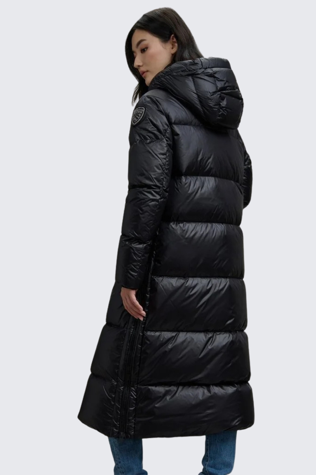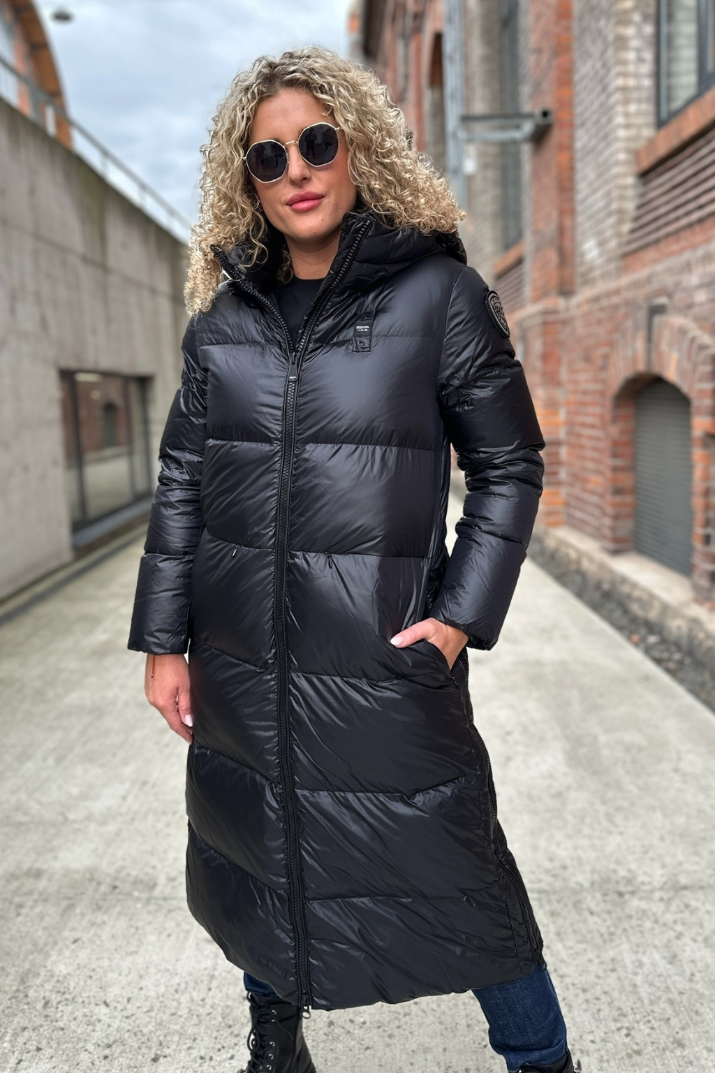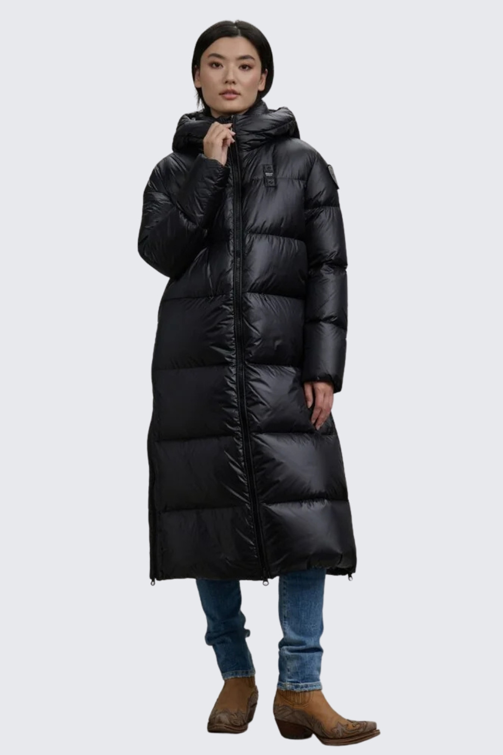 Bunda má délku do půlky lýtek, volnější střih a vysoký límec ke krku s kapucí. Zapínání je na dvoucestný zip, po stranách jsou zipy, díky kterým můžete snadno bundu rozšířit ve spodní části. Bunda má vodorovné prošívání a po stranách dvě skryté kapsy. Na levé straně hrudníku je štítek s logem BLAUER, na levém rukávu je typický erb s logem BLAUER zdobený kamínky Swarovski na suchý zip, který můžete odepnout a nosit pouze černé logo BLAUER.. Bunda je velice příjemná a teplá, zahřeje vás i v té největší zimě.