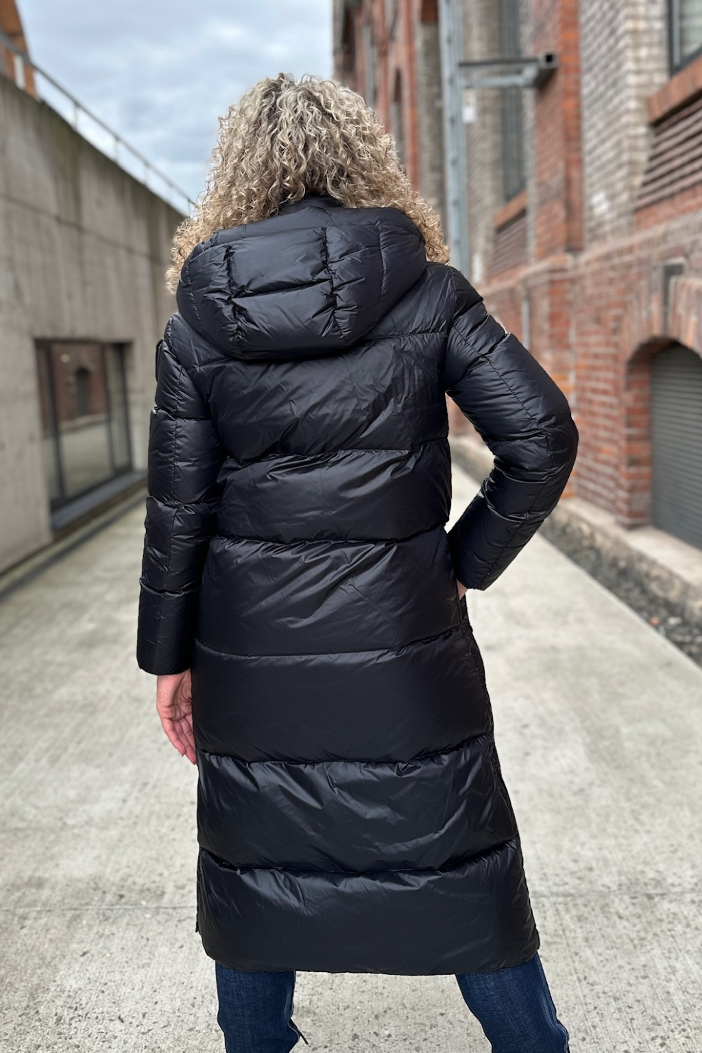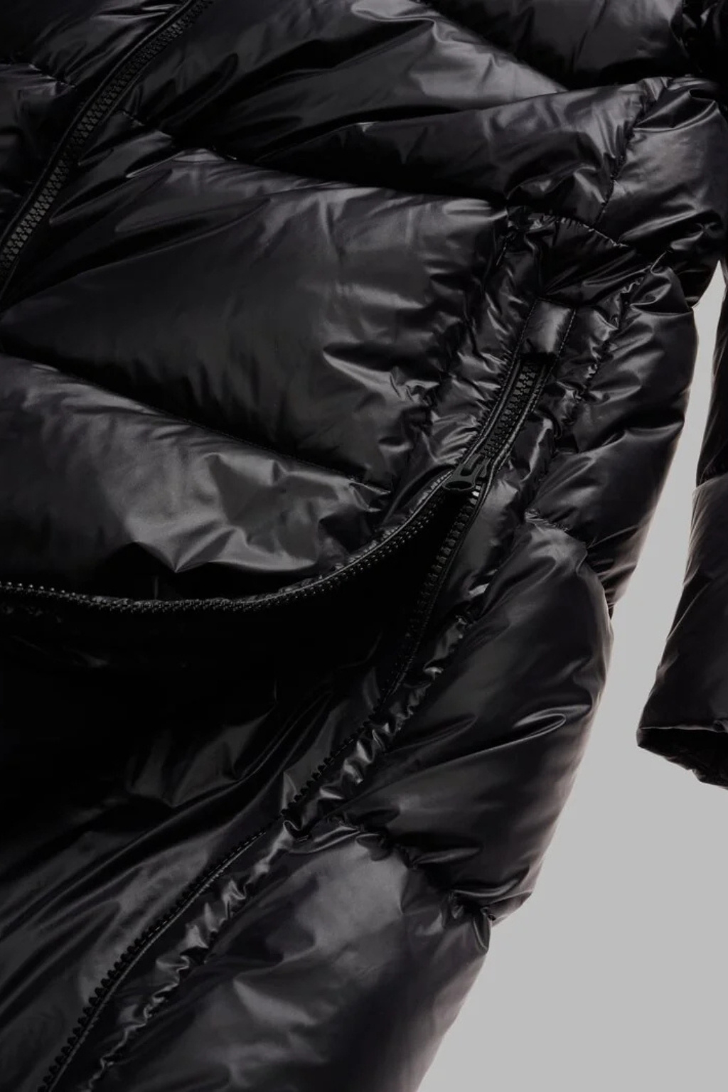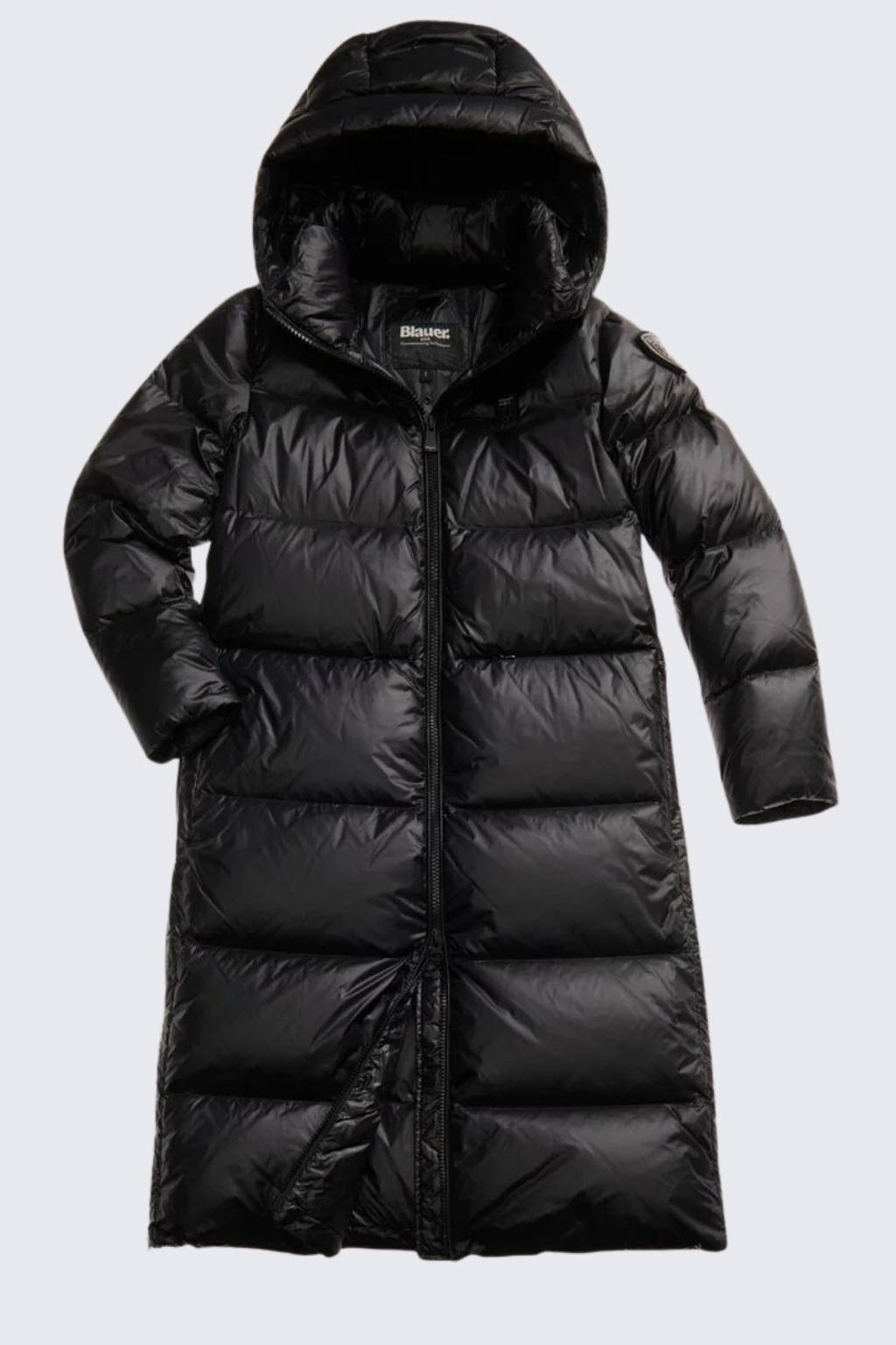 Bunda má délku do půlky lýtek, volnější střih a vysoký límec ke krku s kapucí. Zapínání je na dvoucestný zip, po stranách jsou zipy, díky kterým můžete snadno bundu rozšířit ve spodní části. Bunda má vodorovné prošívání a po stranách dvě skryté kapsy. Na levé straně hrudníku je štítek s logem BLAUER, na levém rukávu je typický erb s logem BLAUER zdobený kamínky Swarovski na suchý zip, který můžete odepnout a nosit pouze černé logo BLAUER.. Bunda je velice příjemná a teplá, zahřeje vás i v té největší zimě.