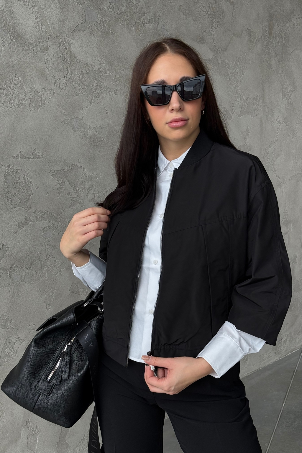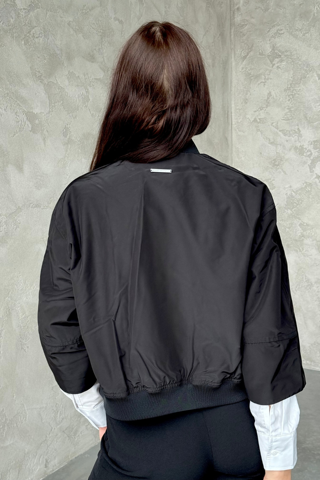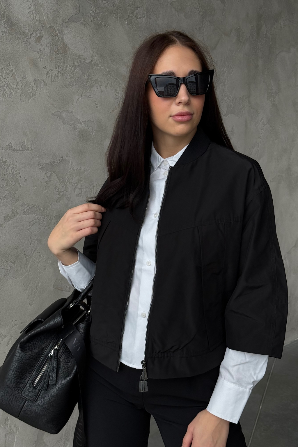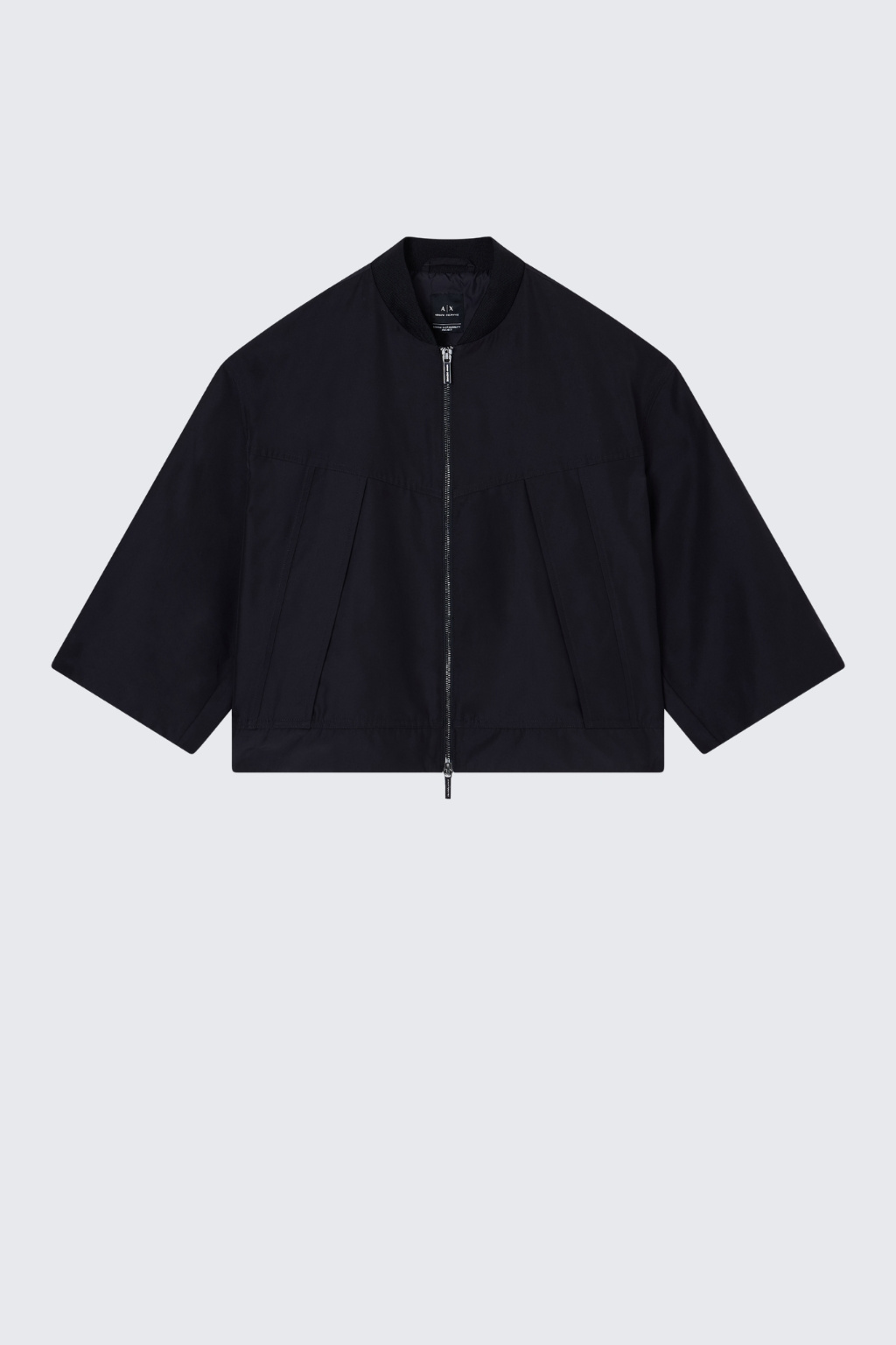 Dámská bunda značky Armani Exchange má zkrácenou délku a 3/4 rukávy se sníženou linií ramen. Model má u krku stojáček a zapínání po celé své délce na dvoucestný zip. Vespod bundy je manžeta a na zadní straně u krku nášivka s logem značky Armani Exchange.