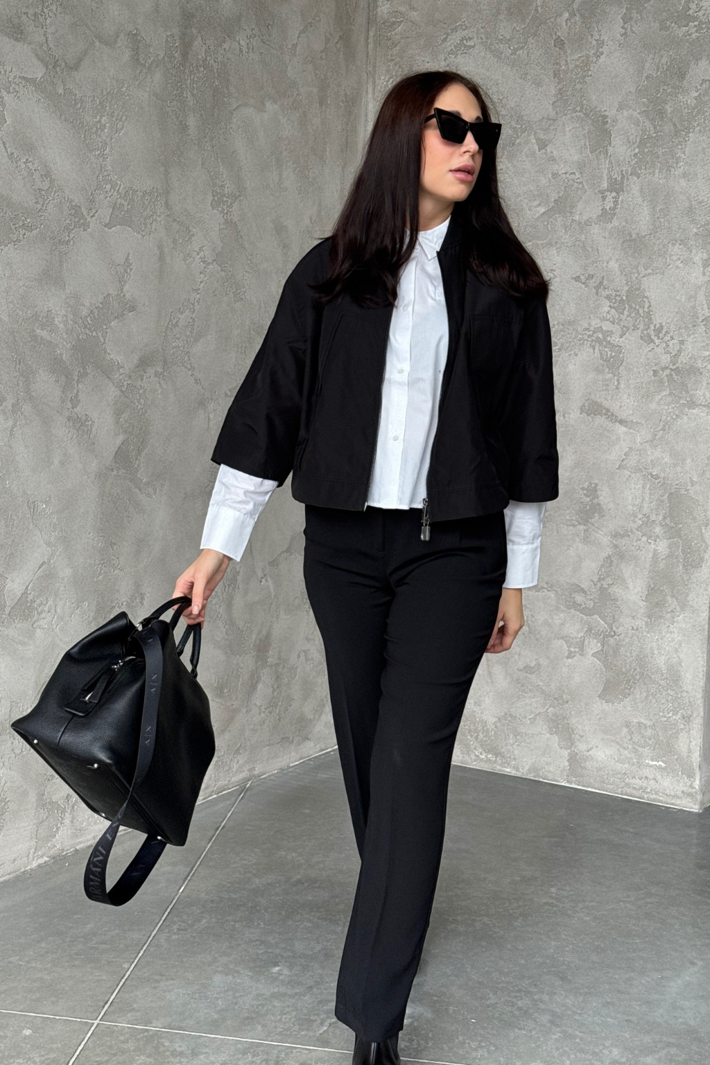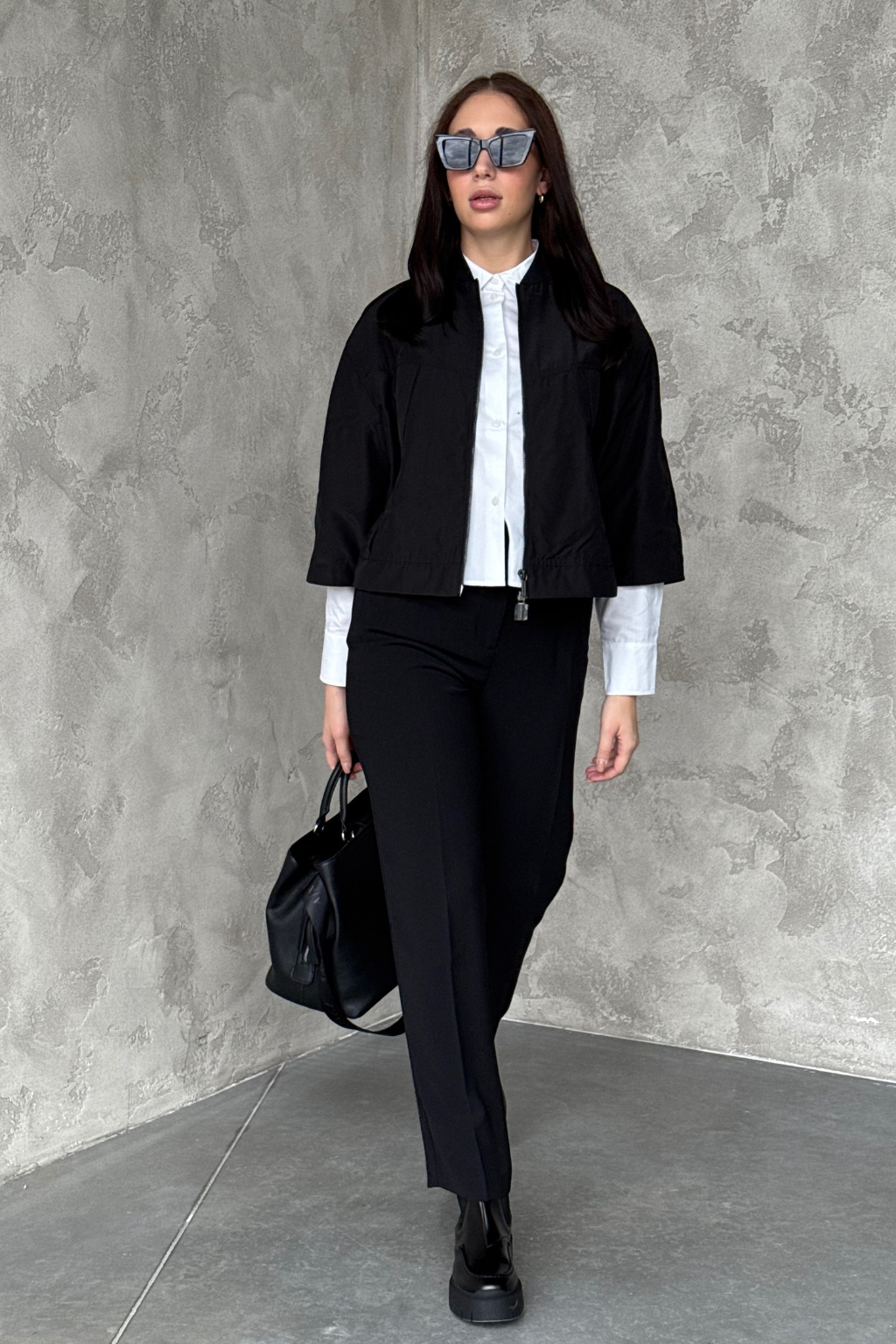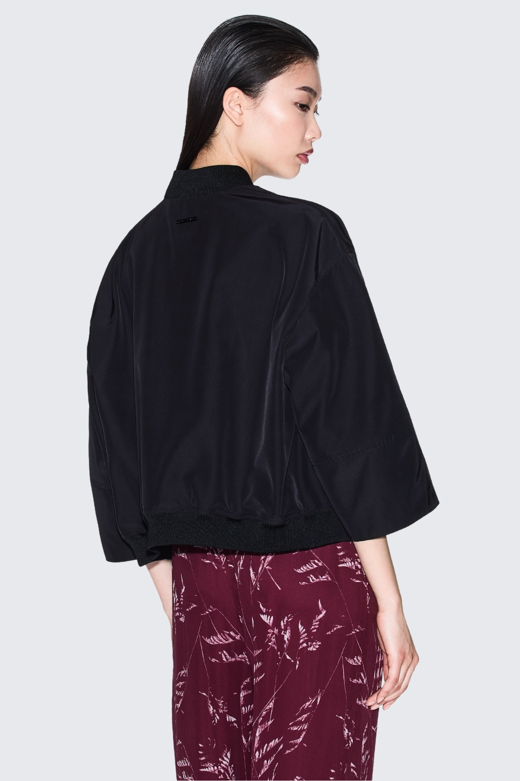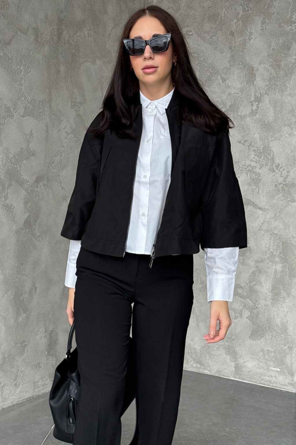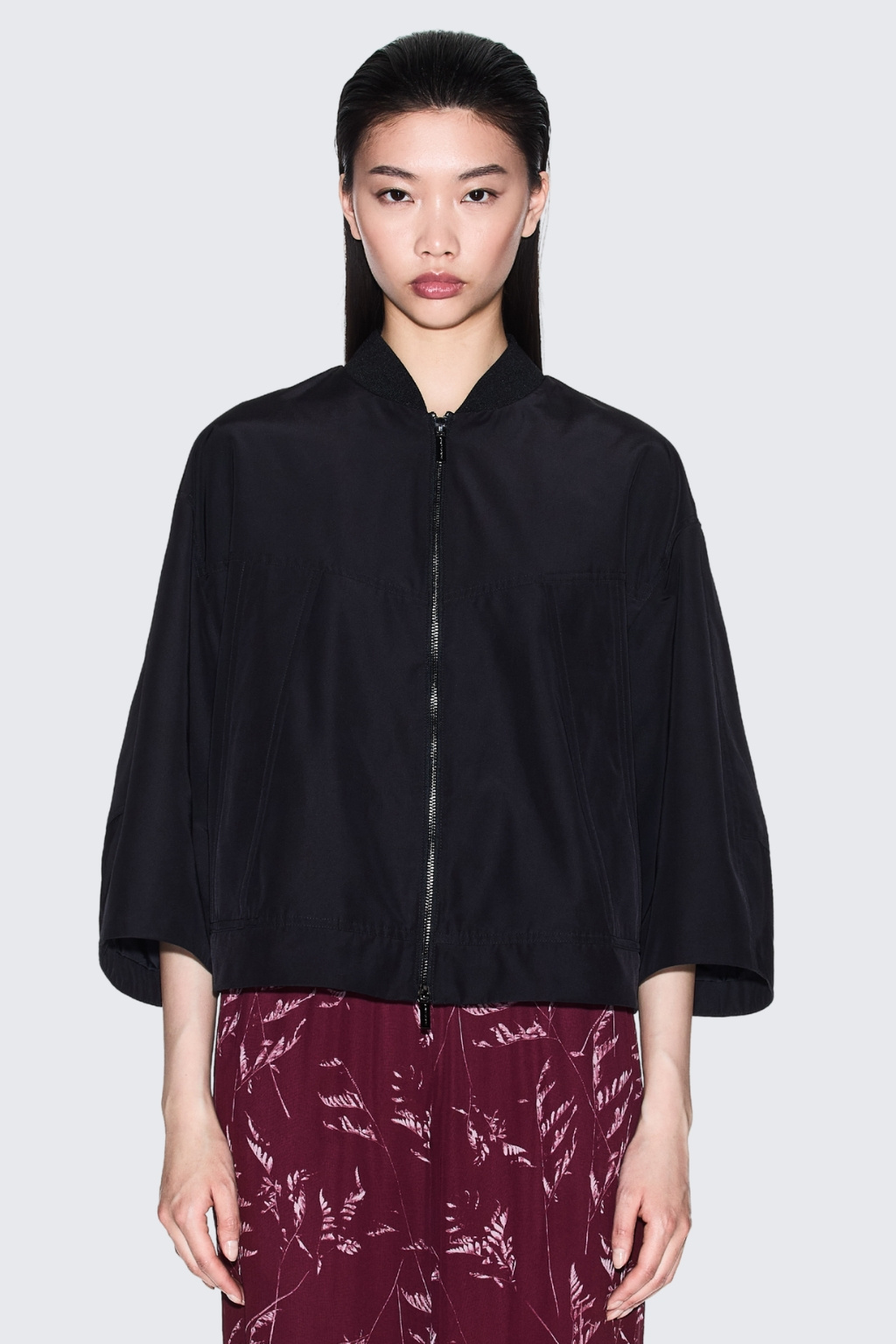 Dámská bunda značky Armani Exchange má zkrácenou délku a 3/4 rukávy se sníženou linií ramen. Model má u krku stojáček a zapínání po celé své délce na dvoucestný zip. Vespod bundy je manžeta a na zadní straně u krku nášivka s logem značky Armani Exchange.