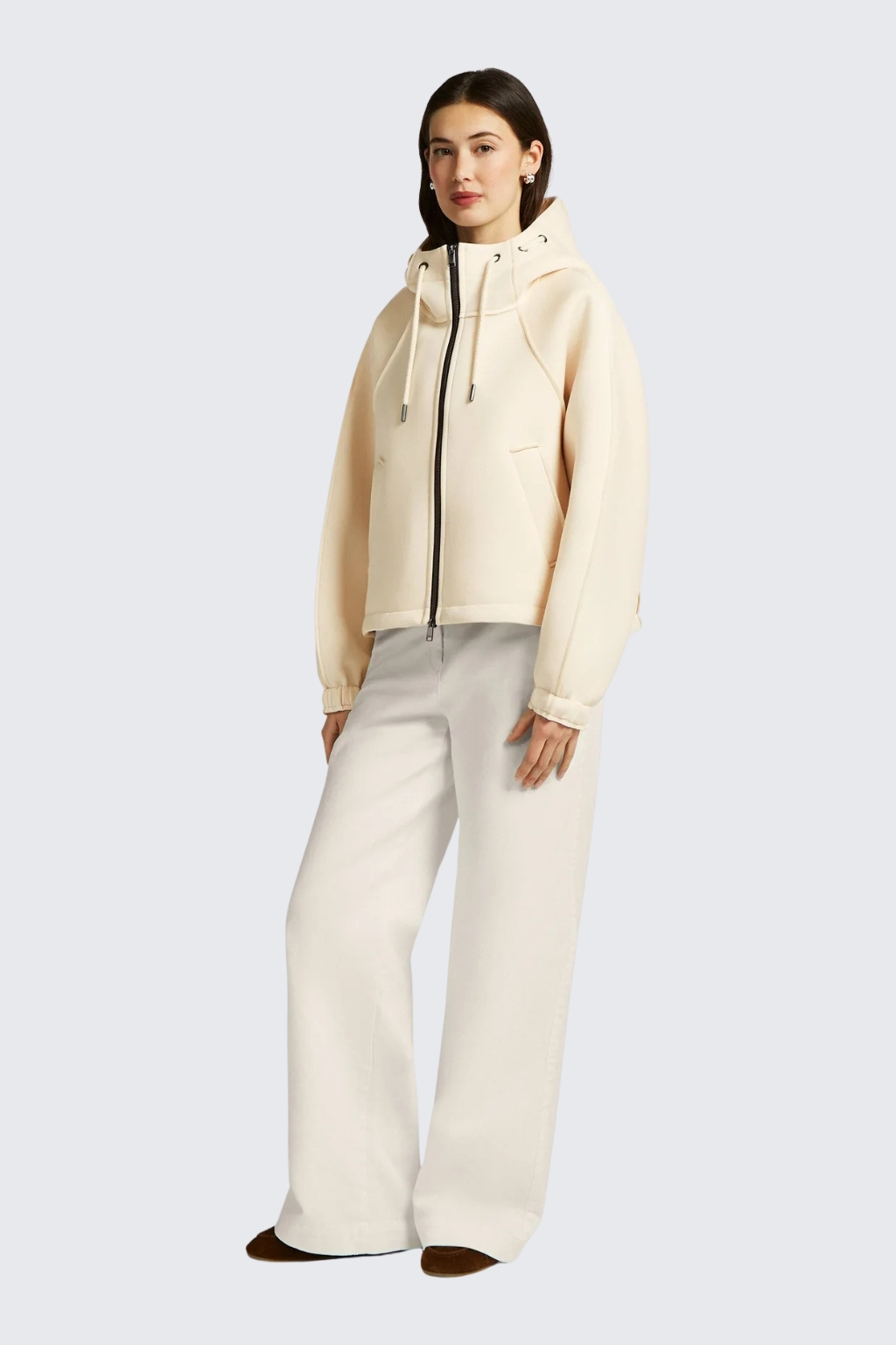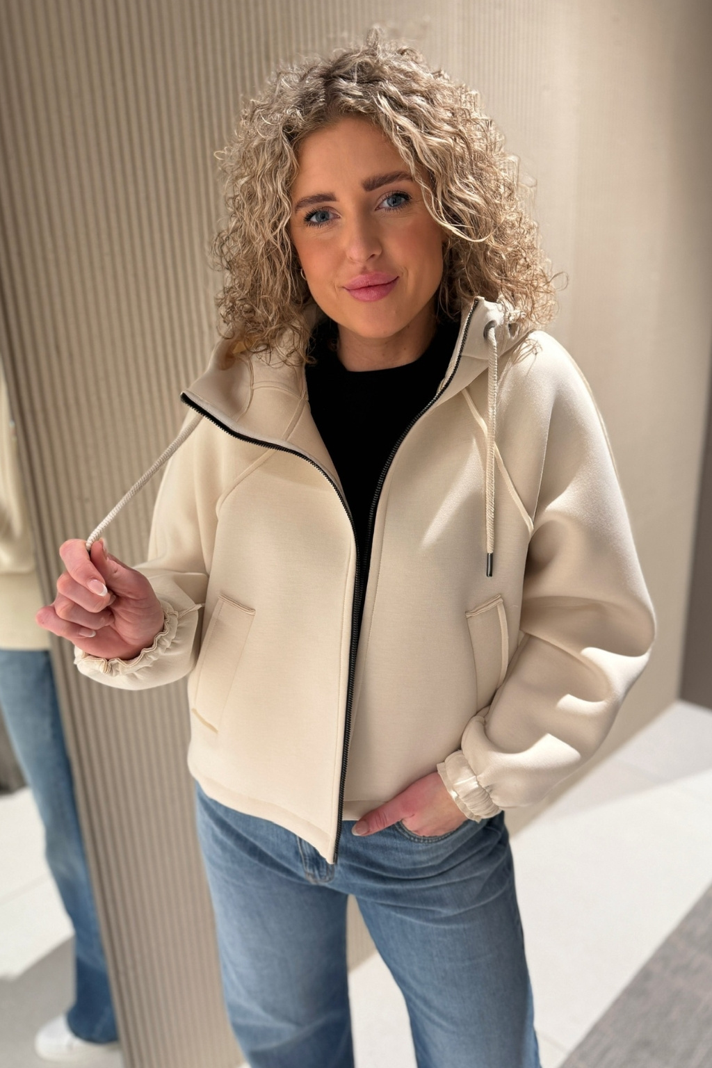 Dámská bunda značky BEAUMONT je příjemného materiálu. Má volný střih a zkrácenou délku. Model má kapuci se stahovací šňůrkou a dlouhé rukávy, které jsou zakončeny žebrovanou manžetou. Bunda má vespod elastický lem a po stranách dvě průhmatové kapsy. Zapínání bundičky je po celé své délce na zip. Na kapuci je malá nášivka s nápisem značky BEAUMONT.