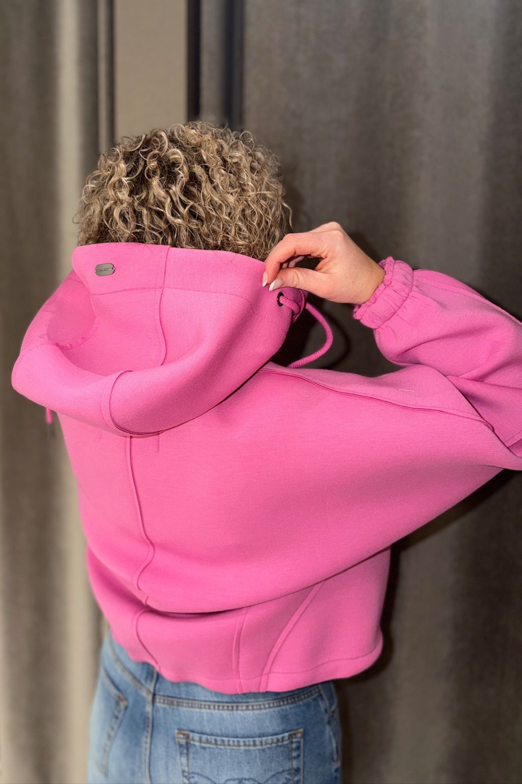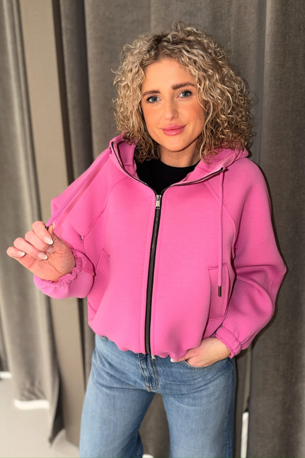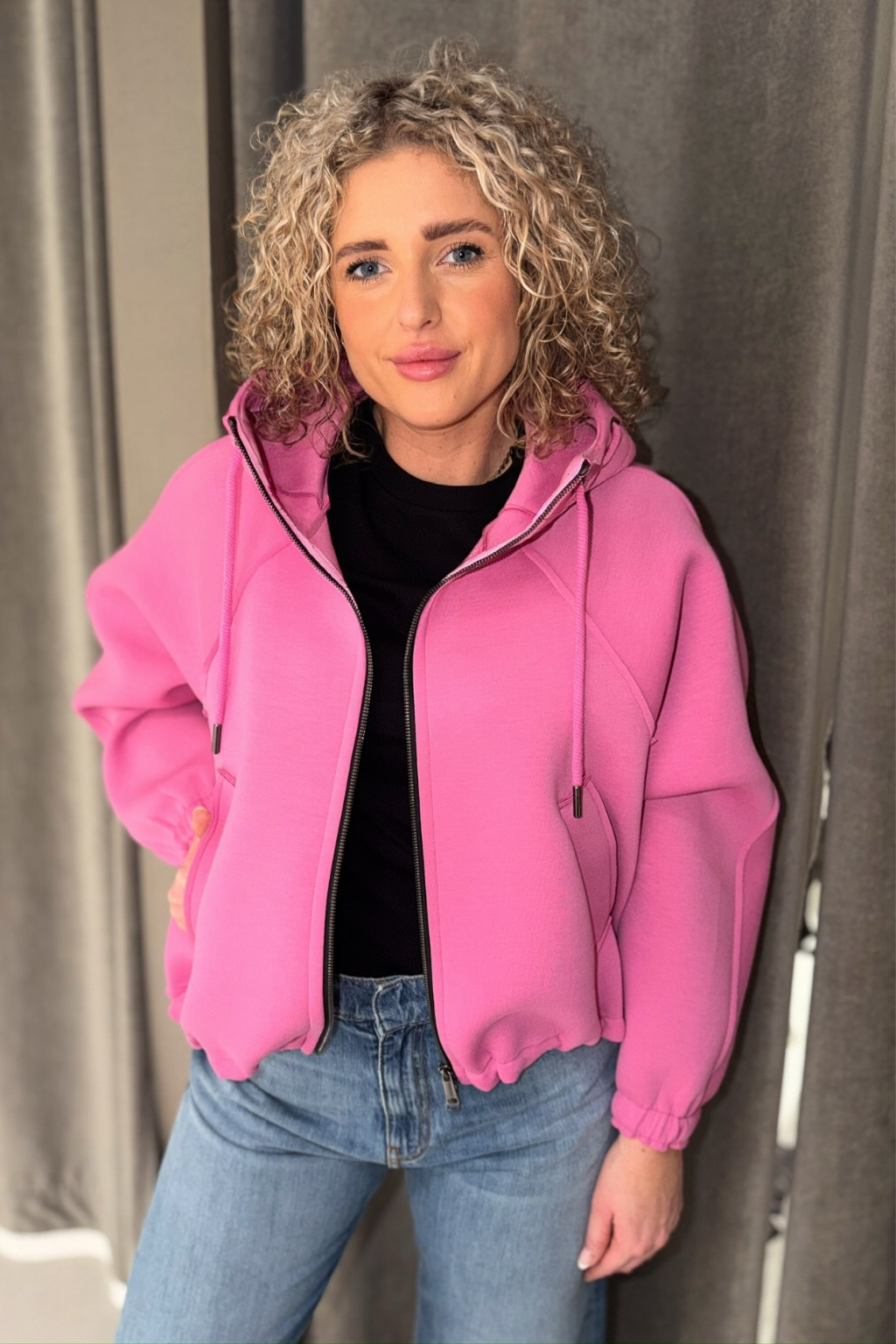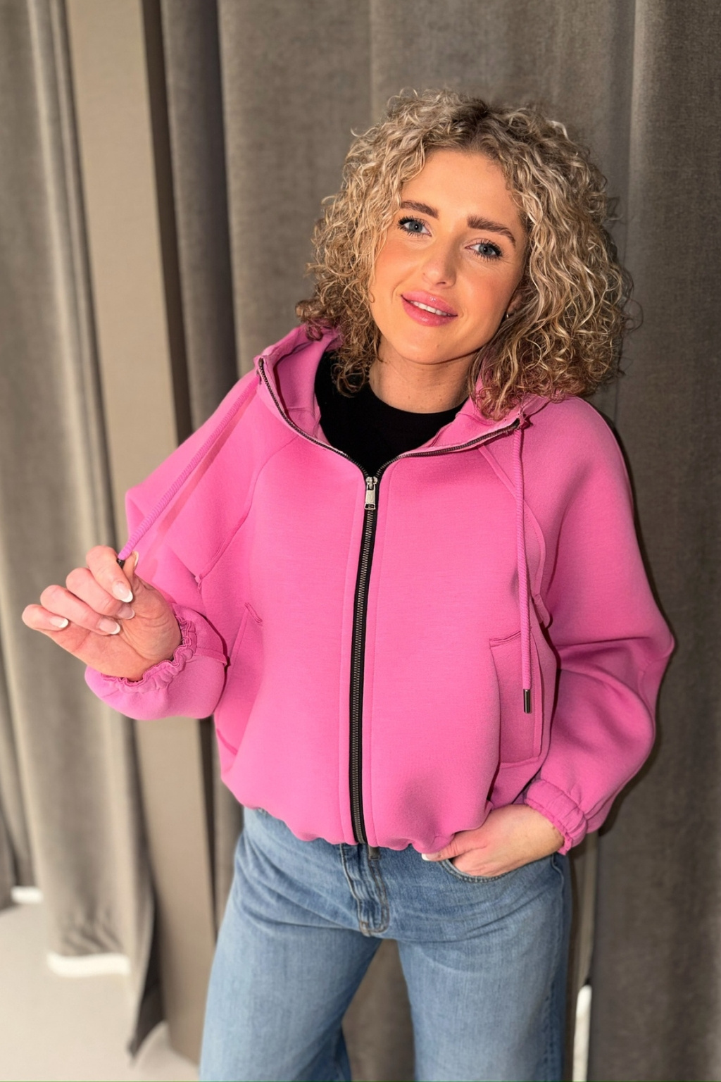 Dámská bunda značky BEAUMONT je příjemného materiálu. Má volný střih a zkrácenou délku. Model má kapuci se stahovací šňůrkou a dlouhé rukávy, které jsou zakončeny žebrovanou manžetou. Bunda má vespod elastický lem a po stranách dvě průhmatové kapsy. Zapínání bundičky je po celé své délce na zip. Na kapuci je malá nášivka s nápisem značky BEAUMONT.
