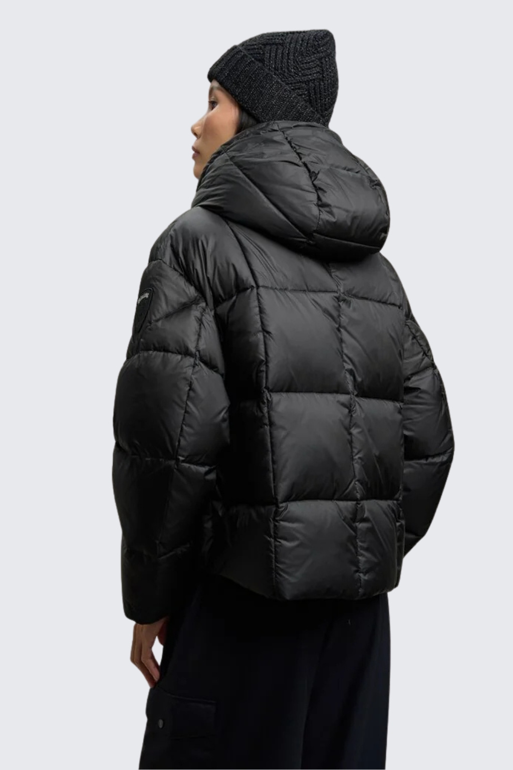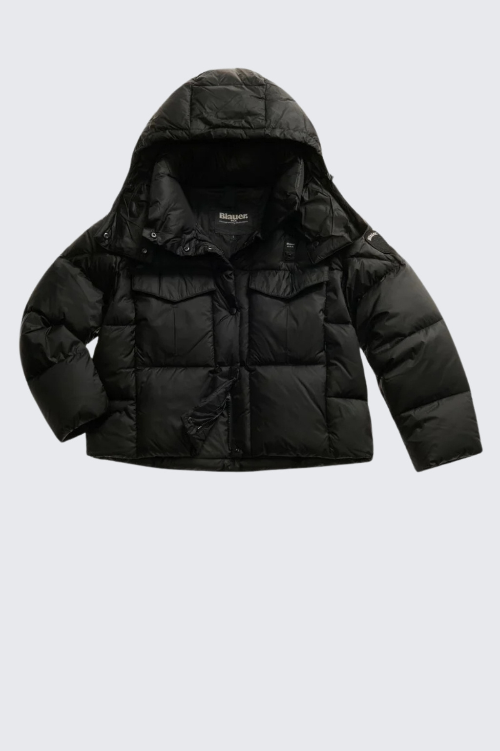 Dámská bunda má kratší délku, čtvercové prošívání a má volný střih. Bunda má odnímatelnou kapuci na zip, zapínání je na dvoucestný zip a druky. Po stranách jsou dvě neviditelné kapsy na zip, na přední straně jsou dvě větší kapsy na druk. Logo značky je umístěno na levé straně hrudi a na levém rukávu je typický erb s logem BLAUER. U krku je vysoký límec a zapínání na tři druky. Jedná se o fashion kousek, který oživí každý outfit.