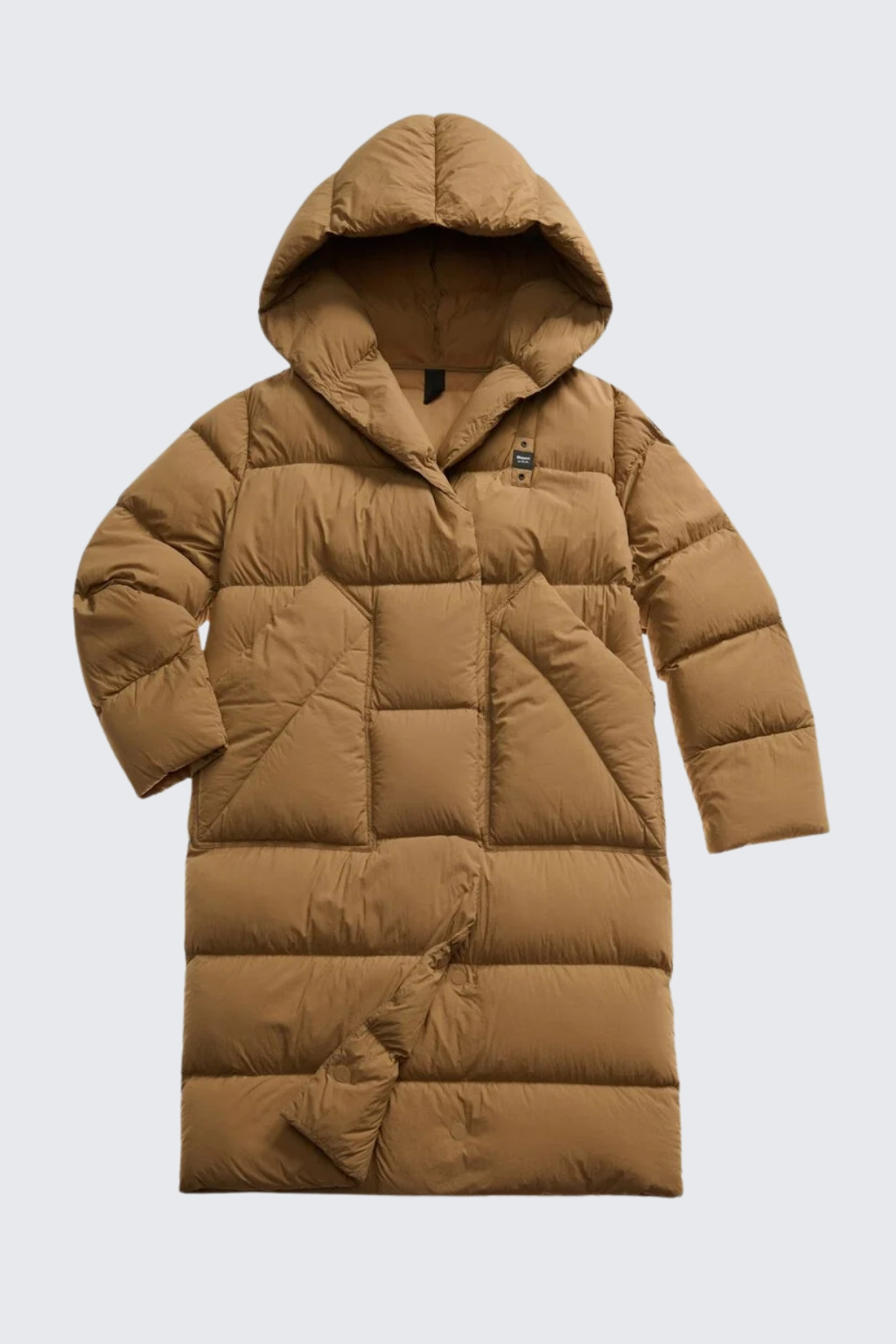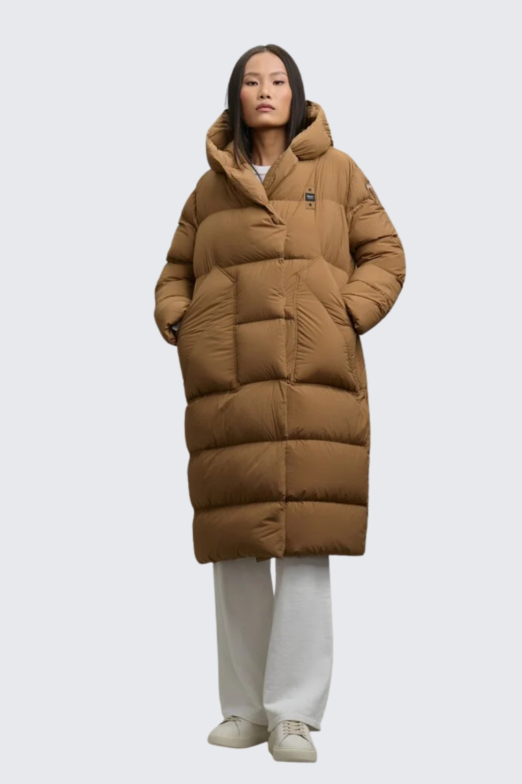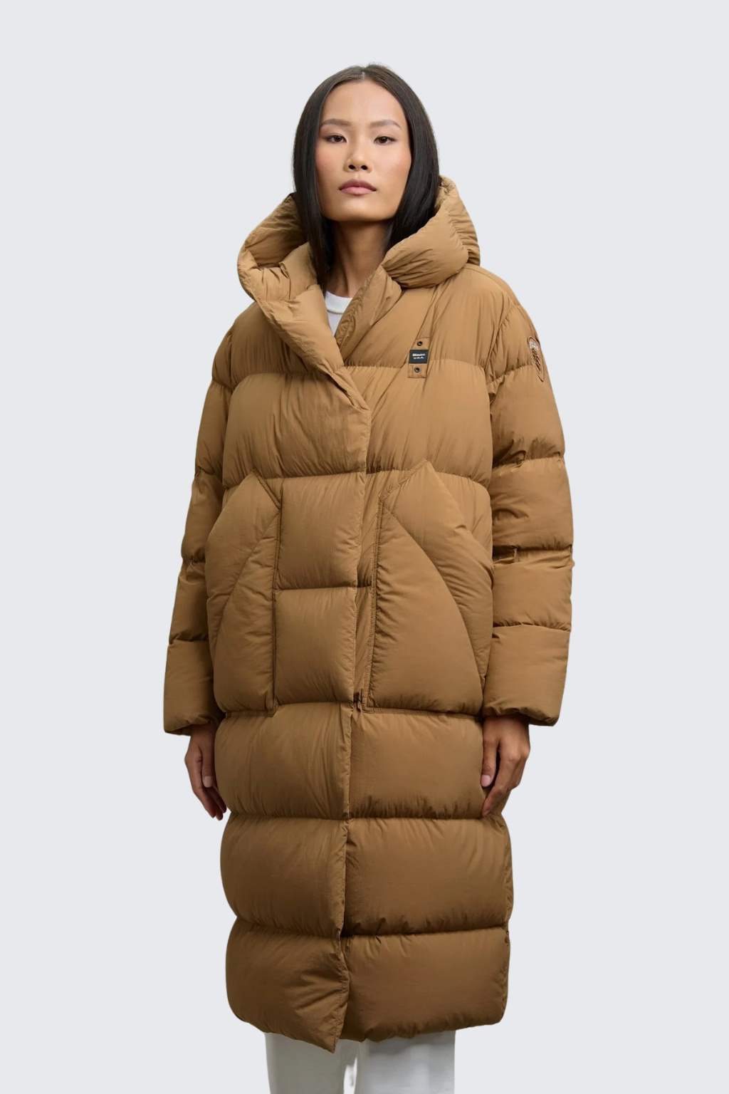Bunda má délku pod kolena, volný střih a šálový límec s kapucí. Zapínání je na skryté magnetky. Bunda má vodorovné prošívání a po stranách jsou dvě velké šikmo střižené kapsy. Na hrudi je logo značky BLAUER, na levém rukávu je typický erb s logem BLAUER. Bunda je plněna peřím a je velice příjemná a teplá.