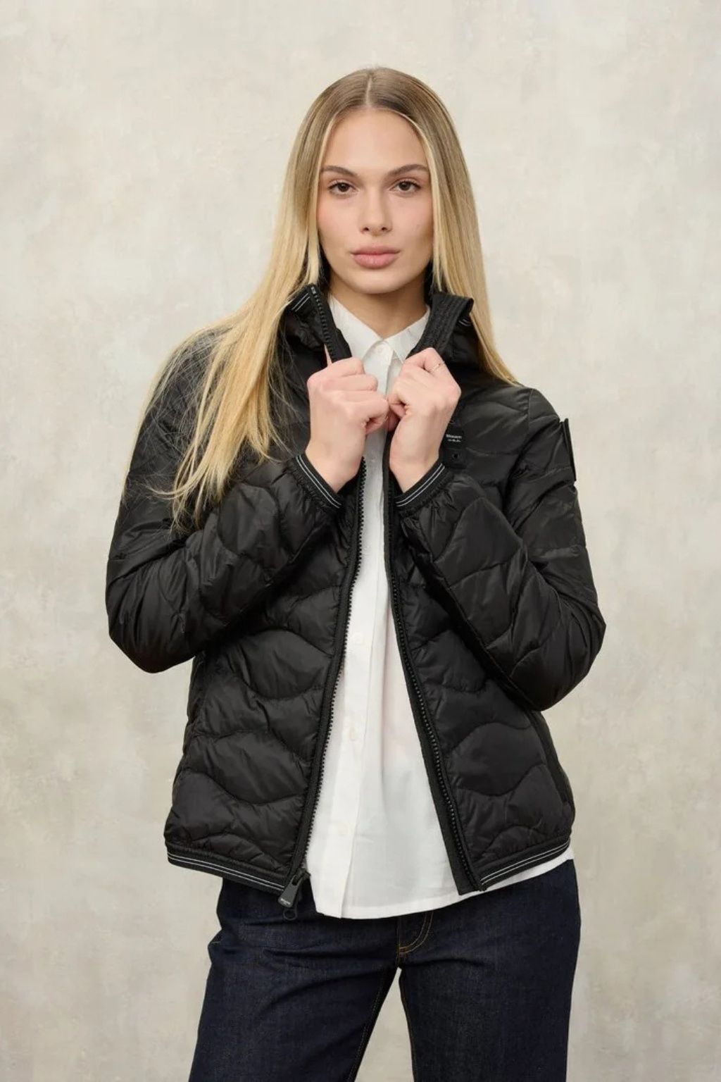 Dámská bunda značky Blauer je vyrobena z jednobarevné, prošívané látky. Má standardní délku a přiléhavý střih. Model má dlouhé rukávy a na koncích rukávů elastický lem. Zapínání bundičky je po celé délce na dvoucestný zip a knoflíky, u krku je lemovaná kapuce. Po stranách jsou dvě kapsy na zip a na hrudi je vlevo doplněný štítek s nápisem značky BLAUER. Na levém rukávu je erb s logem značky.