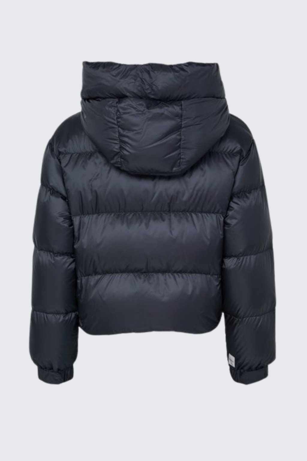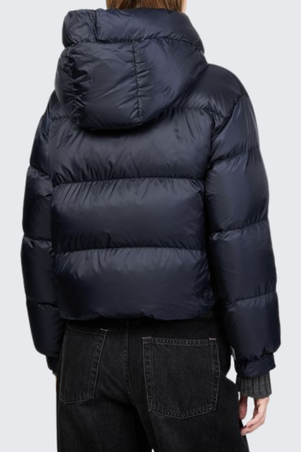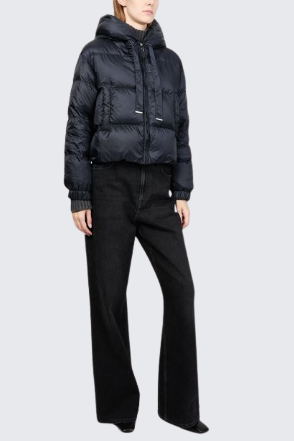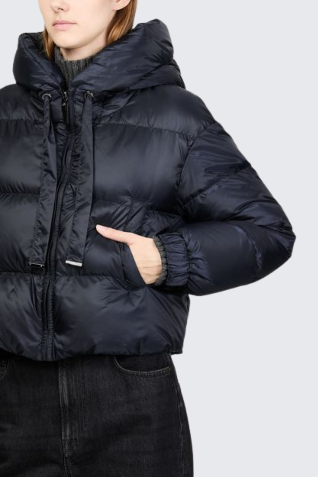 Dámská prošívaná péřová bunda značky MaxMara má zkrácenou délku, kapuci se stahovací šňůrkou a dlouhé rukávy s elastickým lemem na koncích. Model má vodorovné prošívání a dvě boční lemované kapsy. Zapínání je po celé délce na zip, výplň bundy je z husího peří.