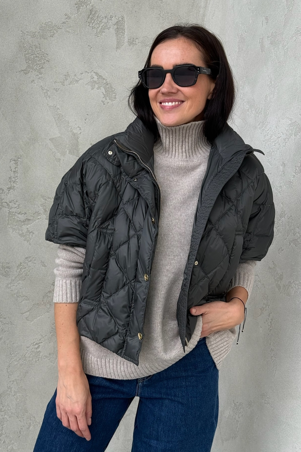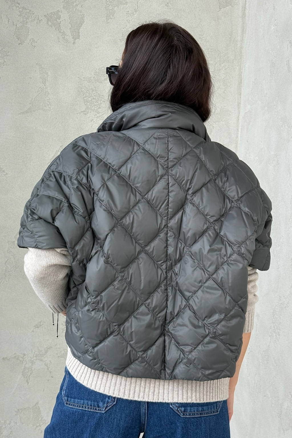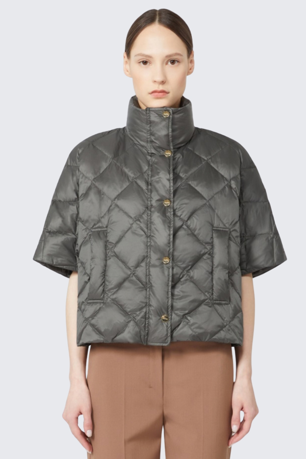 Dámská prošívaná bunda značky Max Mara je s vysokým límcem, zkrácené délky a s krátkými rukávy. Zapíná se na patentky, na kterých je doplněno personalizované logo značky MaxMara, má také skryté zapínání na zip. Bunda je vodoodpudivá a kostkovaně prošívaná. Výplň je z husího peří.