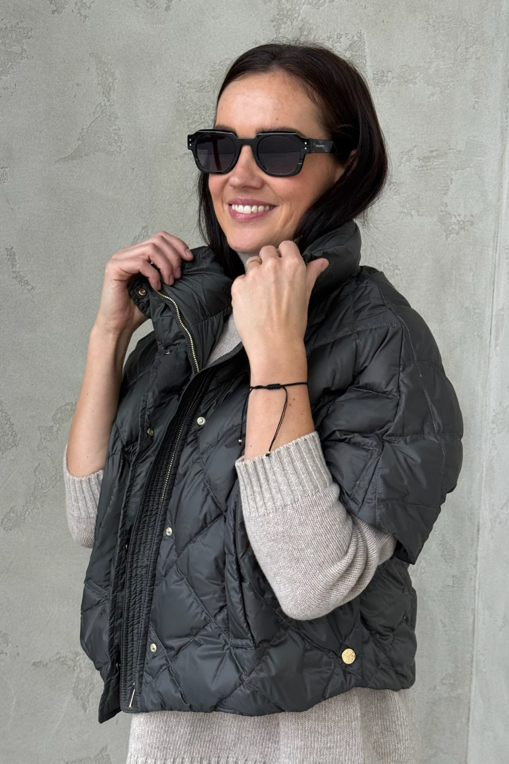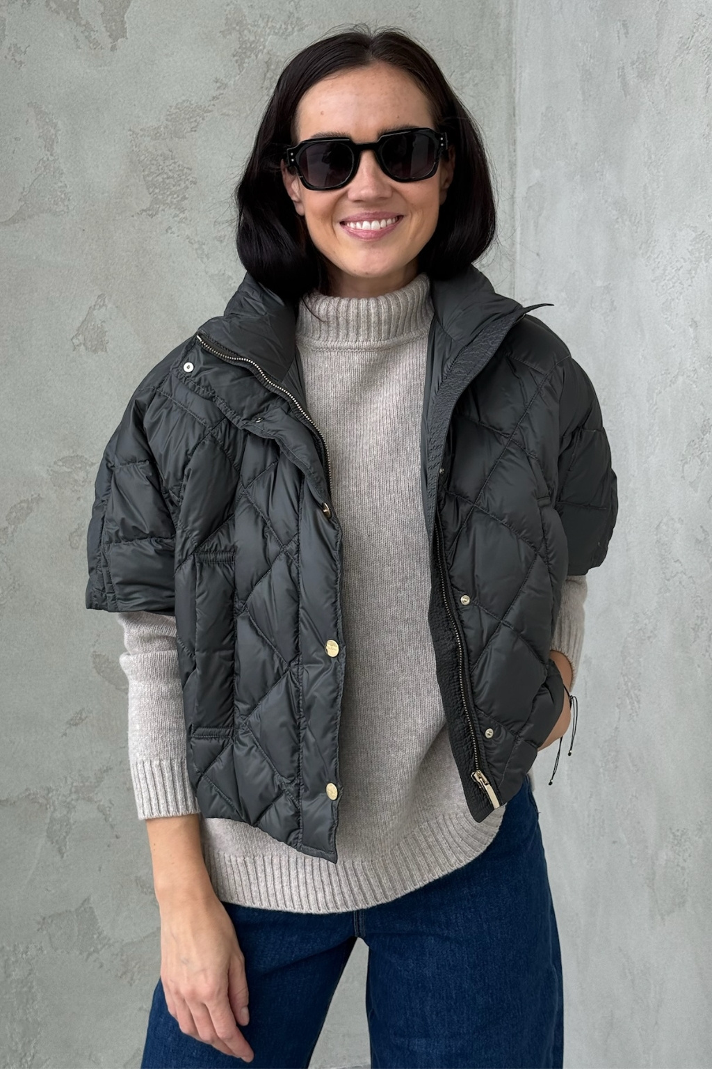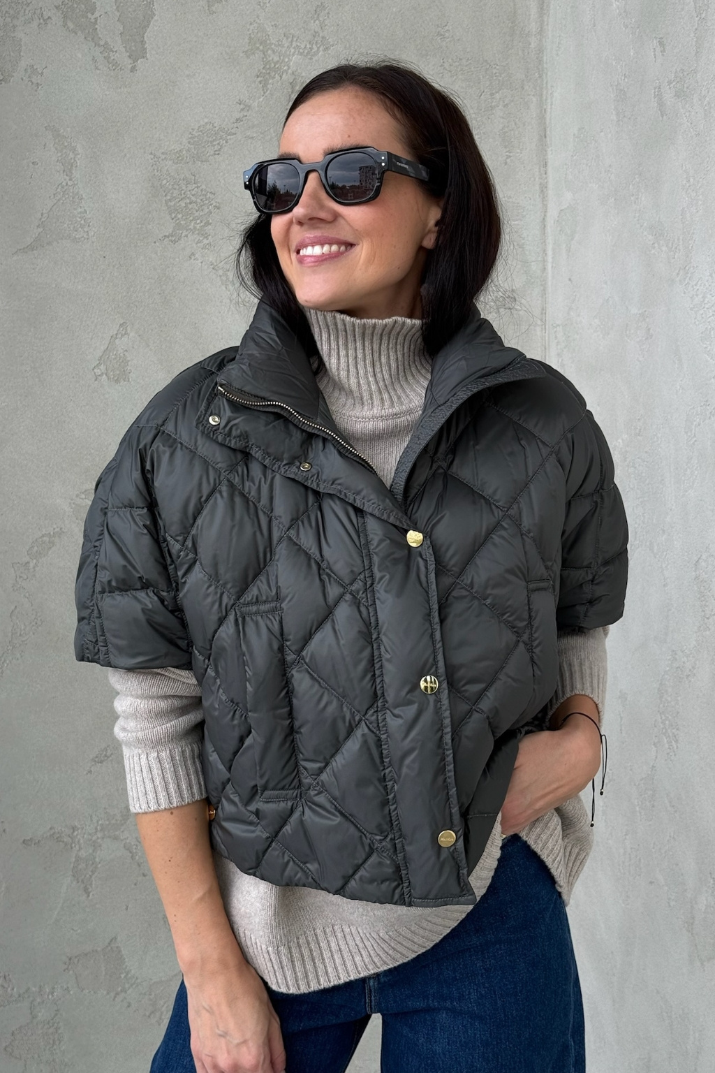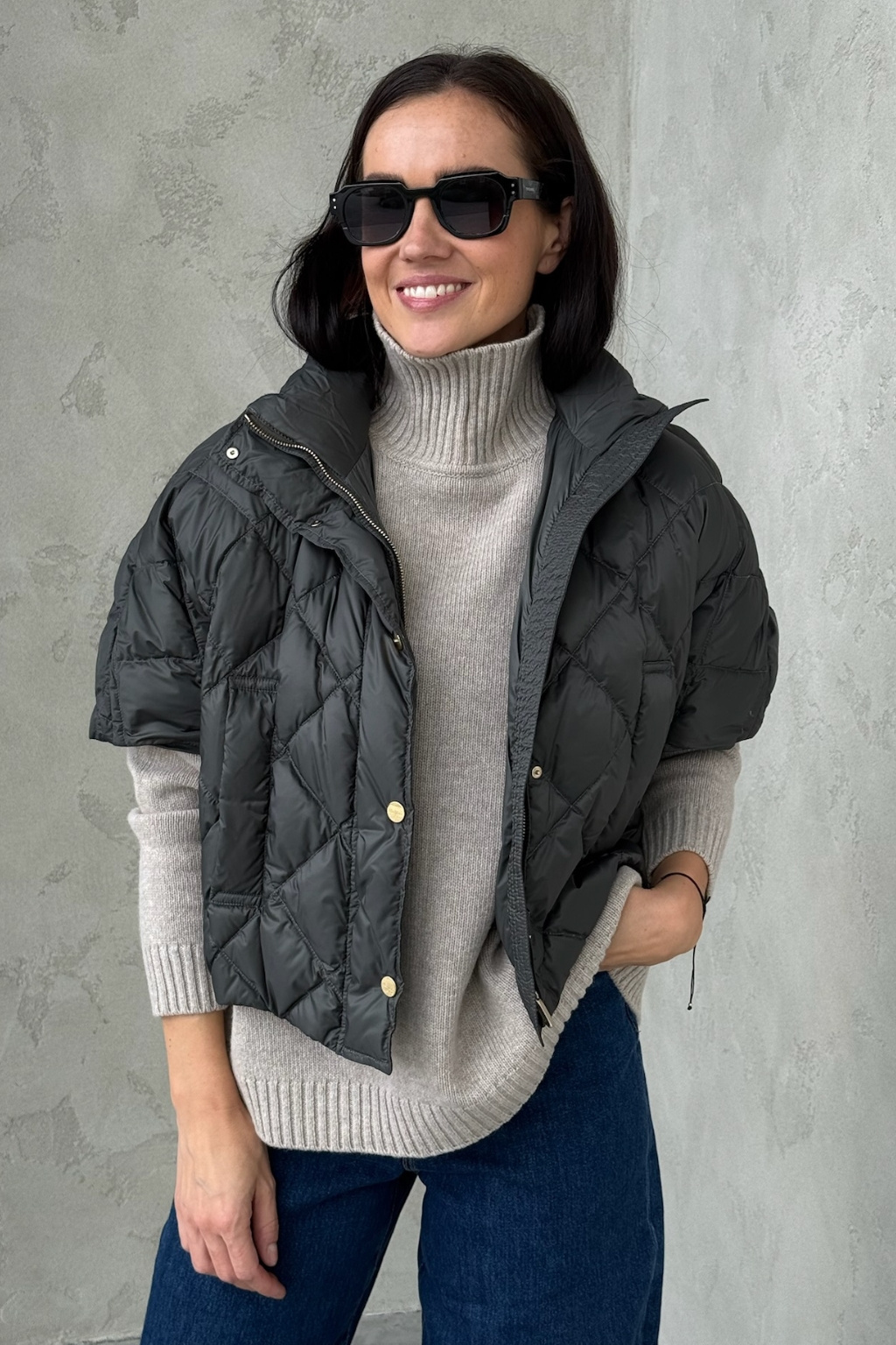 Dámská prošívaná bunda značky Max Mara je s vysokým límcem, zkrácené délky a s krátkými rukávy. Zapíná se na patentky, na kterých je doplněno personalizované logo značky MaxMara, má také skryté zapínání na zip. Bunda je vodoodpudivá a kostkovaně prošívaná. Výplň je z husího peří.
