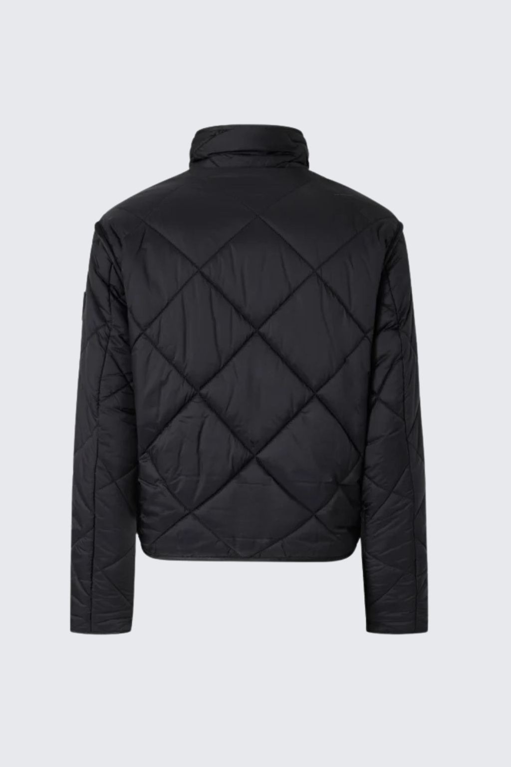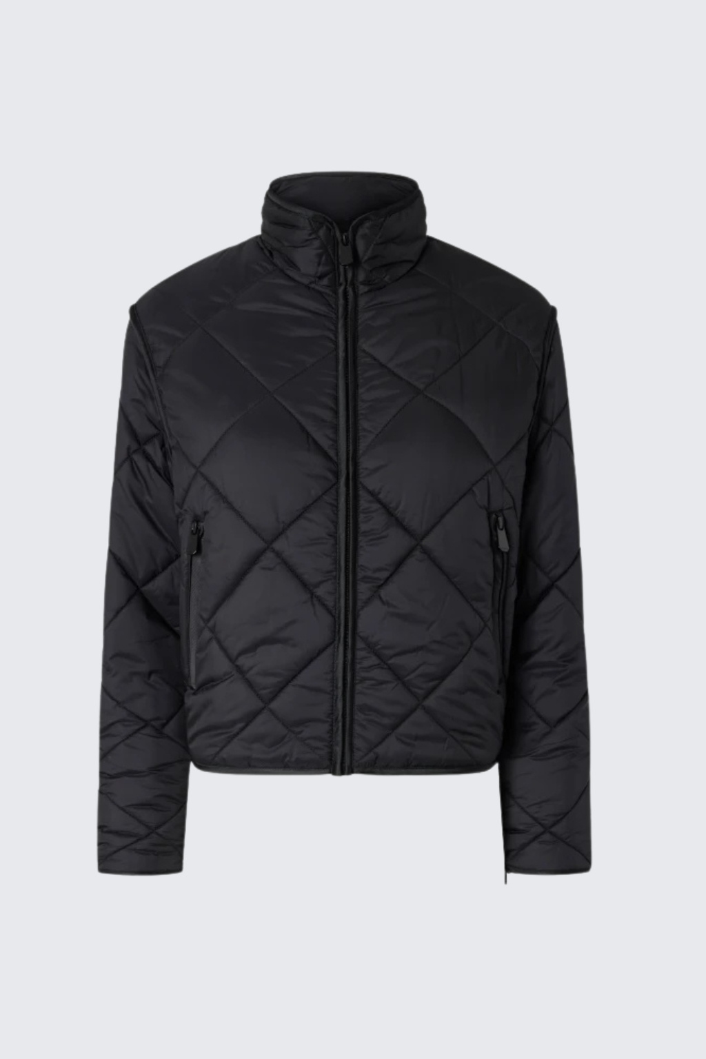 Dámská lehce prošívaná bunda značky PINKO je vyrobená z technické látky s výraznou pololesklou úpravou. Tento model má vysoký límec, zapínání po celé délce na zip a po stranách má svislé lemované kapsy na zip. Na koncích rukávů je krátké zapínání.