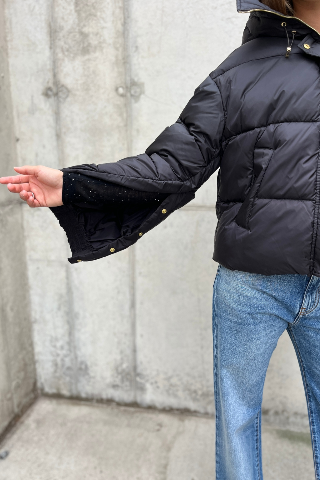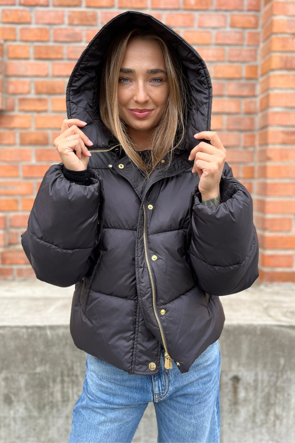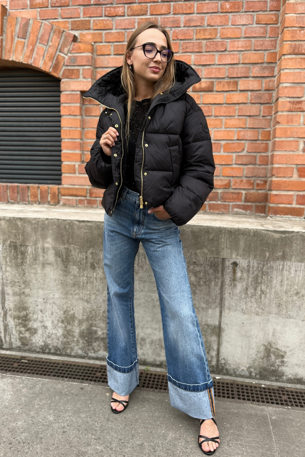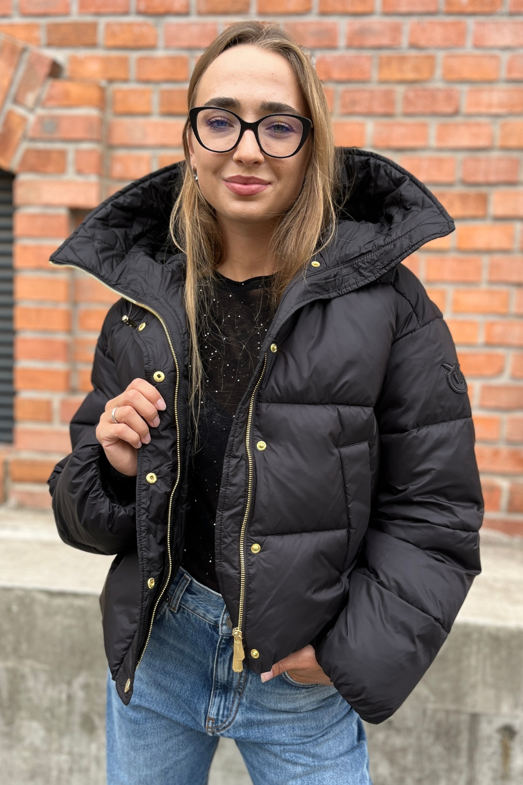 Dámská bunda značky PINKO je vyrobená z prošívané tkaniny. Model má velkou kapuci se stahovací gumičkou, zapínání je na zip ke krku a druky po celé délce. Bunda má sníženou linii ramen a vodorovné prošívání. Po stranách jsou dvě šikmostřižené, průhmatové kapsy. Konce rukávů jsou s krátkým rozparkem na druky pro individuální nastavení. Vespod rukávů je elastická guma. Barva je tmavě hnědá do černa.