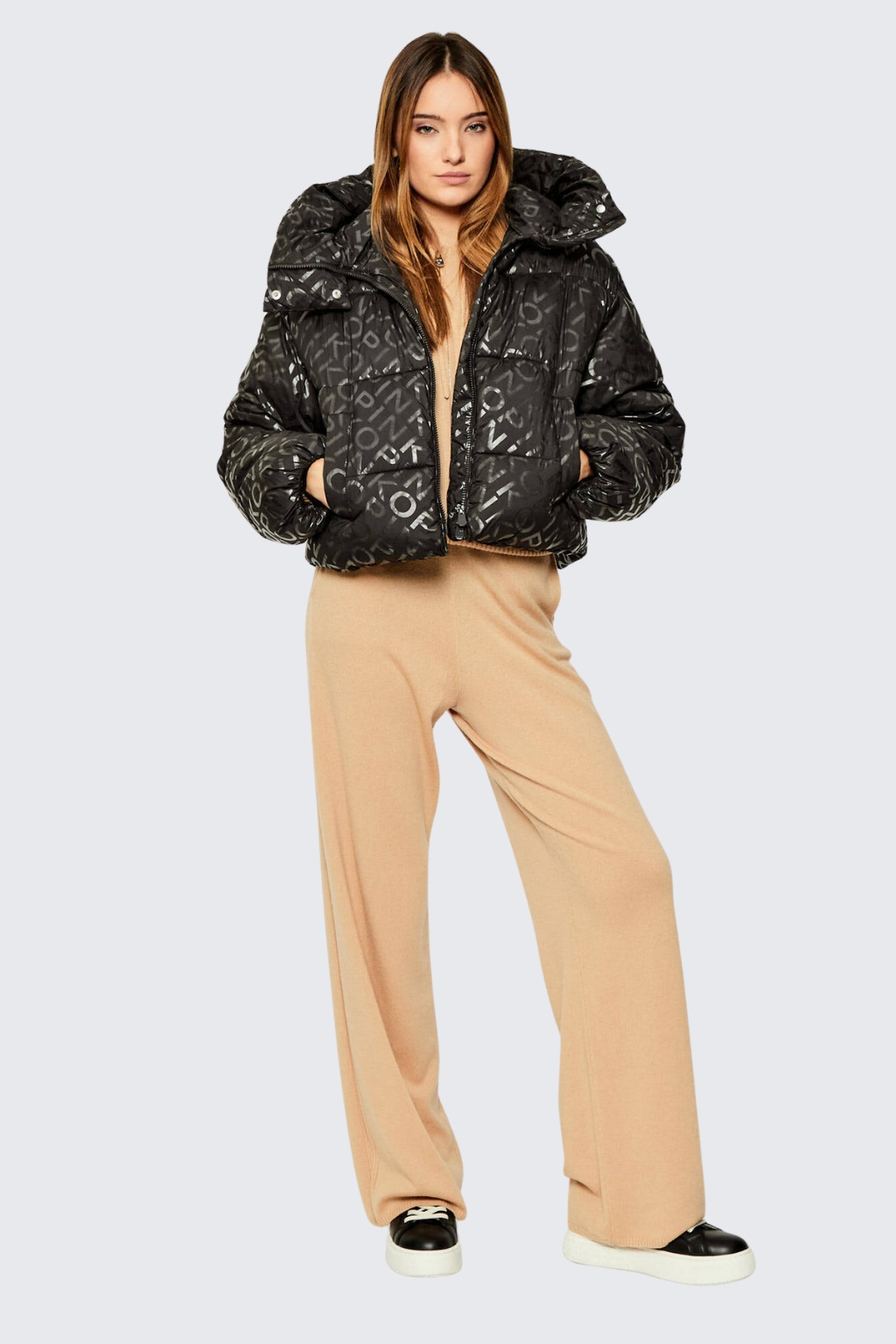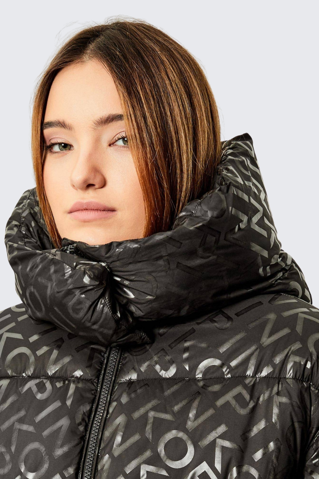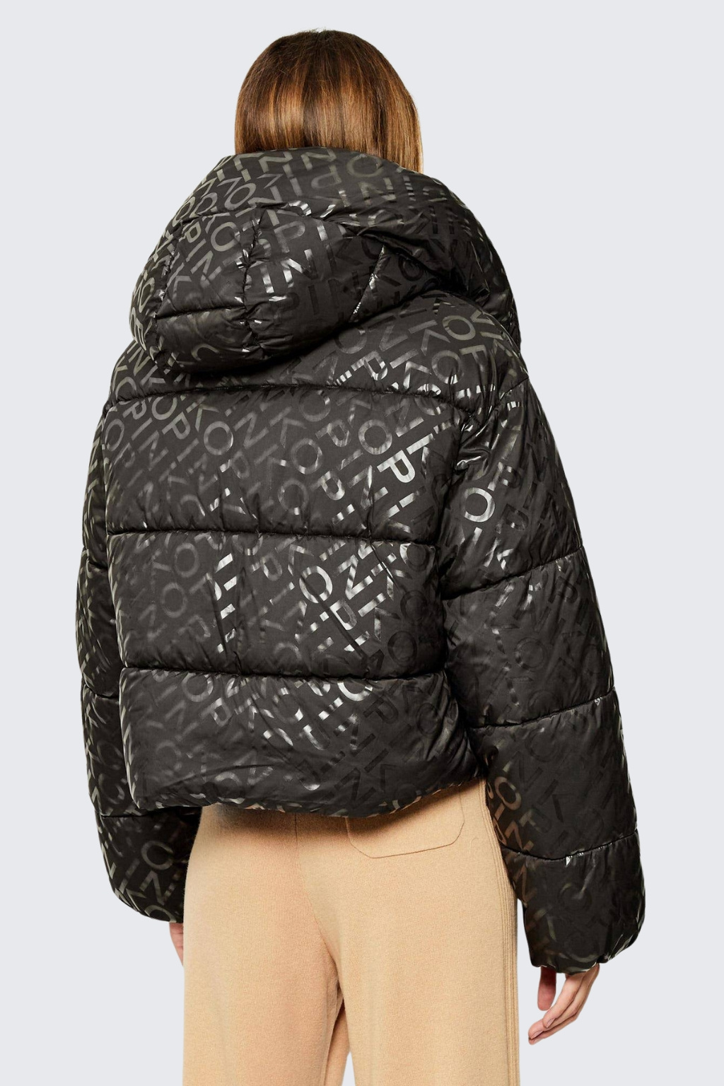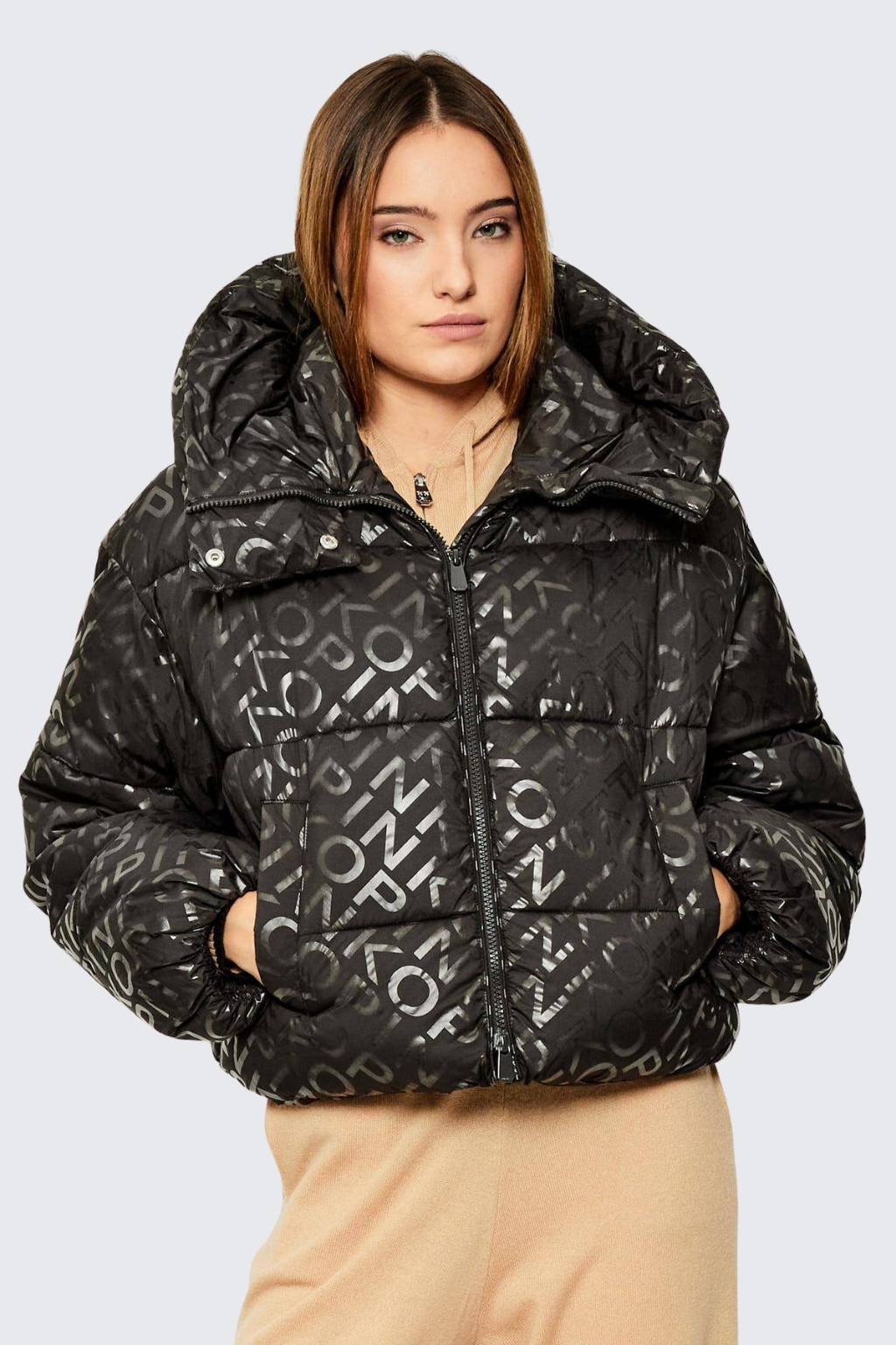 Dámská bunda značky PINKO má rovný střih se zkrácenou délkou a dlouhými rukávy. Bunda má vysoký límec a kapuci, zapínání je na dvoucestný zip a u krku má druky. Bundička má vodorovné prošívání a je vzorovaná lesklým nápisem značky PINKO. Po stranách modelu jsou dvě svislé průhmatové kapsy.