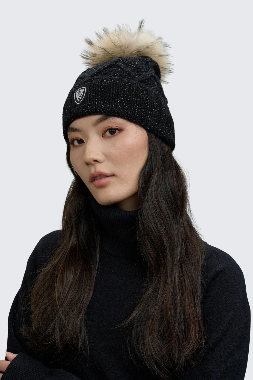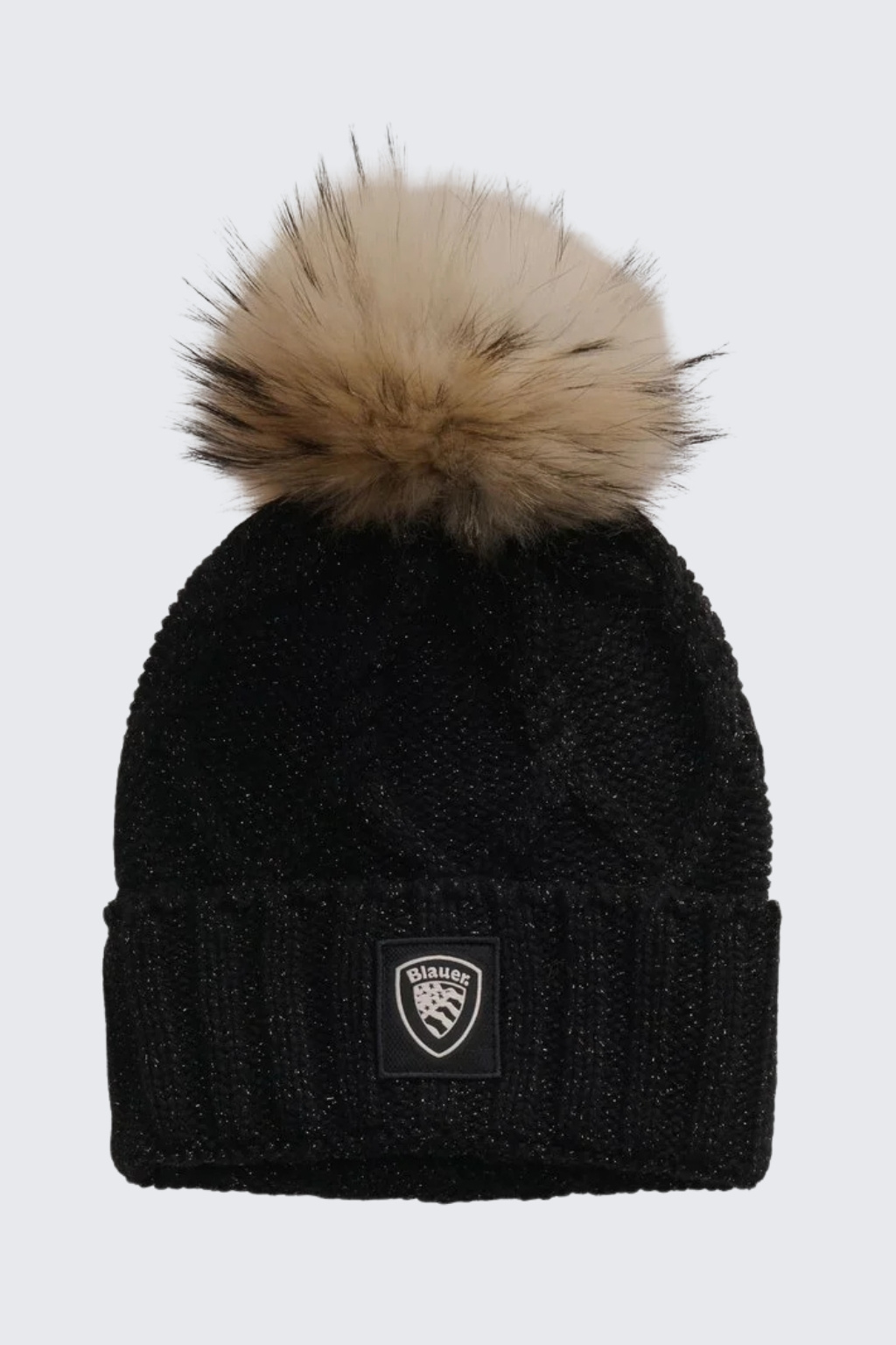 Dámská úpletová zimní čepice značky BLAUER má copánkový vzor, třpytky a střapatou kontrastní bambuli. Model má vespod širokou manžetu s nášivkou loga značky BLAUER.