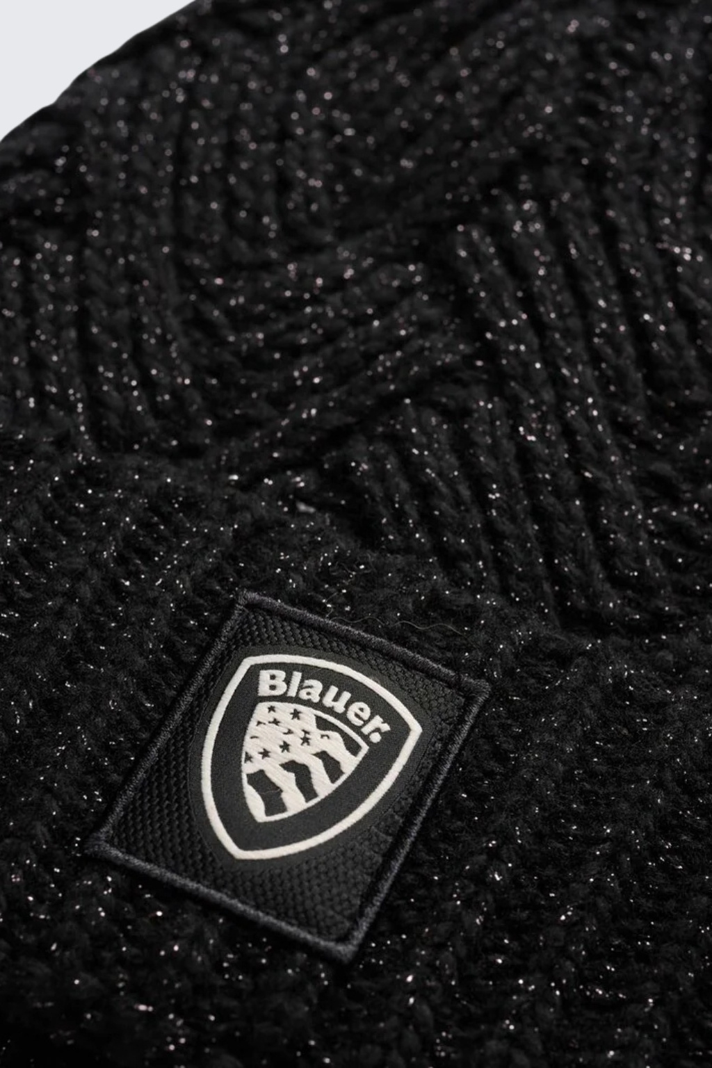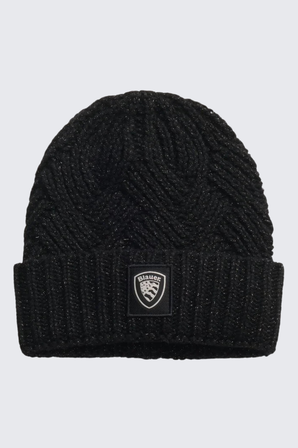 Dámská úpletová zimní čepice značky BLAUER má copánkový vzor, třpytky a je vyrobena ze směsi vlny a kašmíru. Model má vespod širokou manžetu s nášivkou loga značky BLAUER.