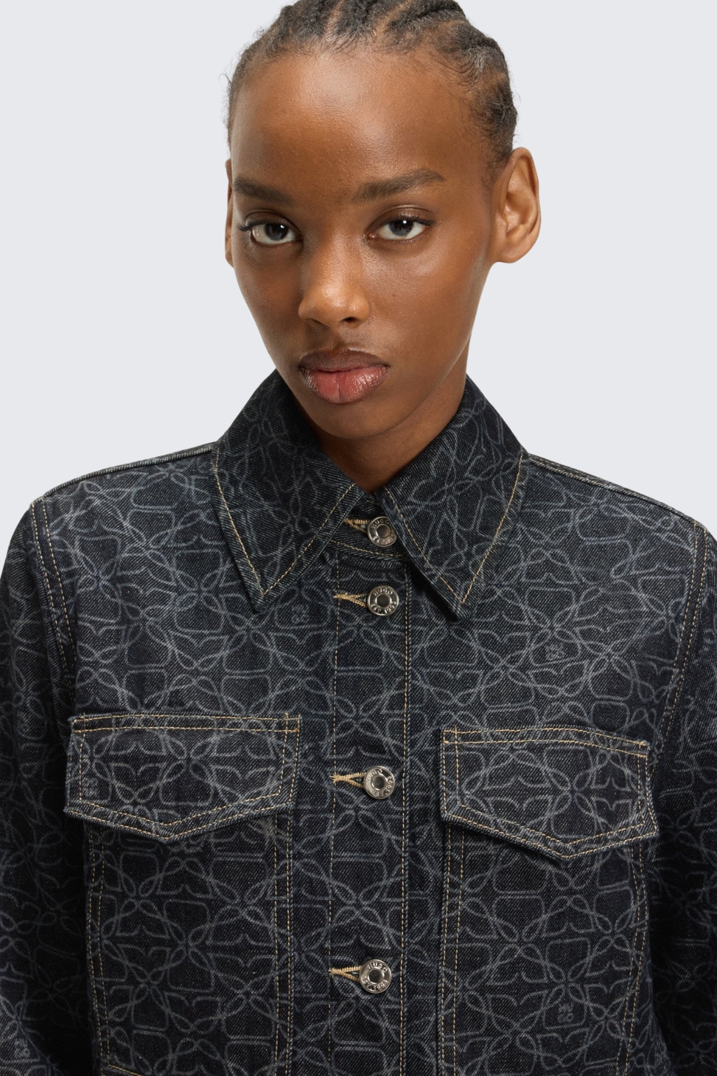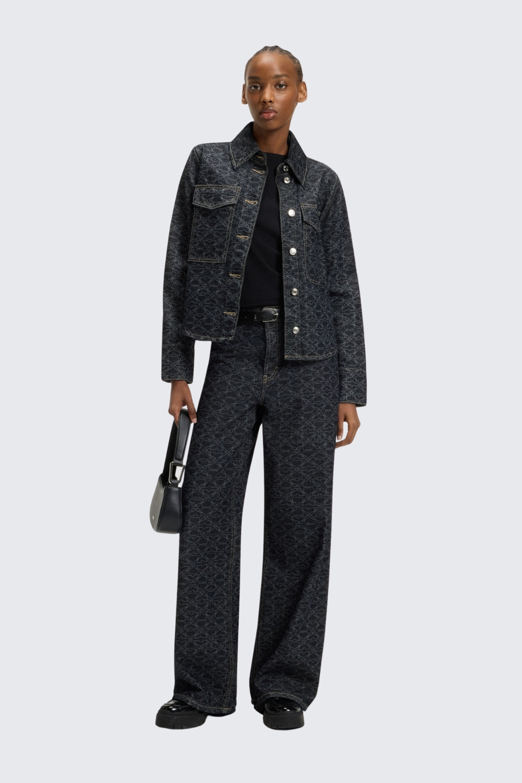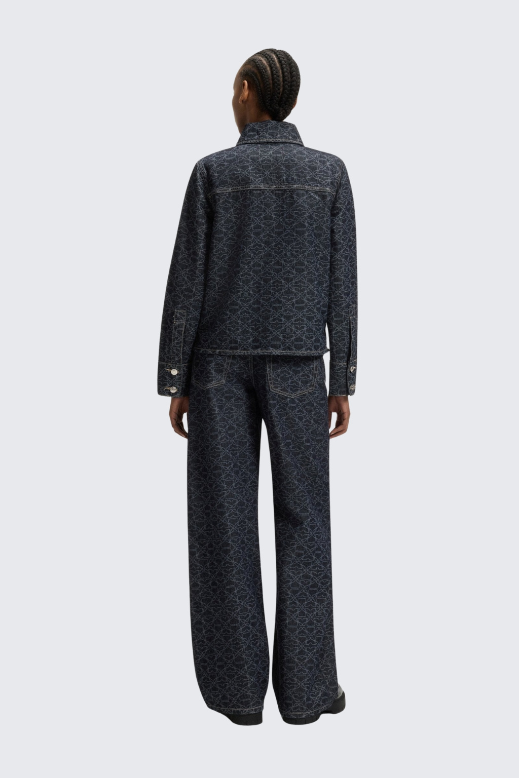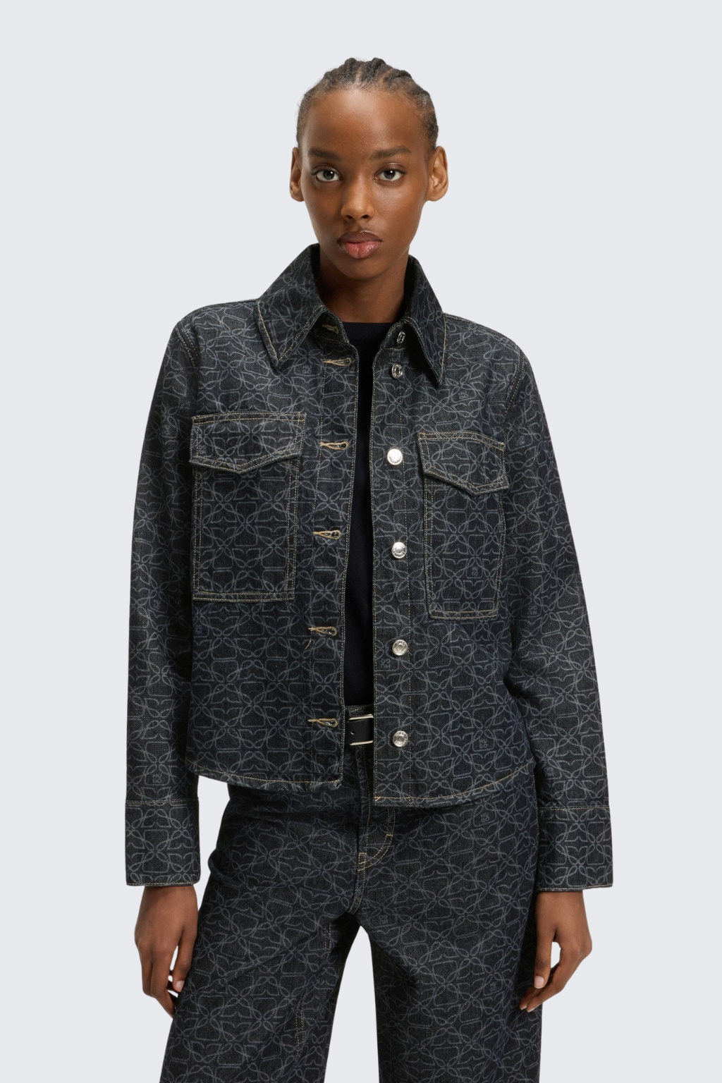 Dámská bunda značky HUGO je nezateplená a vyrobena z bavlněného vzorovaného denimu. Bunda má jednoduchý, rovný střih s dlouhým rukávem. Model má klasický, košilový límeček a zapínání po celé délce na knoflíky. Má dvě náprsní kapsy s klopami a rukávy jsou zakončeny knoflíky.