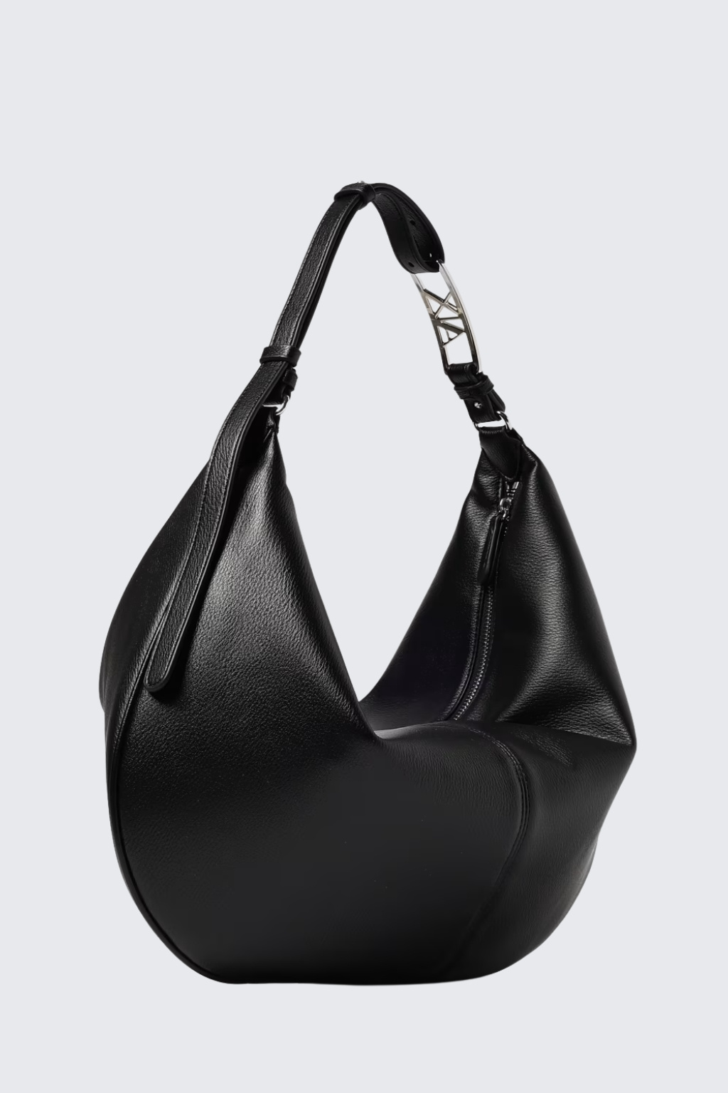 Dámská kabelka značky Armani Exchange je vyrobená z hladké, syntetické kůže. Model má nastavitelné ucho, na kterém je přezka s logem značky AX. Kabelka má půlměsícový tvar a zapínání na zip. Na přední straně je nášivka s logem značky Armani Exchange.